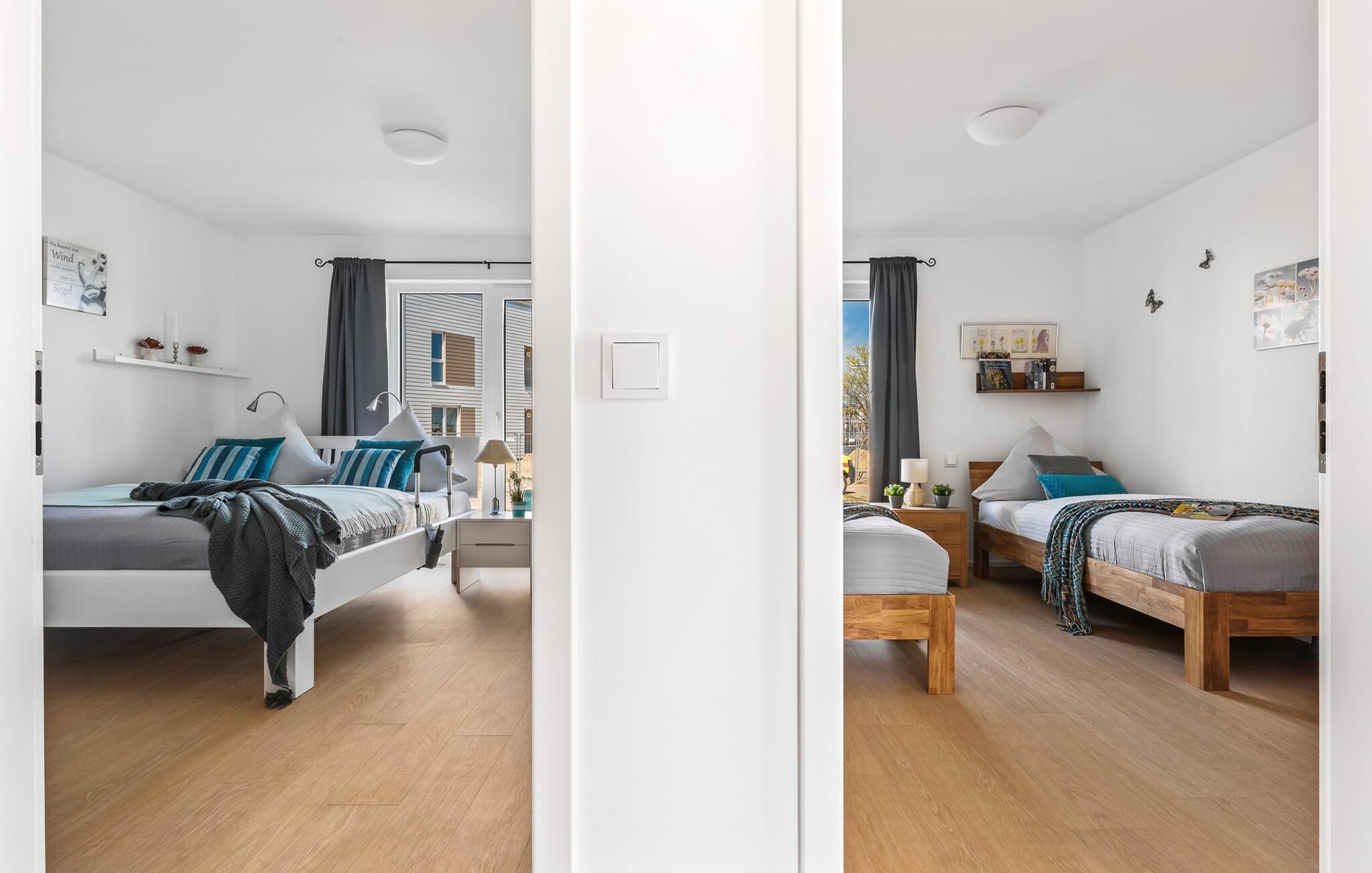 Fu¨r die nächtliche Erholung stehen zwei Schlafzimmer mit komfortablen Betten bereit. Das erste Schlafzimmer ist mit einem Doppelbett mit bequemer Einstiegshöhe und einzeln elektrisch verstellbaren Lattenrosten ausgestattet, während das zweite Schlafzimmer mit zwei Einzelbetten (90 x 200 cm) zu erholsamen Nächten einlädt. Eines hiervon verfügt über einen Aufrichter und ist durch einen motorisierten Rahmen höhenverstellbar. Zwei weitere Schlafplätze bietet das Schlafsofa im Wohnbereich.