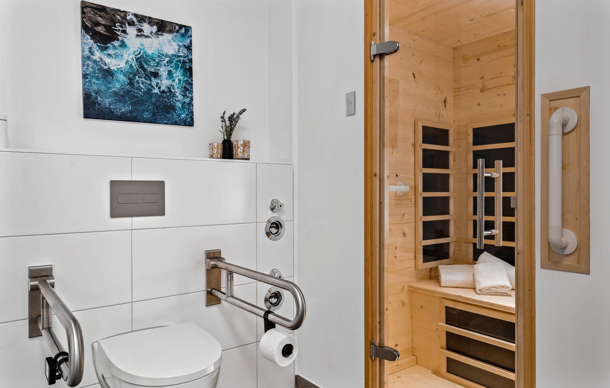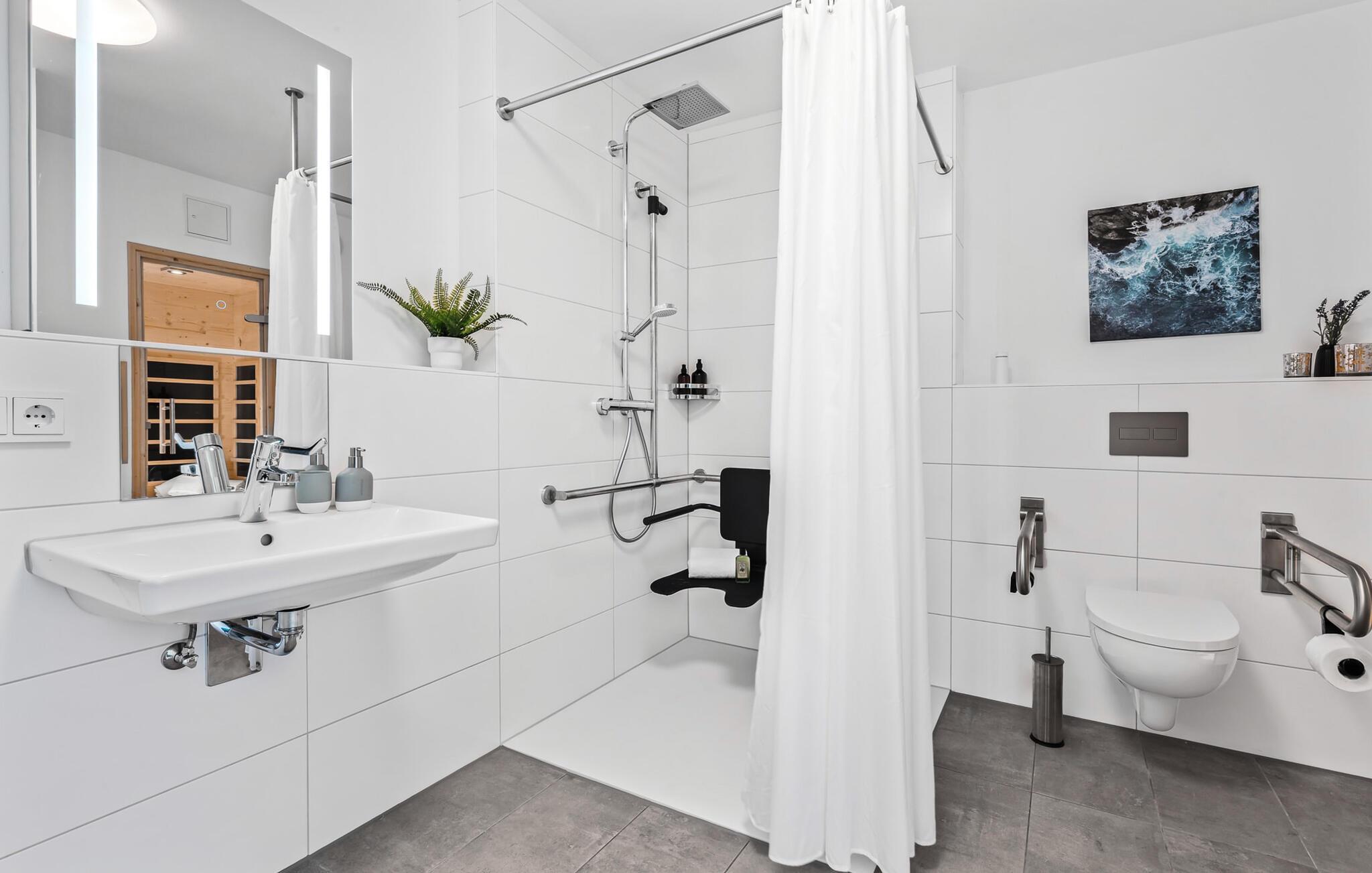 Das Duschbad bietet eine bodengleiche Dusche mit Reling über Eck, Duschstuhl und Extrastange zum Festhalten. Die Toilette ist höher gesetzt, von beiden seiten anfahrbar und mit hochklappbaren Stützgriffen versehen. Auch Waschbecken und Spiegelschrank sind dem/der Rolli-Fahrer/in angepasst. Die Infrarot-Kabine sorgt für eure ganz eigenen Wellnessmomente und hat Innen sowie Außen Haltegriffe.