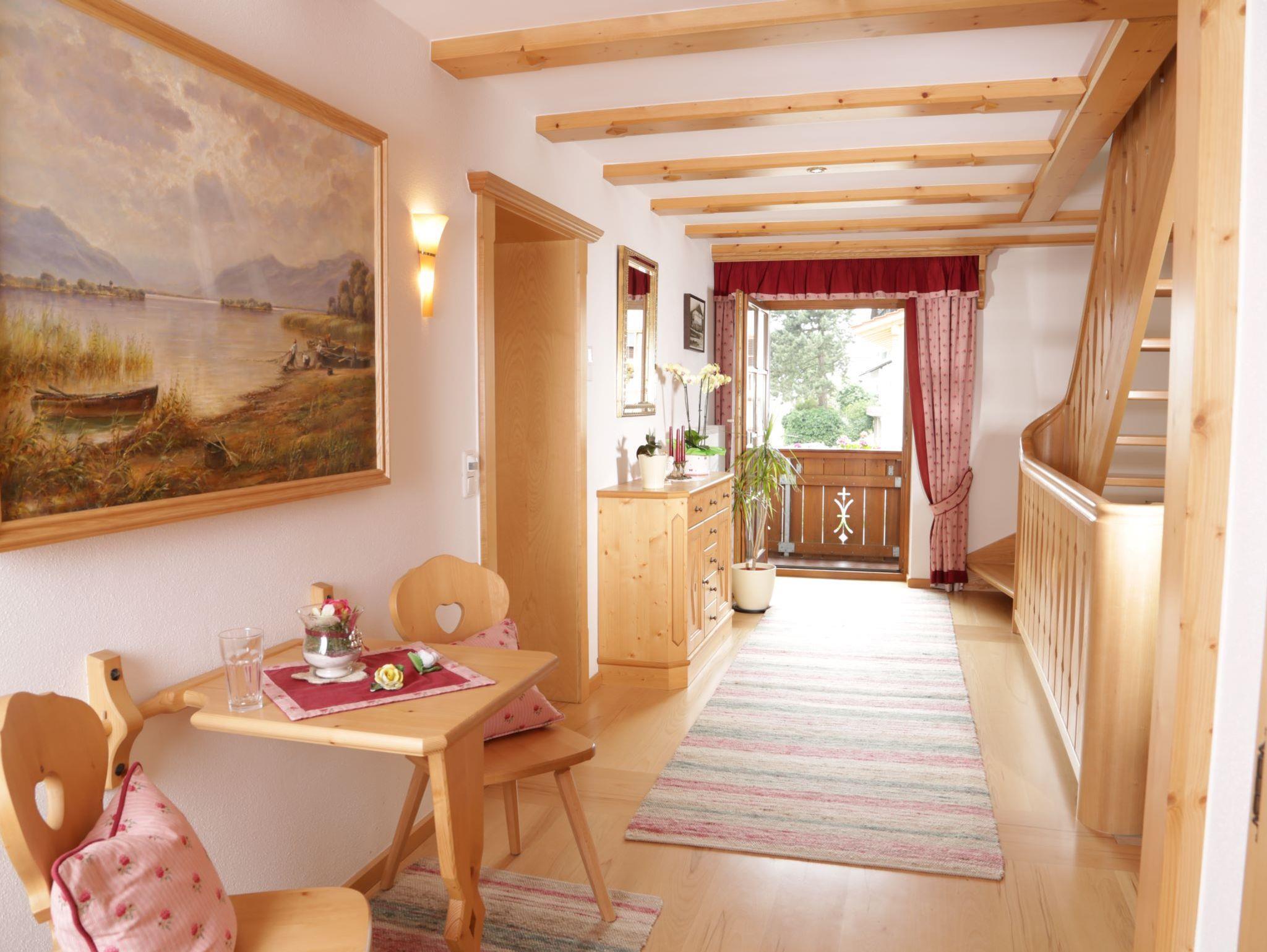 Unser historisch renovierter Bauernhof aus dem Jahr 1598 zählt zu den ältesten Pensionen Deutschlands und liegt in einer der schönsten Urlaubsregionen Bayerns. In der Nähe finden Sie zahlreiche Annehmlichkeiten wie Bäckereien, einen Getränkemarkt, Metzgereien, Restaurants, eine Bushaltestelle, Ärzte und einen Spielplatz. Weitere Einrichtungen wie ein Lebensmittelladen, Discounter, Tankstelle und Apotheke sind ebenfalls fußläufig erreichbar. In unseren Wohnungen und Zimmern stellen wir Handtücher und in den Wohnungen auch Küchentextilien zur Verfügung. Safe, Verbandskasten und Wasserkocher finden Sie im Schrank. Ein Feuerlöscher befindet sich im Flur der Pension. Für Radfahrer bieten wir einen abschließbaren Fahrradraum. In unserem Haus liegen stets Prospekte und Flyer zu Veranstaltungen und Freizeitmöglichkeiten aus. Den aktuellen Busfahrplan erhalten Sie ebenfalls bei uns. Die Chiemgauer und Inntaler Alpen, der Chiemsee sowie die Städte München, Salzburg und Kufstein sind ideale Ziele für Tagesausflüge.