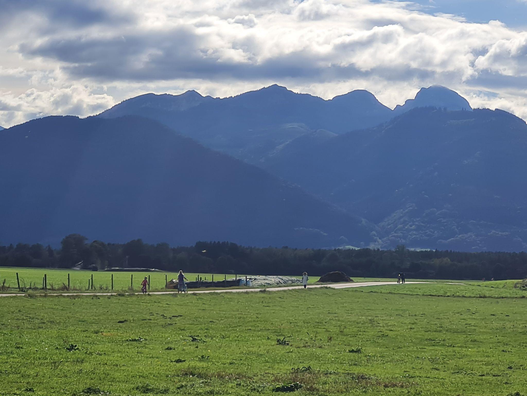 Die Unterkunft ist von Wiesen umgeben. Man hat Aussicht ins Grüne und auf die Berge.