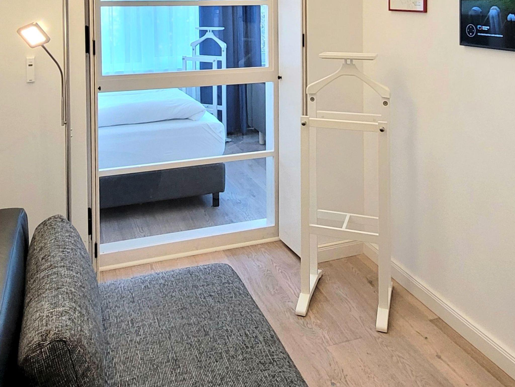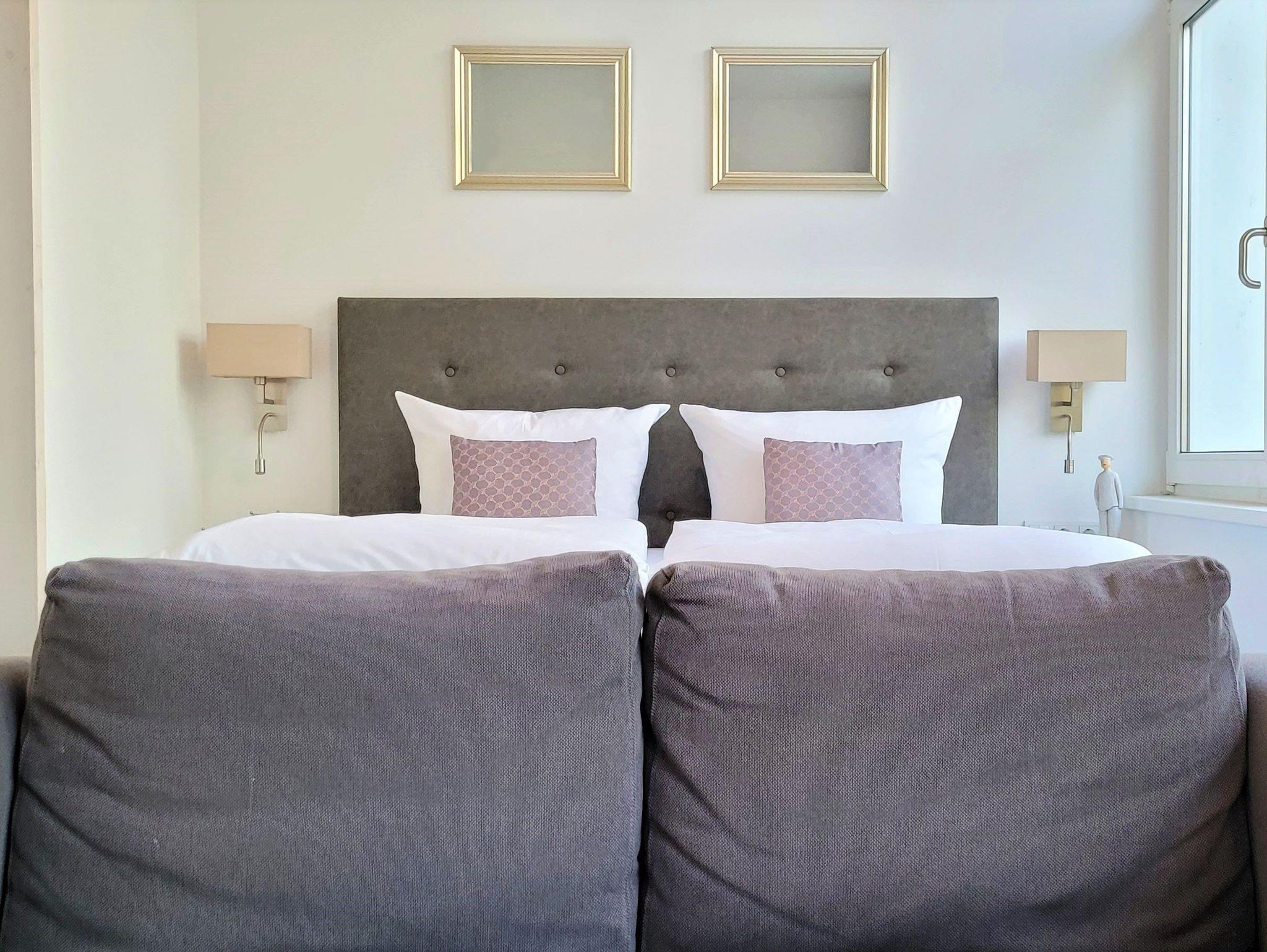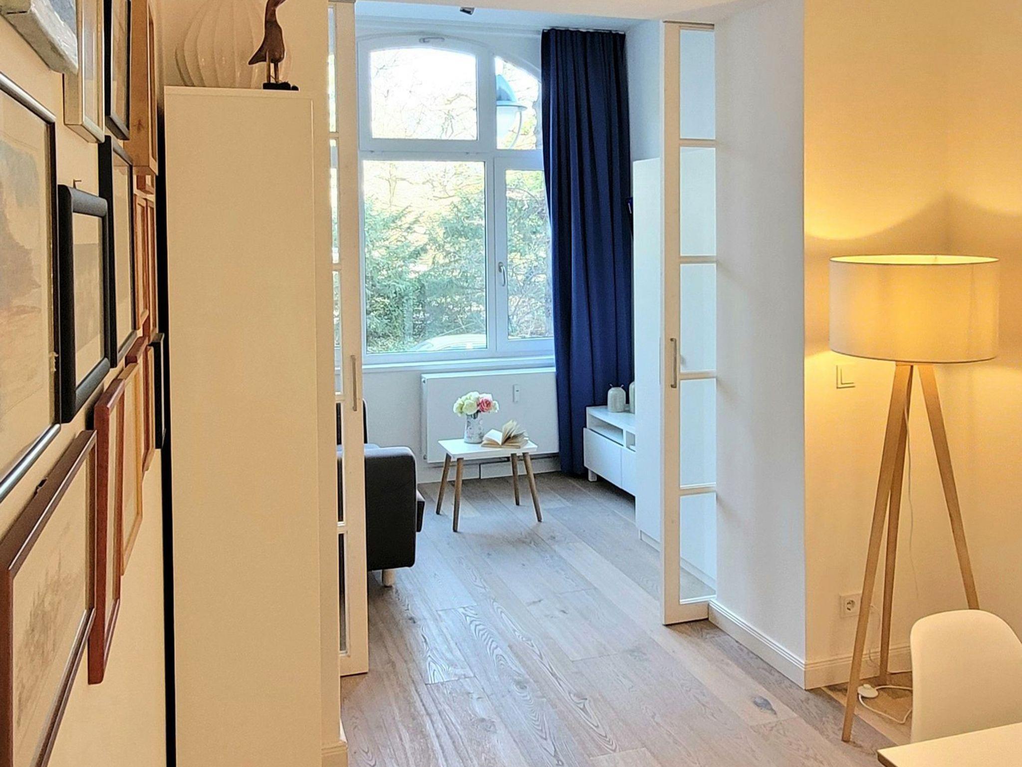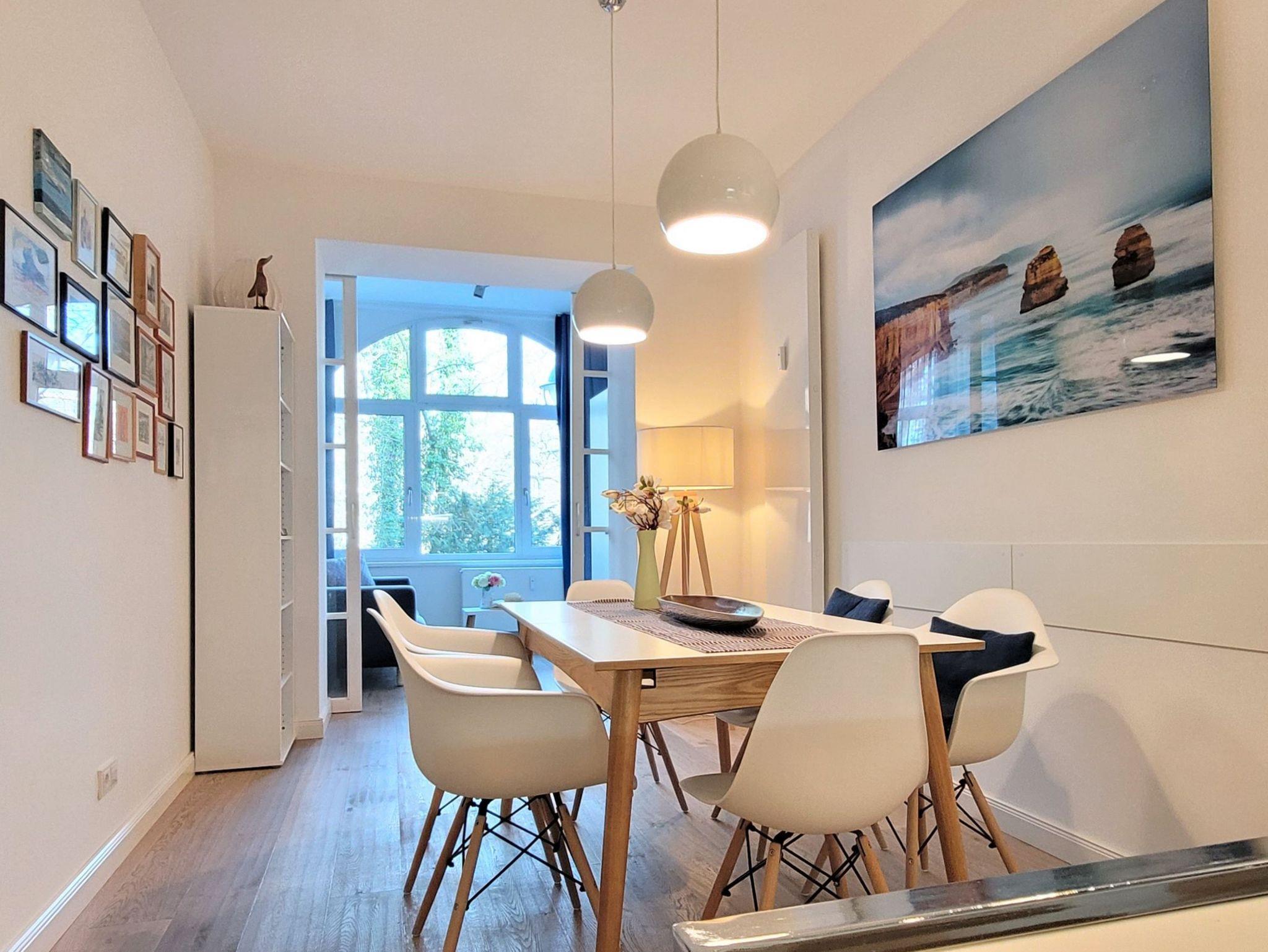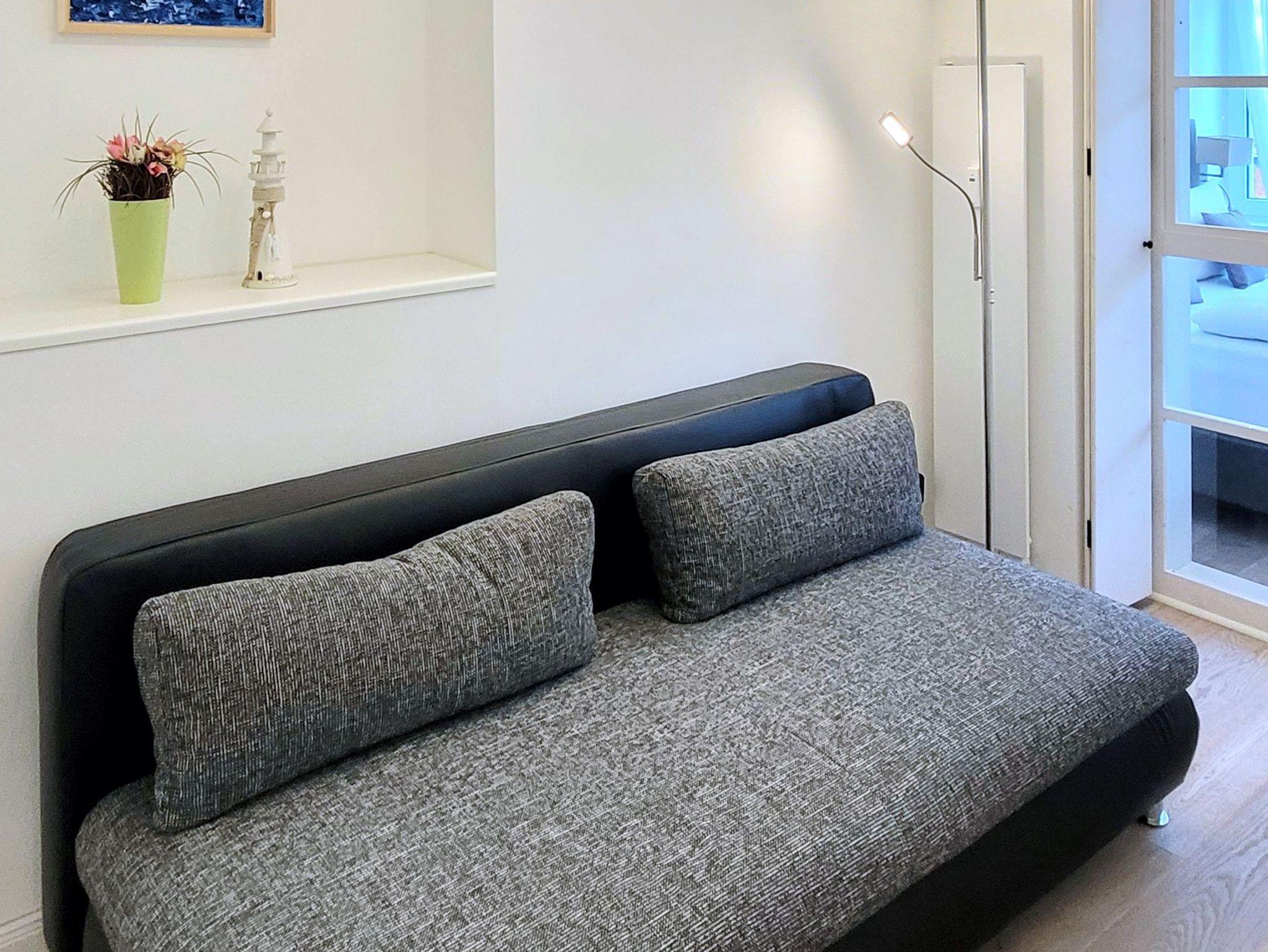 Moderne Ferienwohnung in Warnemünde, nahe Strand und Kurpark, ideal für drei Personen mit WLAN und Küche.
