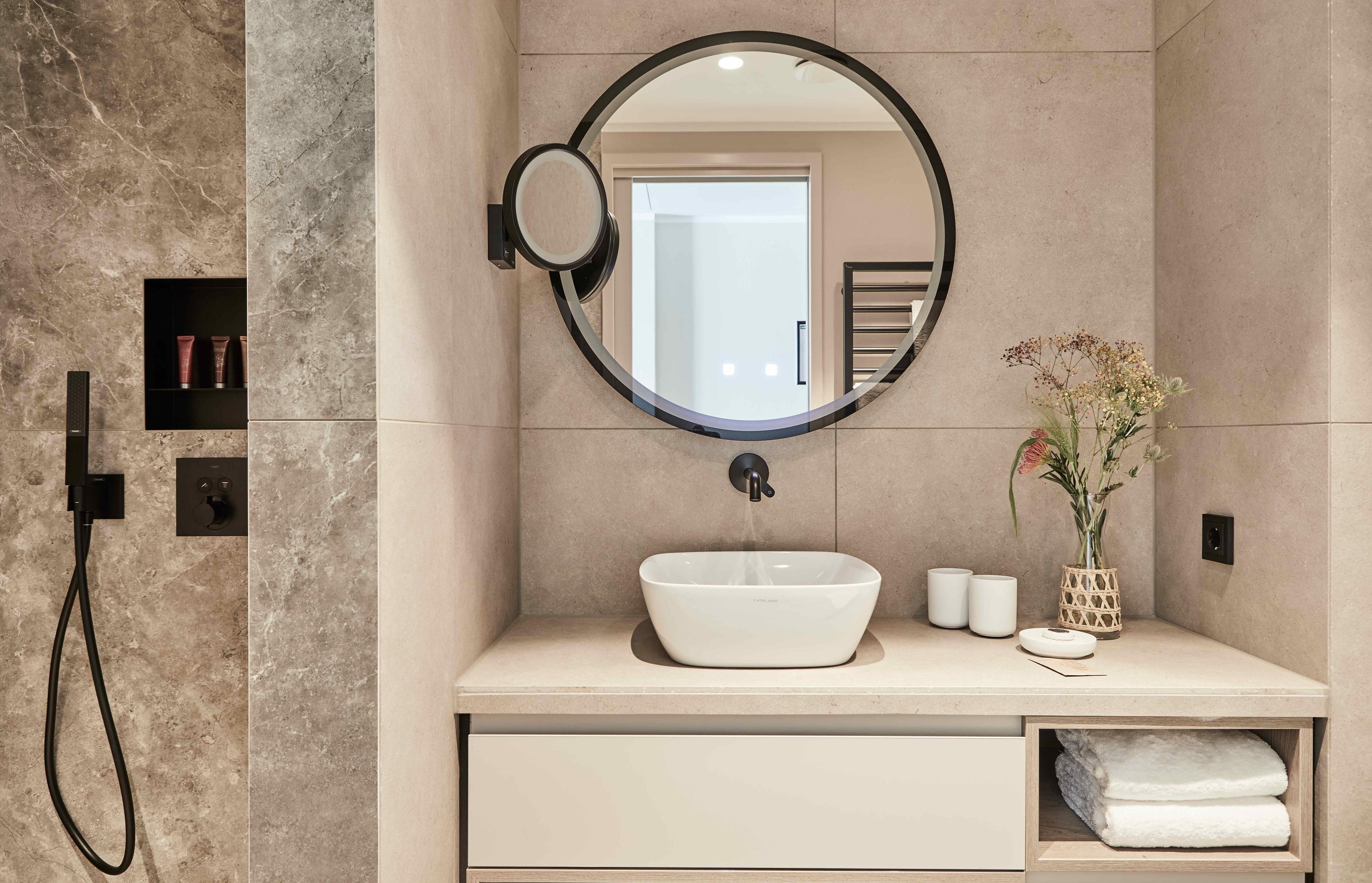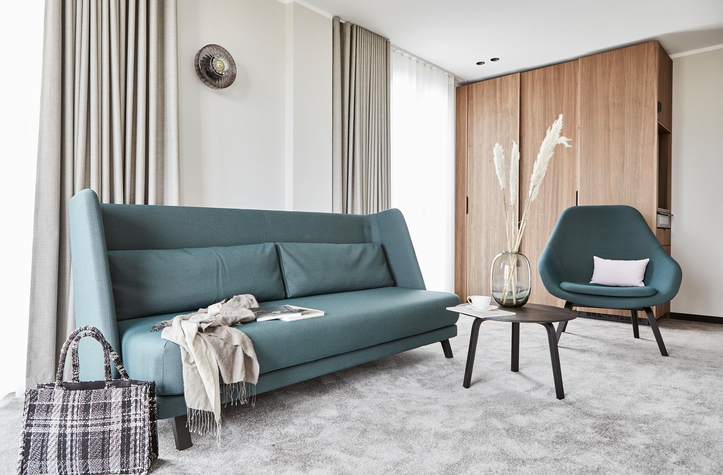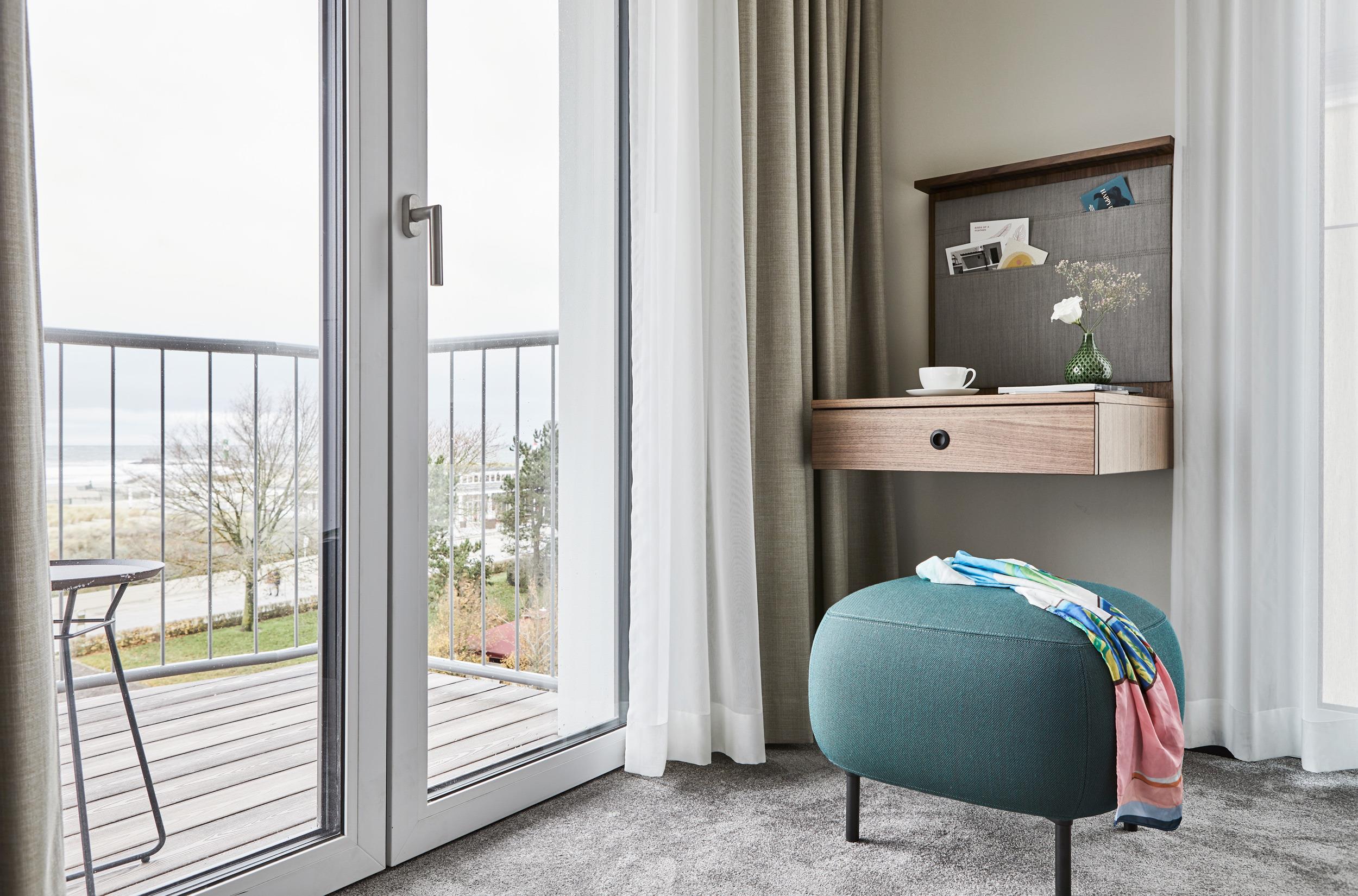 Modernes Doppelzimmer mit Meerblick im Boutique-Hotel direkt am Strand von Warnemünde.
