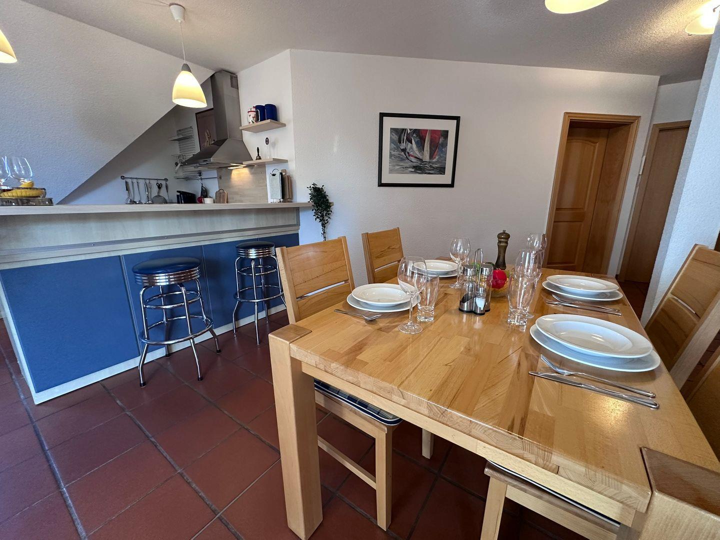 Die Ferienwohnung ist in der ersten Etage und umfasst insgesamt drei Zimmer, darunter zwei gemütliche Schlafzimmer, in denen Ruhe und Erholung garantiert sind. Das stilvolle Wohnzimmer mit Fußbodenheizung, ausgestattet mit einer bequemen Sofaecke, lädt zum Verweilen ein. Ein großer Esstisch bietet genügend Platz für gesellige Abende oder gemeinsames Frühstück. Für Ihre Unterhaltung sind ein 24 bis 42 Zoll großer Fernseher, ein CD-Player und ein Radio vorhanden, die internationale Kanäle empfangen. Zudem stehen Ihnen zahlreiche Bücher, CDs und DVDs zur Verfügung, um Ihren Aufenthalt noch angenehmer zu gestalten.