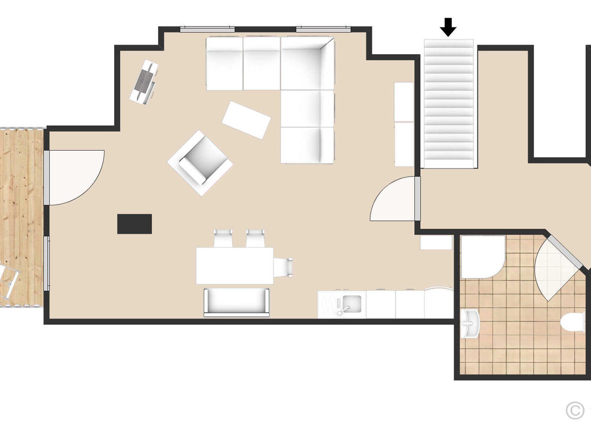 Das grosse Wohnzimmer mit offener Küche (30 qm) und angrenzendem Balkon (20qm) sorgt für eine heimelnde Atmosphäre.