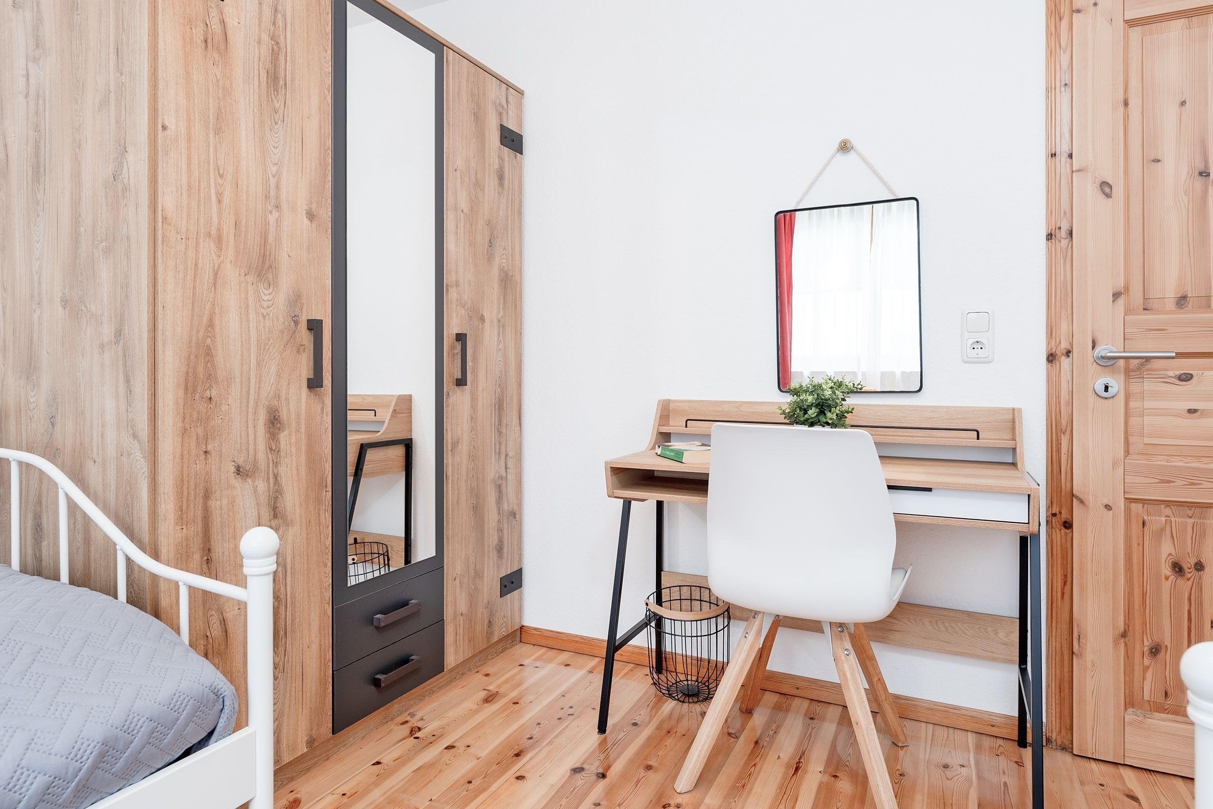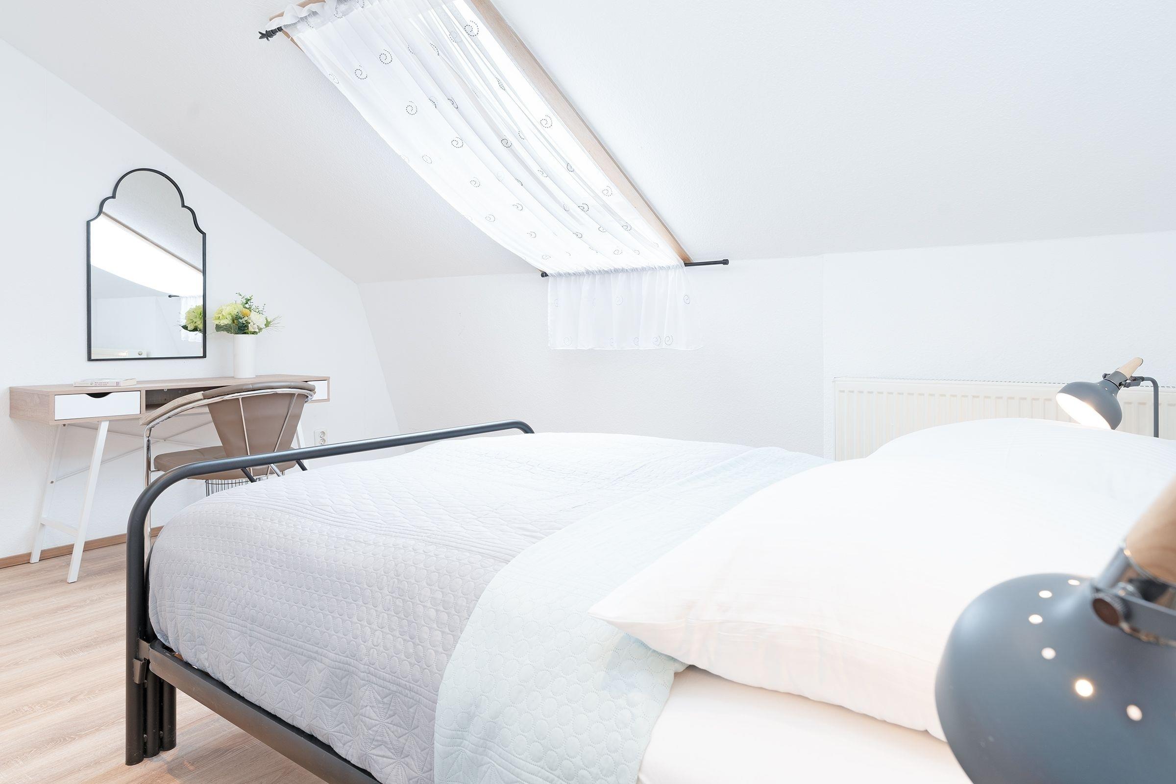 Schlafzimmer 4 im OG: 1 Doppelbett (140x200 cm), Kleiderschrank, Sichtschutz: Jalousie, Platz für Babybett vorhanden