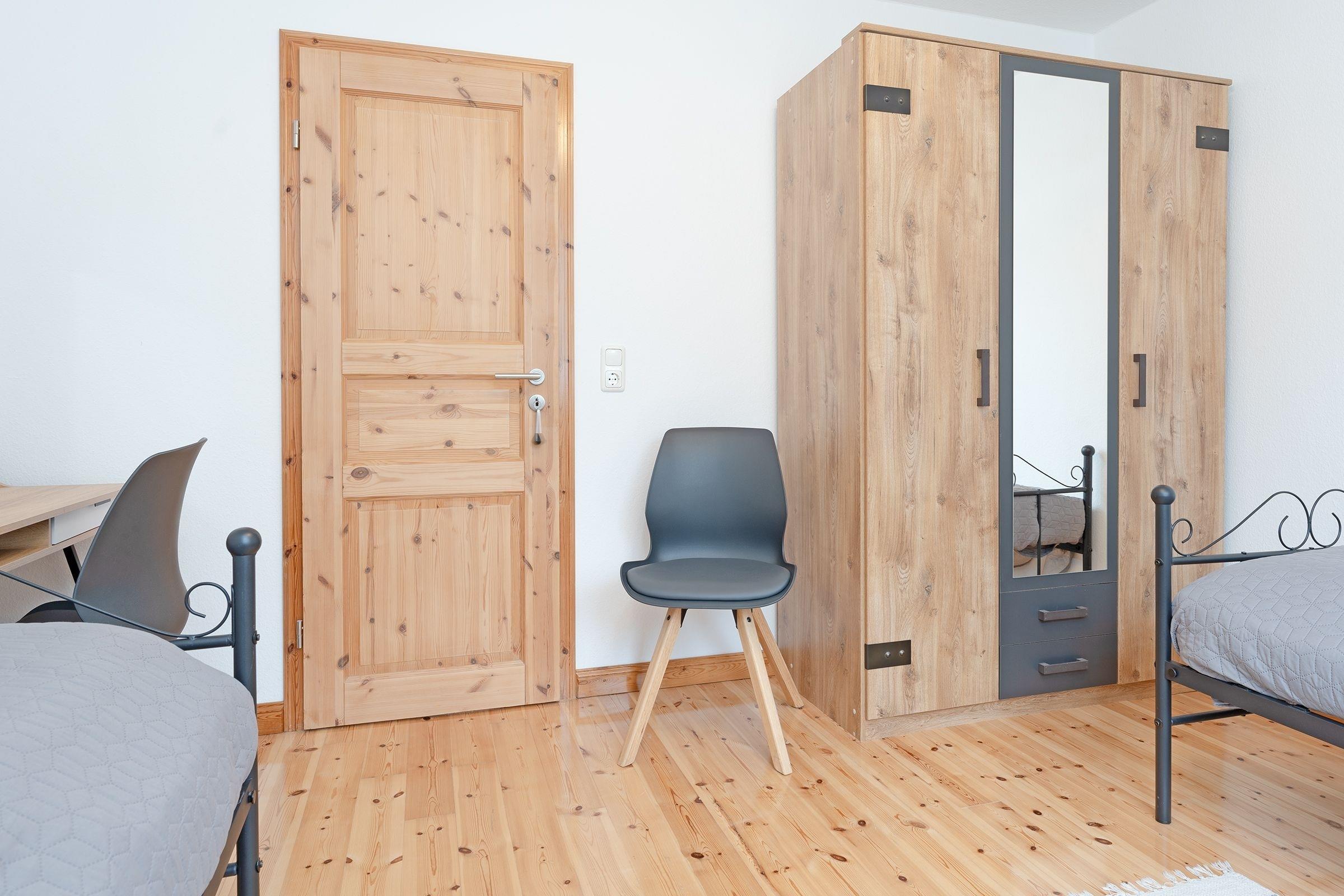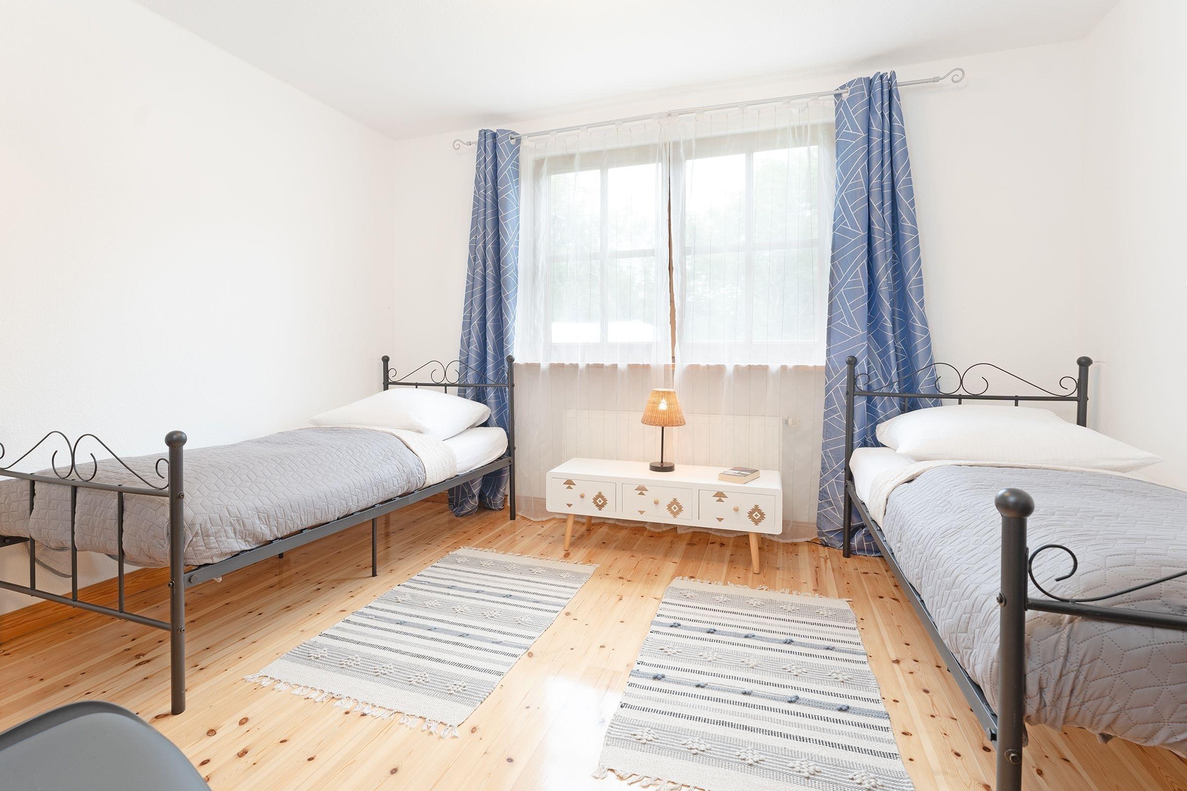 Schlafzimmer 2 im EG: 2 Einzelbetten (je 90x200 cm), Kleiderschrank, Sichtschutz: Gardinen, Platz für Babybett vorhanden