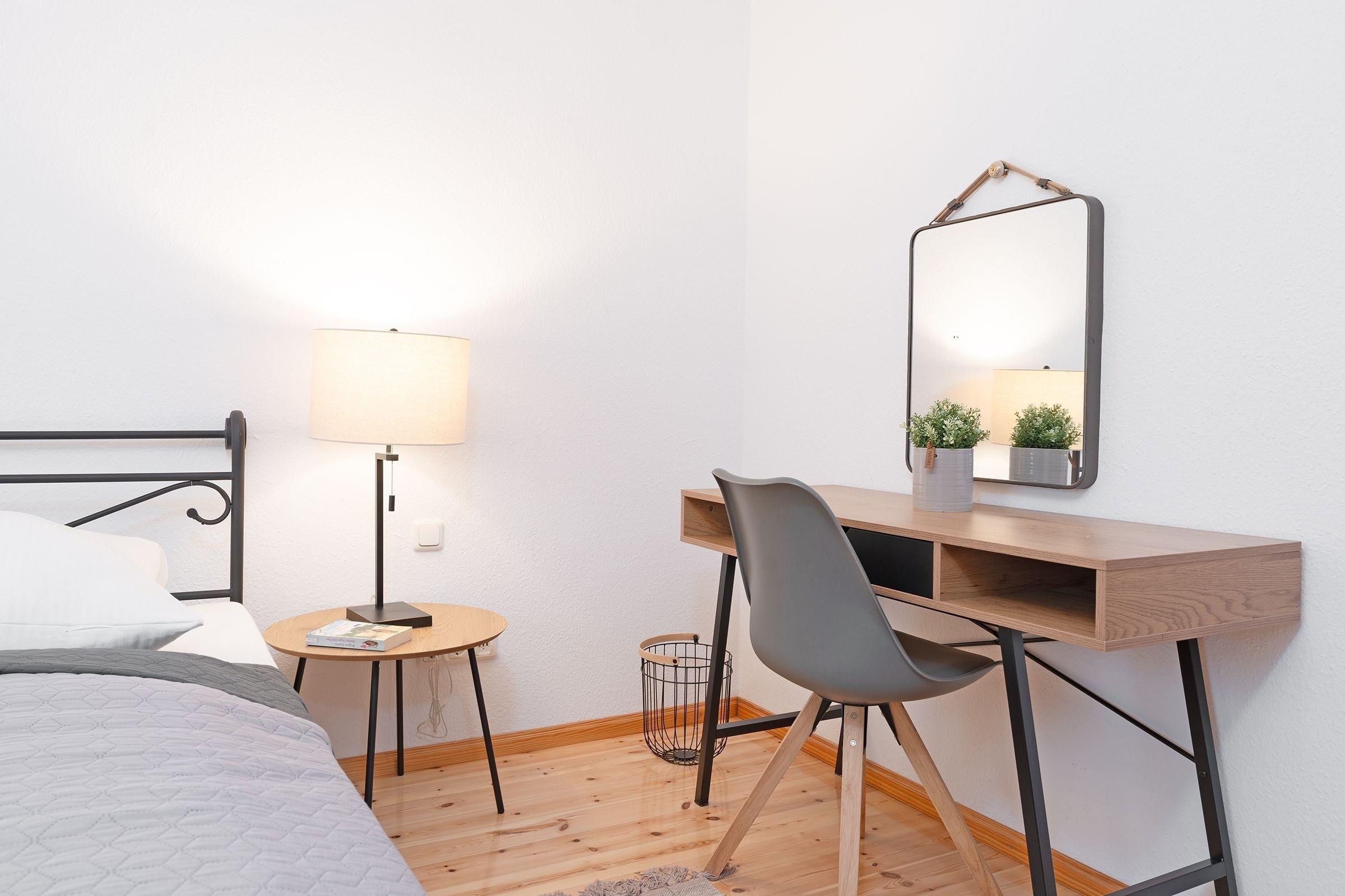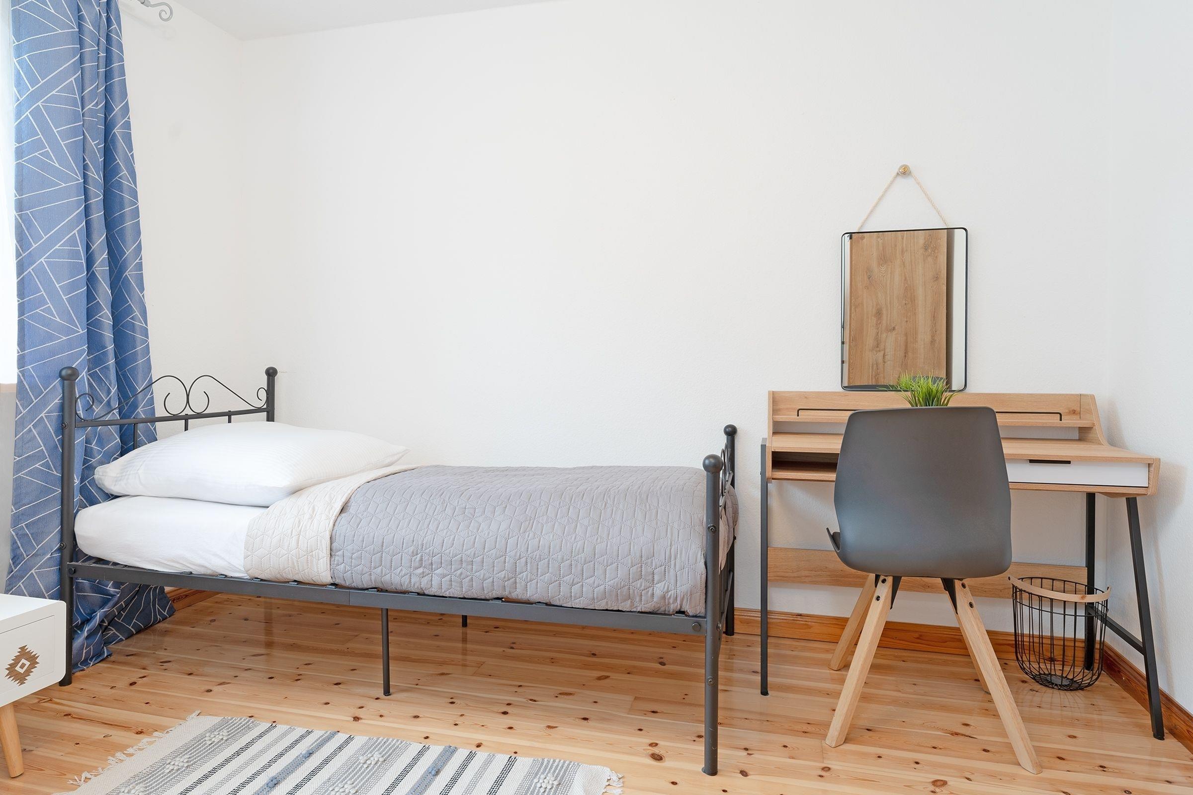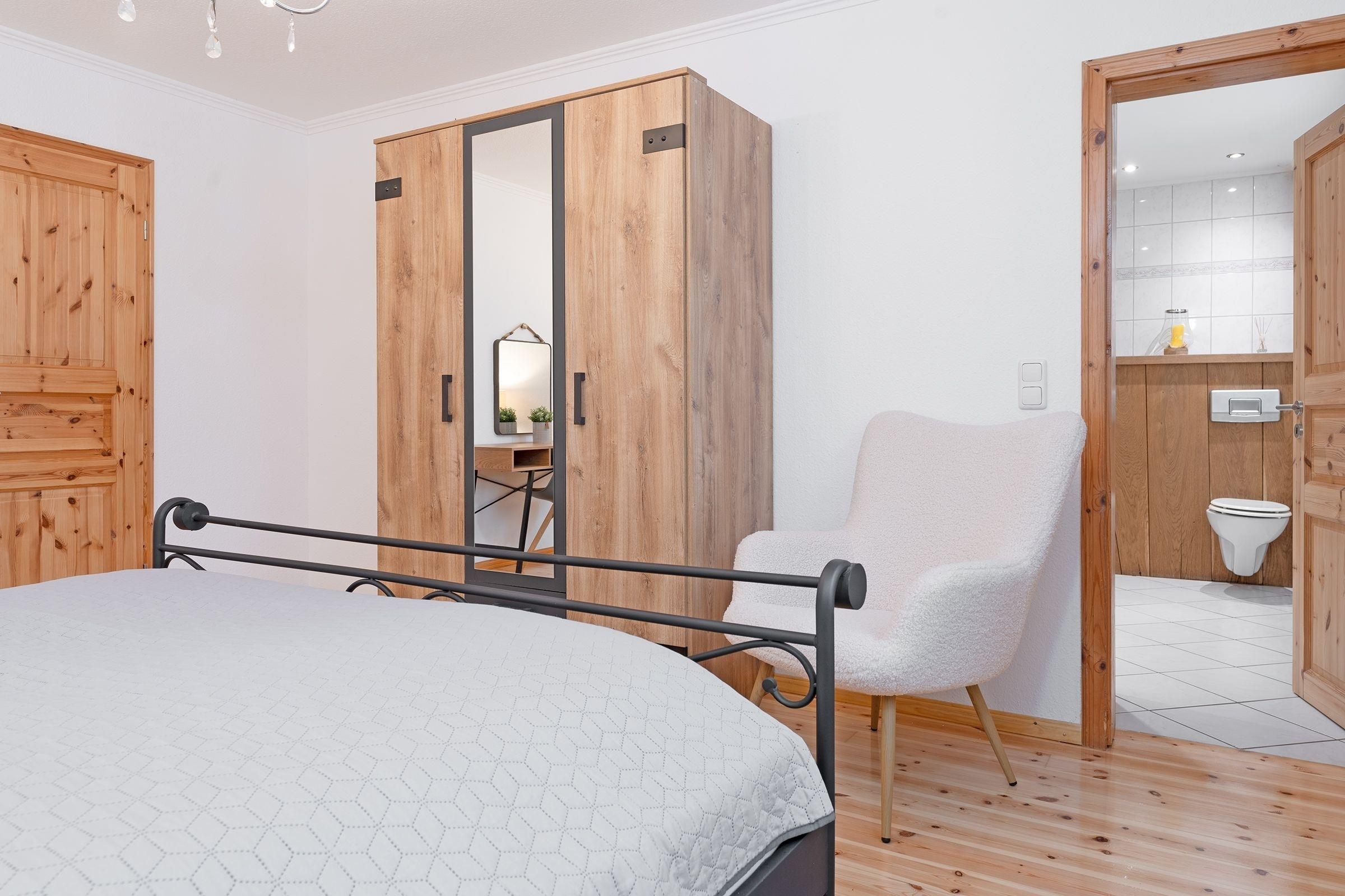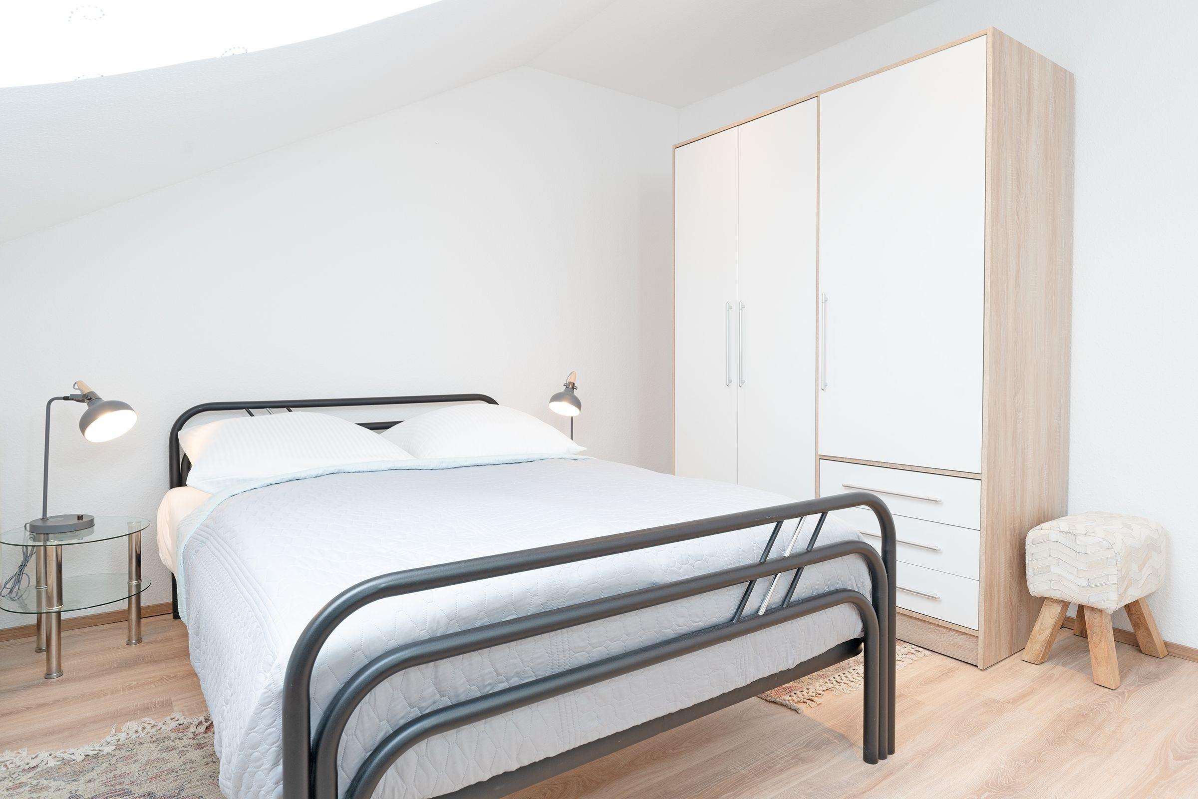 Schlafzimmer 1 im EG: 1 Doppelbett (2x 90x200 cm), Kleiderschrank, Sichtschutz: Gardinen, Platz für Babybett vorhanden
