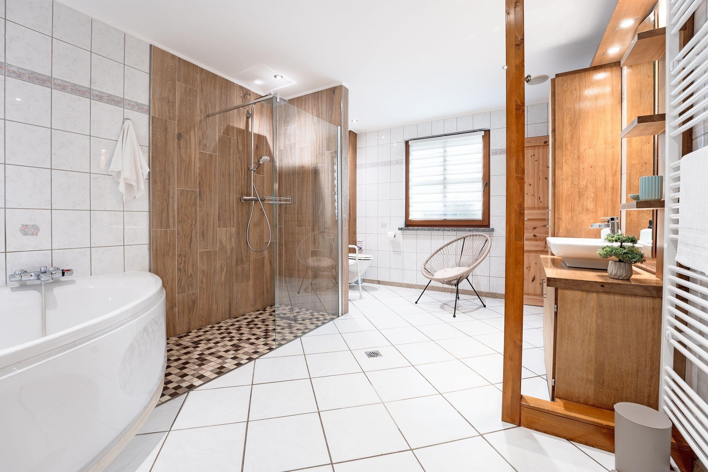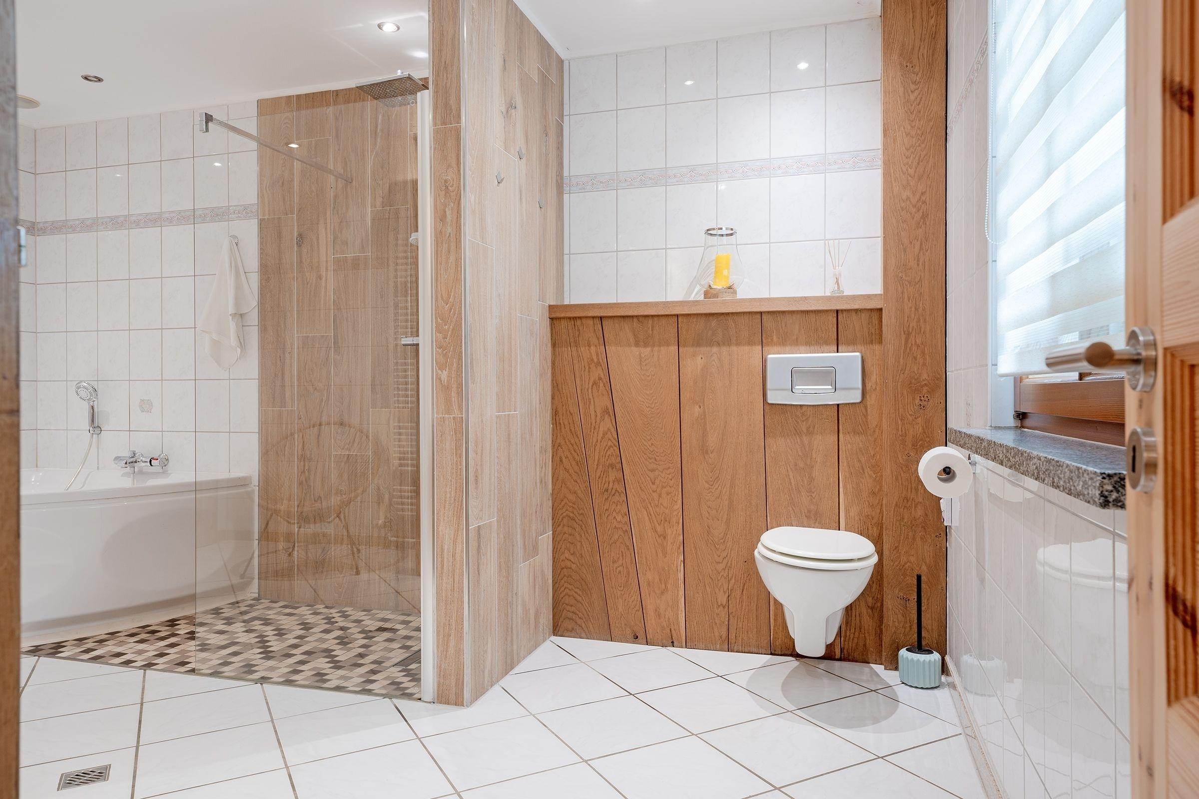 Im Erdgeschoss befindet sich ein Essplatz im großzügigen Entree, der in den offenen Küchenbereich übergeht. Das angrenzende Wohnzimmer lädt zu gemütlichen Stunden ein und bildet mit einem weiteren Zugang nach draußen das Zentrum des Hauses. Freuen Sie sich auf zahlreiche Sonnenstunden im Garten und gemütlichen Grillabenden auf der Terrasse. Drei Schlafzimmer befinden sich ebenfalls im Erdgeschoss und sind mit einem Doppelbett (2x 90x200 cm) bzw. mit jeweils 2 Einzelbetten (je 90x200 cm) ausgestattet. Das Badezimmer im Erdgeschoss erreichen Sie vom Flur und einem der Schlafzimmer. Es ist geräumig und mit einer Eckbadewanne, sowie einer großen Dusche und WC ausgestattet.