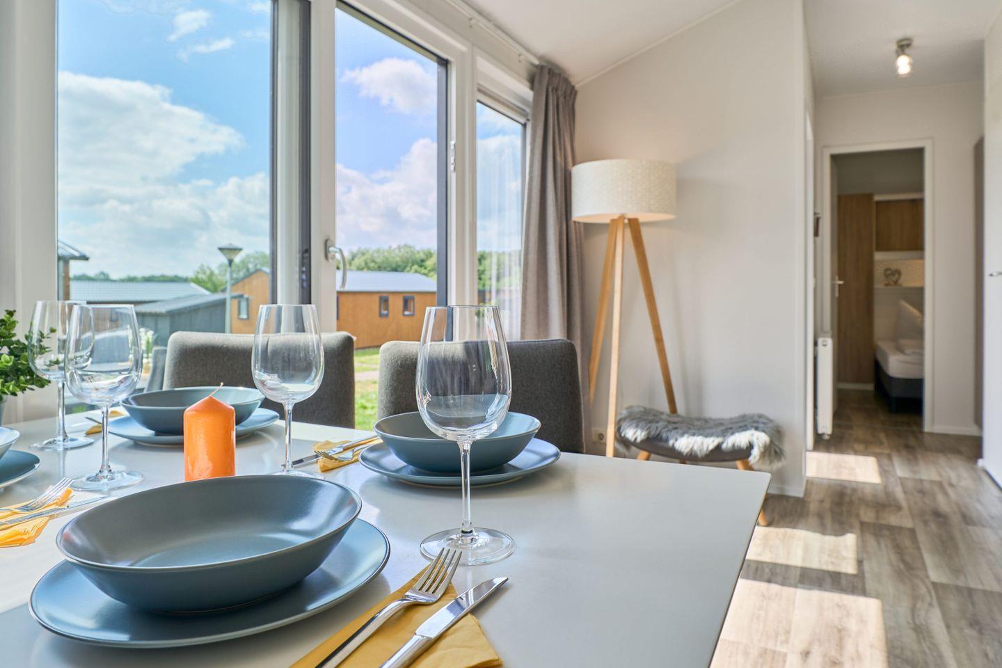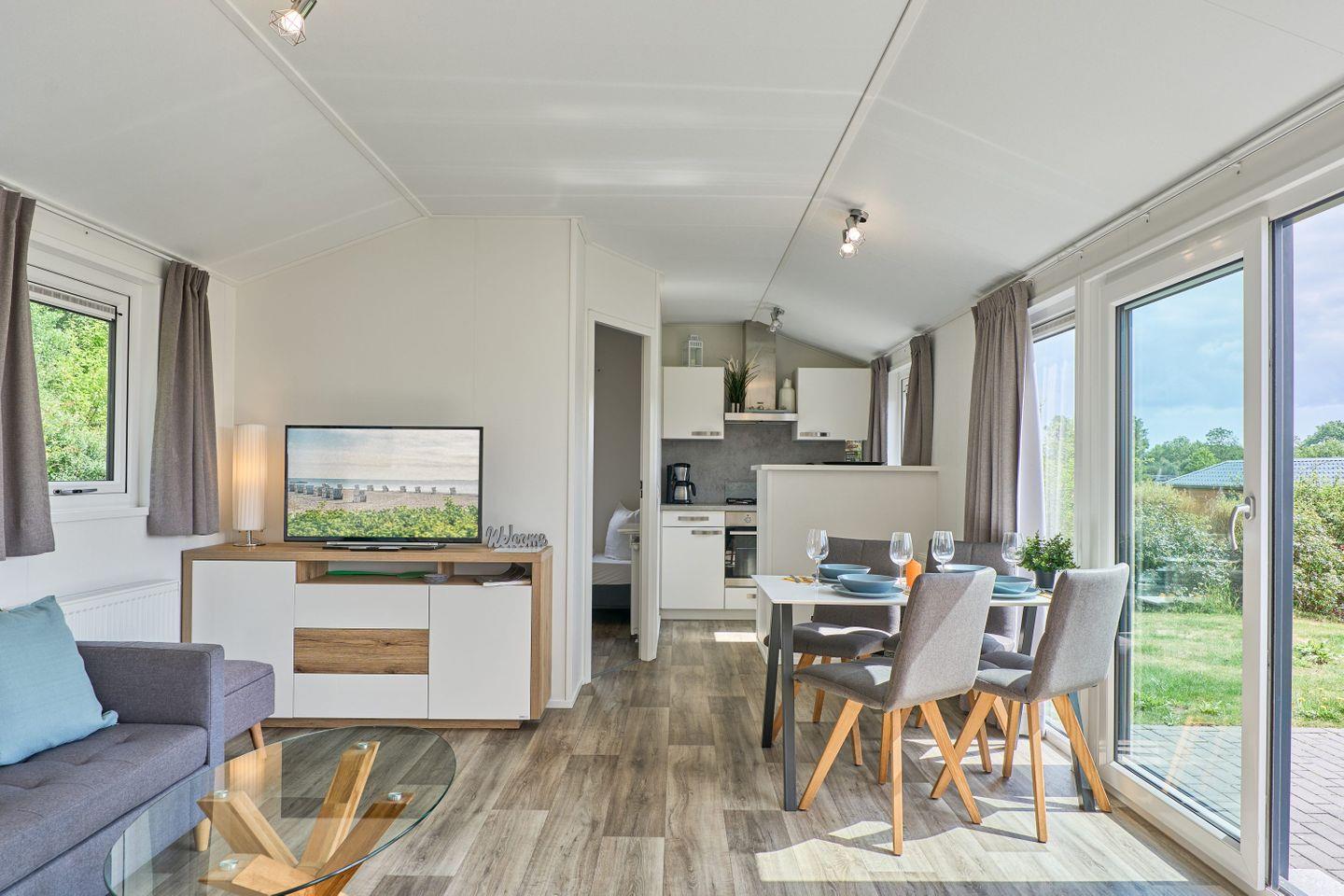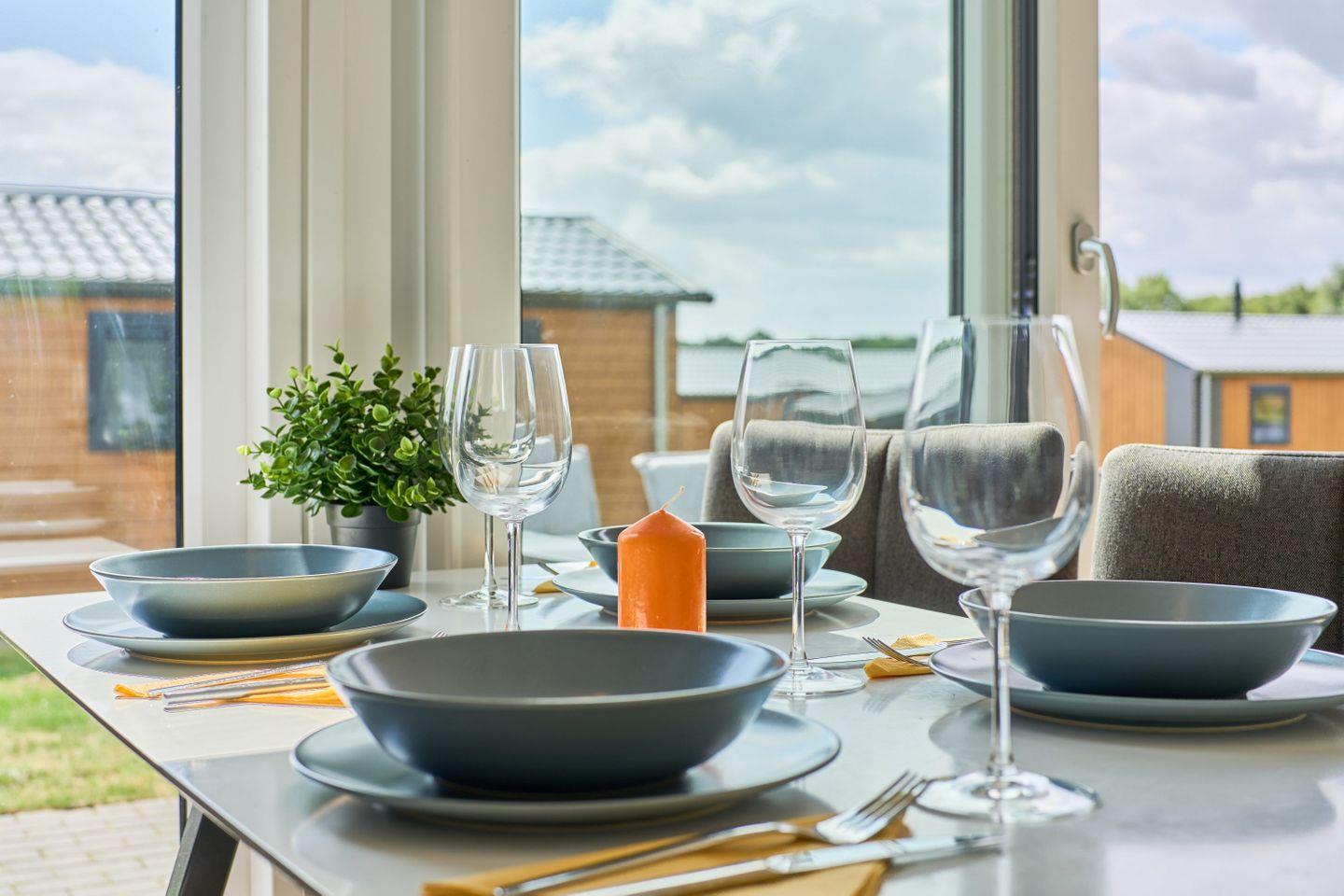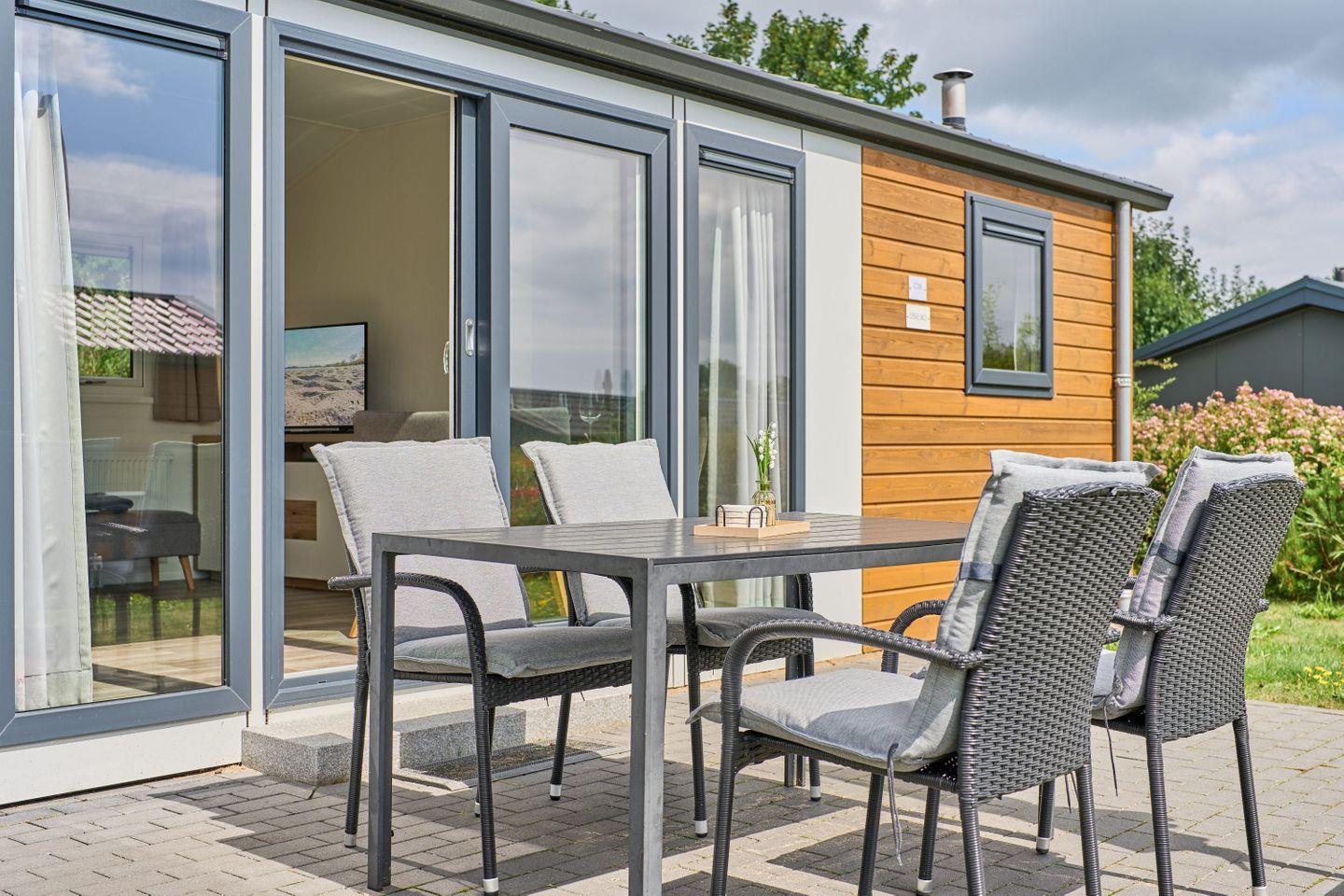 Freistehende Lodge im Seepark Süsel mit moderner Ausstattung und vielfältigen Freizeitmöglichkeiten am Wasser.