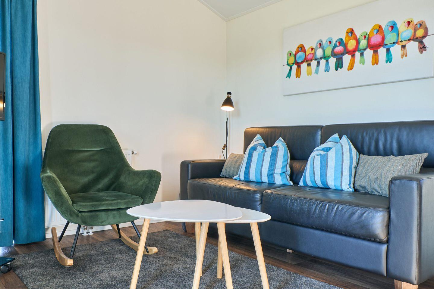 Der Wohnraum verfügt über ein komfortables Sofa sowie einen TV und ermöglicht gemütliche Stunden in privatem Ambiente. WLAN ist im Haus verfügbar, sodass Sie auch während Ihres Aufenthalts online bleiben können. Für einen angenehmen Aufenthalt sorgen außerdem Bettwäsche, Handtücher und ein Brötchenservice, der Ihnen auf Wunsch täglich frische Backwaren liefert.