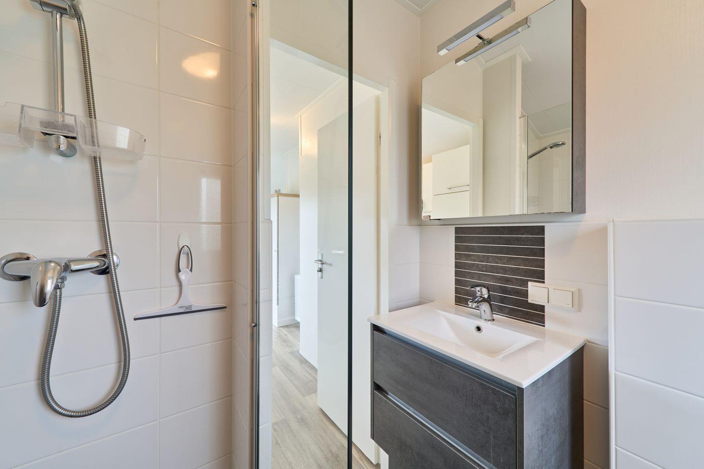 Das Badezimmer ist mit Dusche, Waschbecken, WC, Spiegel und praktischen Ablagen funktional eingerichtet. Frische Handtücher und Bettwäsche sowie Geschirrhandtücher werden bereitgestellt. Für zusätzliche Annehmlichkeiten stehen Ihnen ein gemeinschaftlich genutzter Waschtrockner, ein Staubsauger und Abfalleimer zur Verfügung.