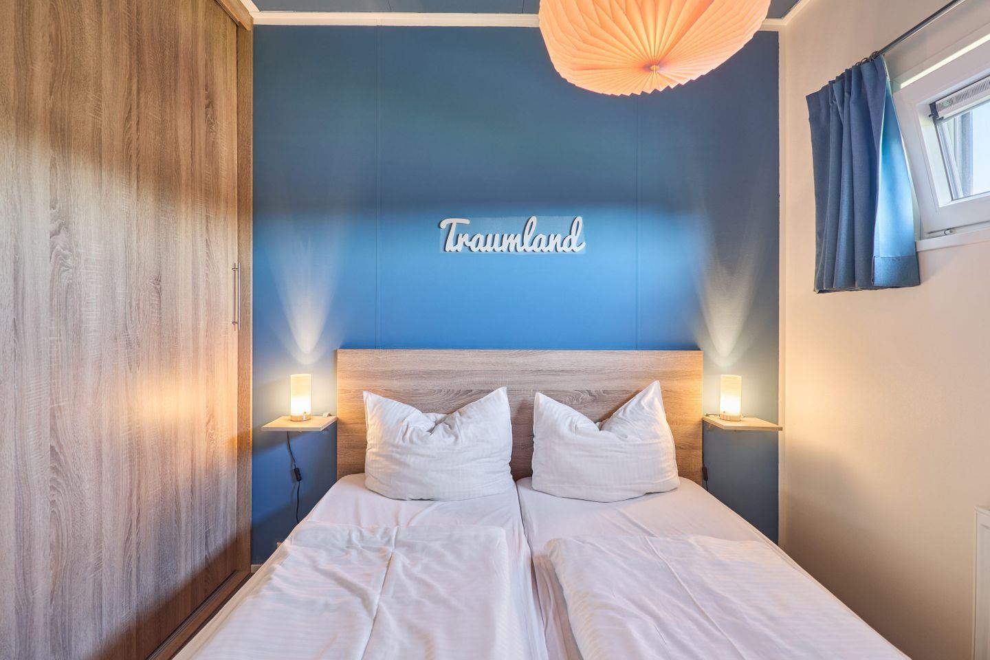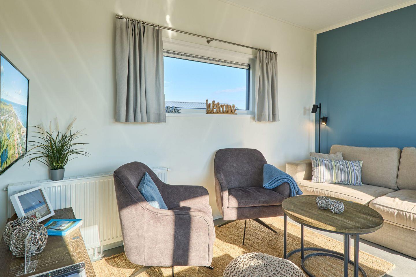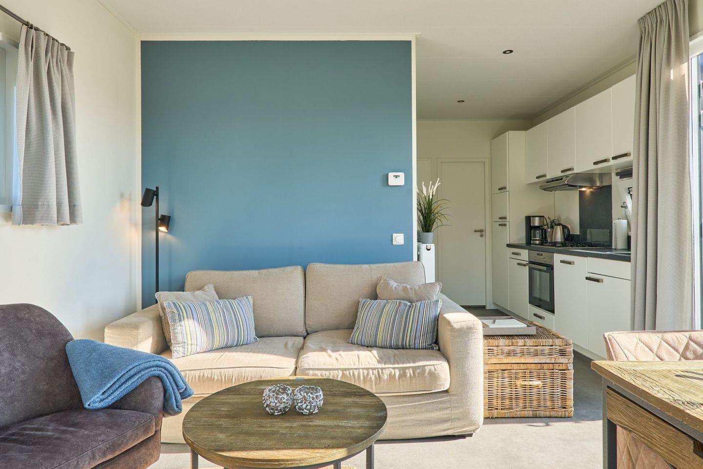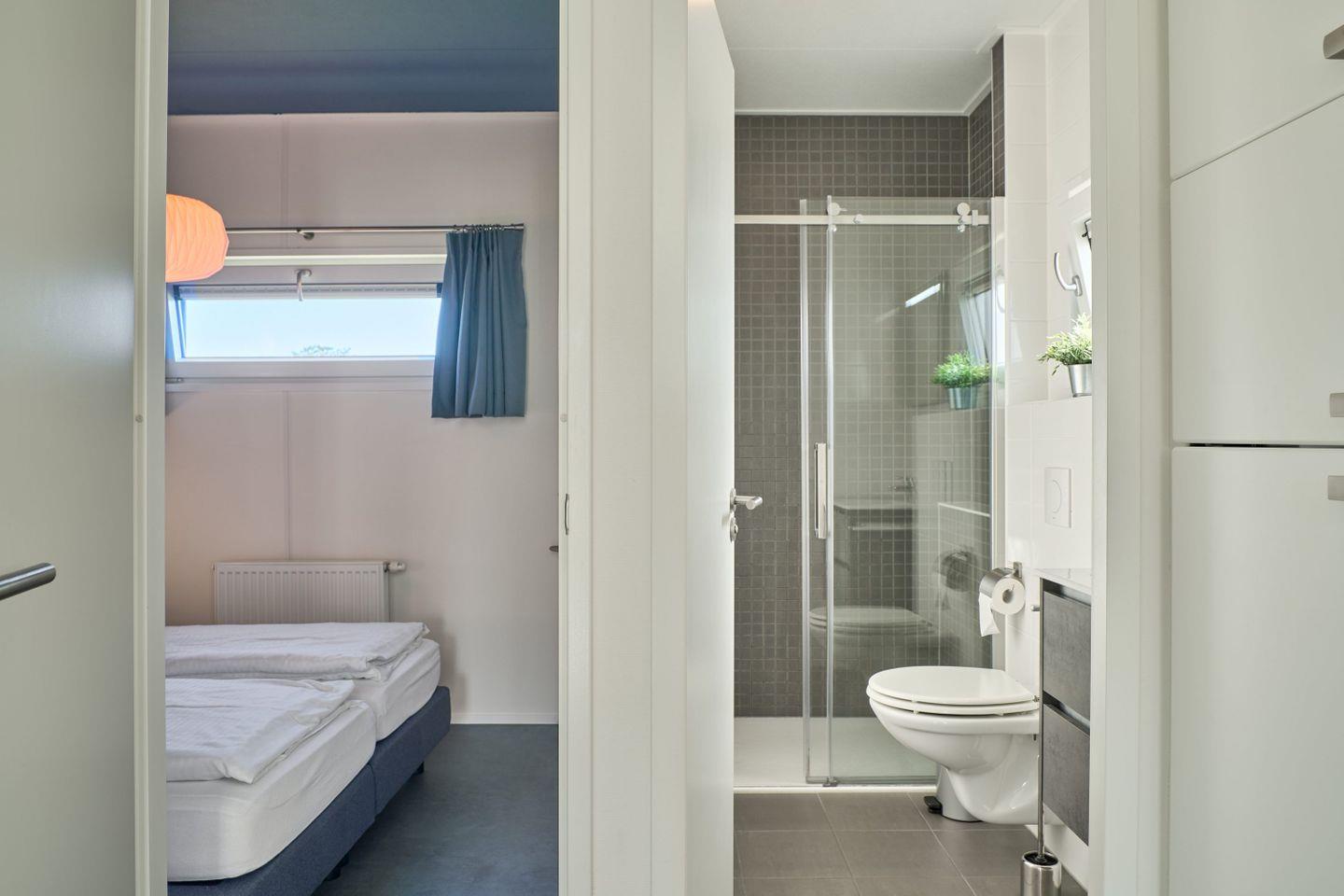 Für zusätzlichen Komfort sorgen Klimaanlage, WLAN, ein Flachbildfernseher (35–44 Zoll) mit HD-Empfang sowie eine Gasheizung. Das Chalet verfügt über zwei separate Schlafzimmer und insgesamt vier Schlafplätzen. Das helle Tageslichtbad ist mit einer bodengleichen Dusche, WC, Waschbecken, Spiegel und Handtüchern ausgestattet; Bettwäsche ist inklusive. Waschmaschine und Trockner stehen zur gemeinschaftlichen Nutzung bereit, ein Staubsauger befindet sich im Haus.