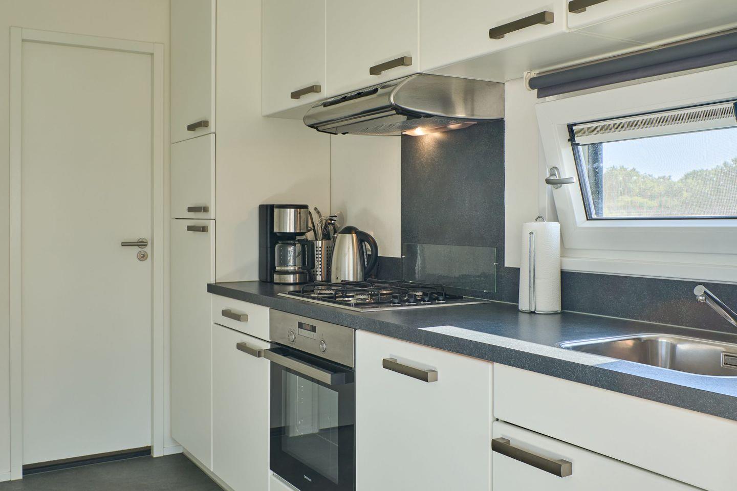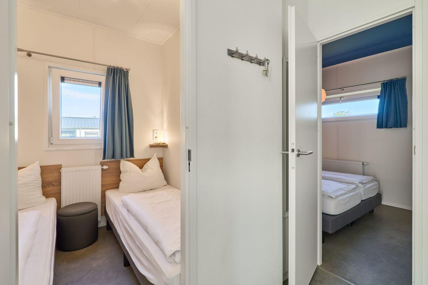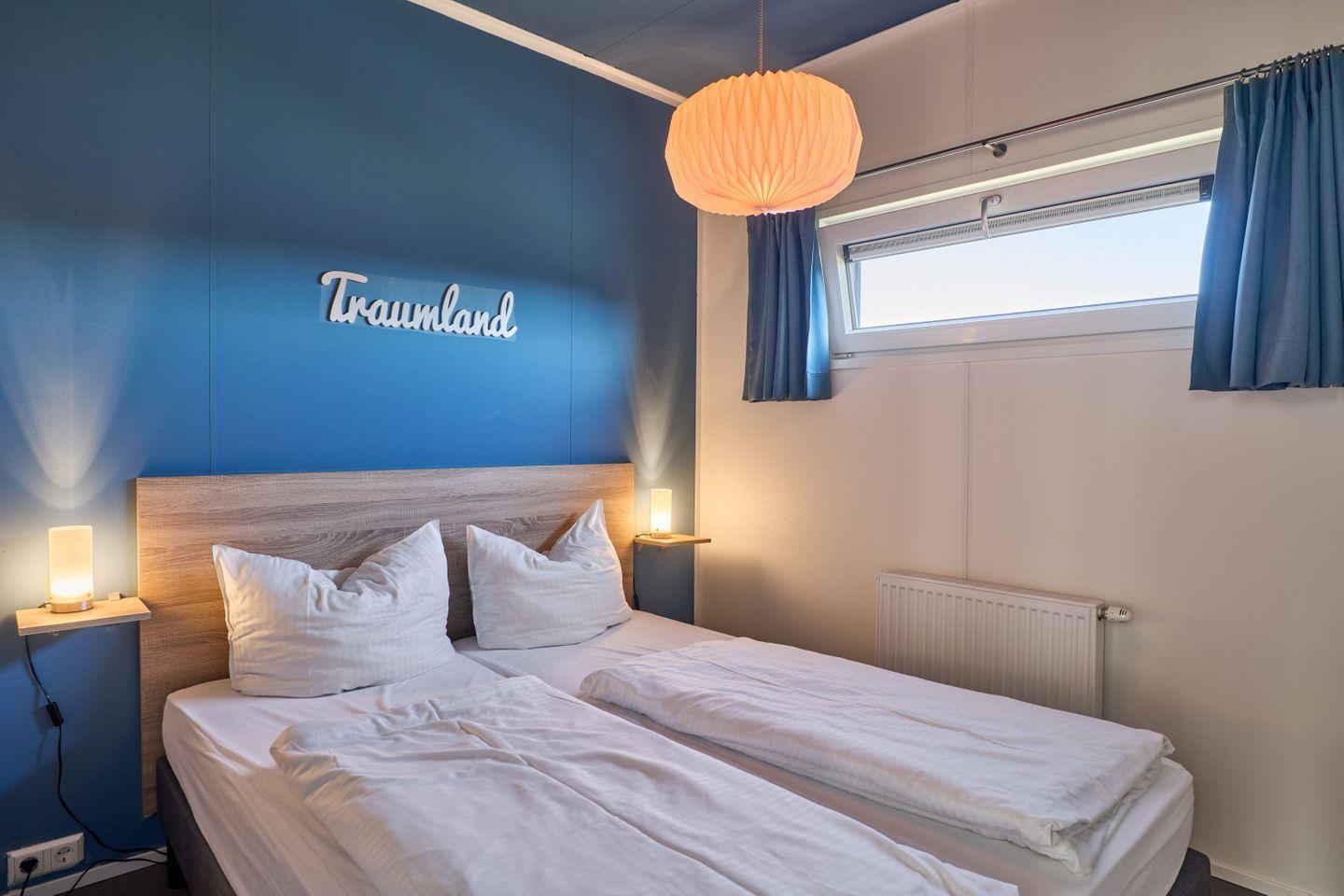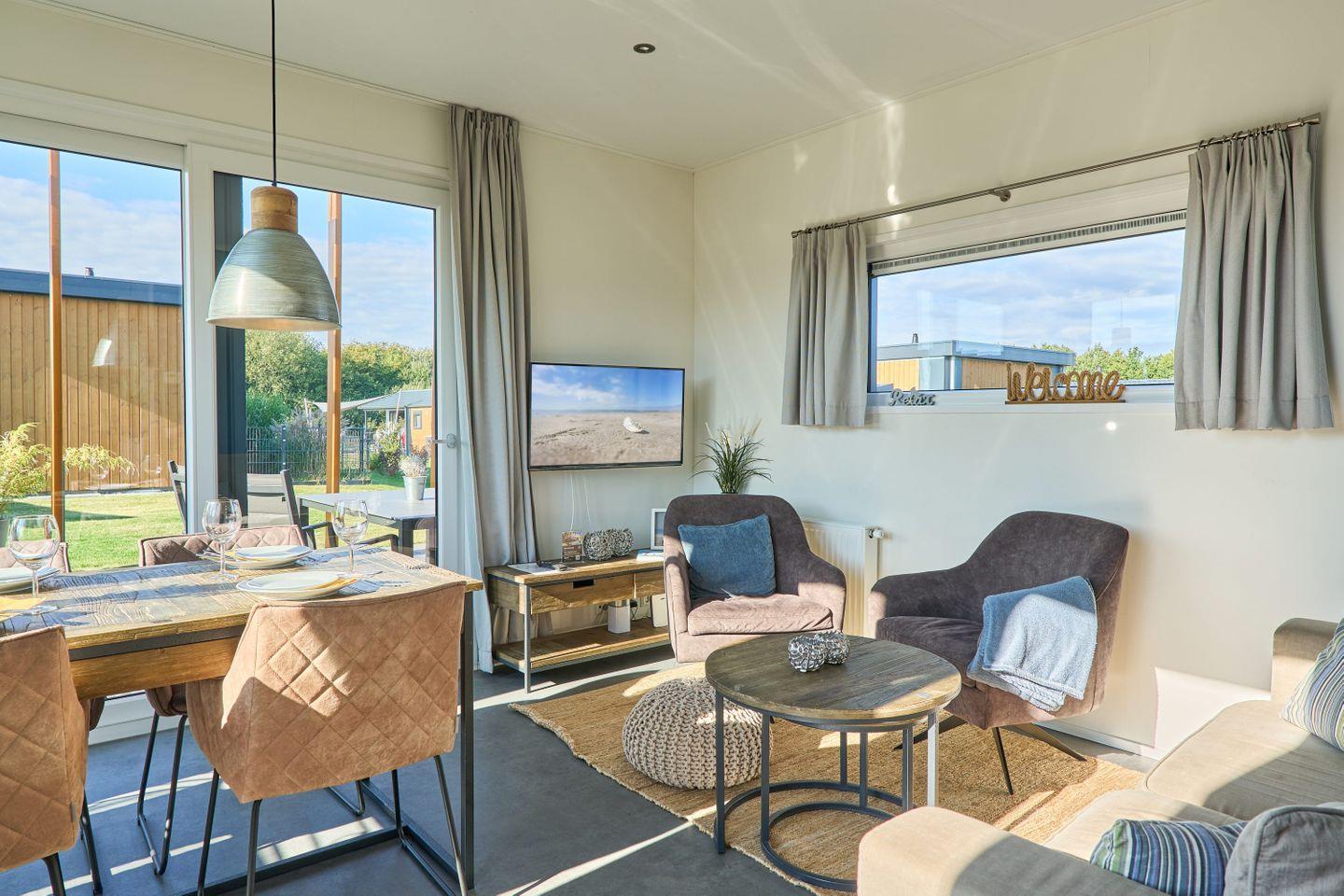 Für zusätzlichen Komfort sorgen Klimaanlage, WLAN, ein Flachbildfernseher (35–44 Zoll) mit HD-Empfang sowie eine Gasheizung. Das Chalet verfügt über zwei separate Schlafzimmer und insgesamt vier Schlafplätzen. Das helle Tageslichtbad ist mit einer bodengleichen Dusche, WC, Waschbecken, Spiegel und Handtüchern ausgestattet; Bettwäsche ist inklusive. Waschmaschine und Trockner stehen zur gemeinschaftlichen Nutzung bereit, ein Staubsauger befindet sich im Haus.