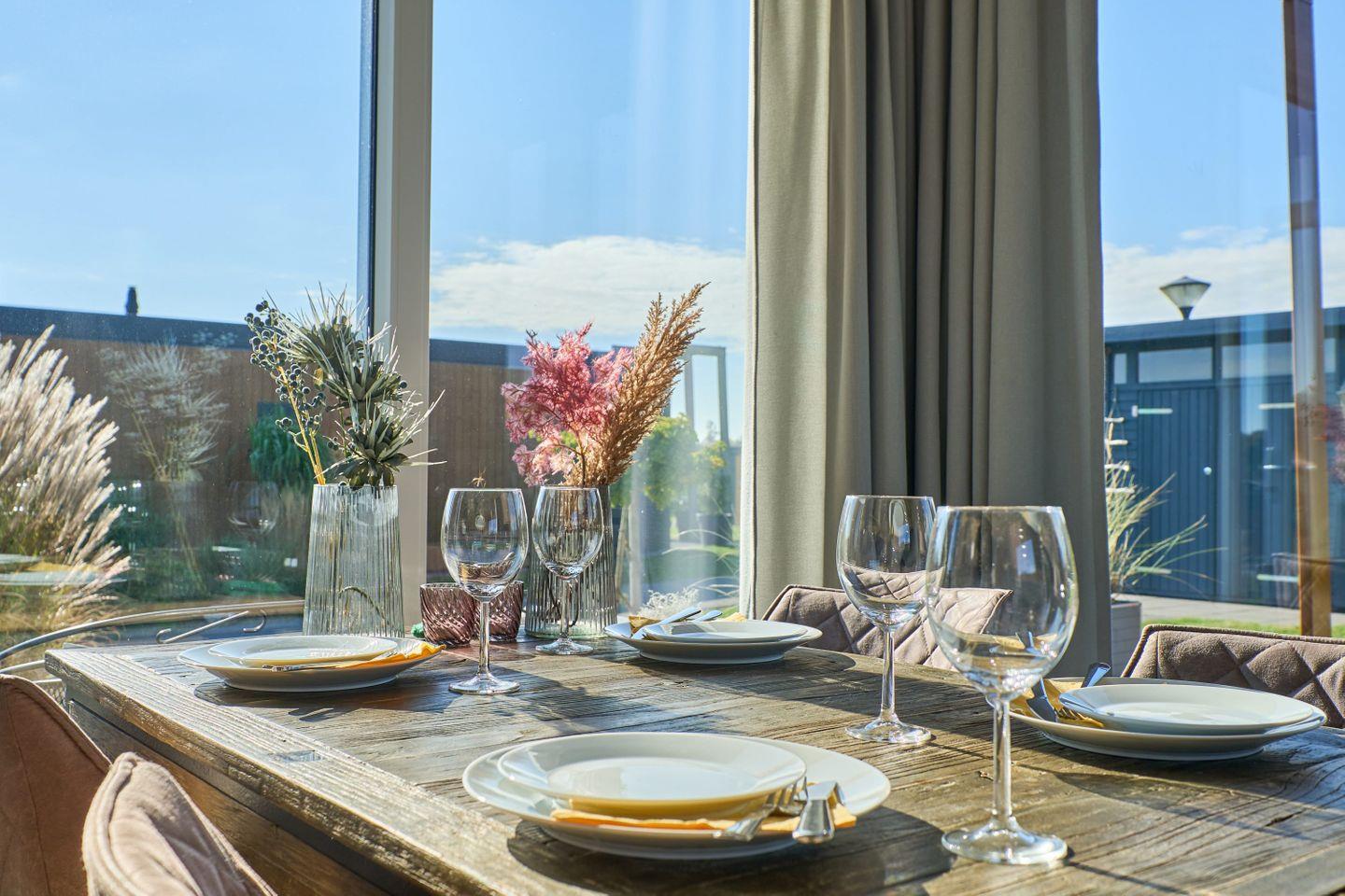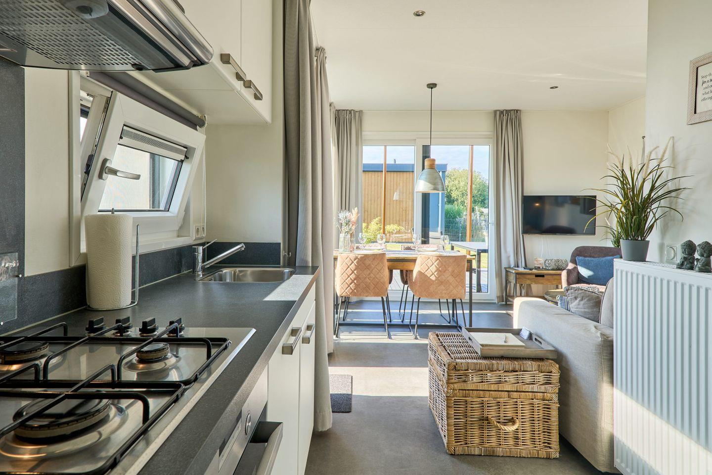 Der offen gestaltete Wohn- und Essbereich ist geschmackvoll eingerichtet und mit einer hochwertigen Wohnraumausstattung von Riviera Maison versehen, die dem Chalet eine besondere Eleganz und Wertigkeit verleiht. Die offene Küche ist sehr gut ausgestattet und erfüllt alle heutigen Komfortansprüche: Geschirr, Besteck, Küchenutensilien, Geschirrhandtücher sowie zeitgemäße Küchengeräte wie Spülmaschine, Backofen mit Gasanschluss, Wasserkocher, Toaster, Kaffeemaschine und Mikrowelle stehen zur Verfügung. Ein Gefrierfach ist im Kühlschrank integriert. Der großzügige Esstisch bietet ausreichend Platz für gemeinsame Mahlzeiten – gern auch mit regionalen Produkten, die vor Ort an einem Automaten erhältlich sind und den Aufenthalt kulinarisch abrunden.