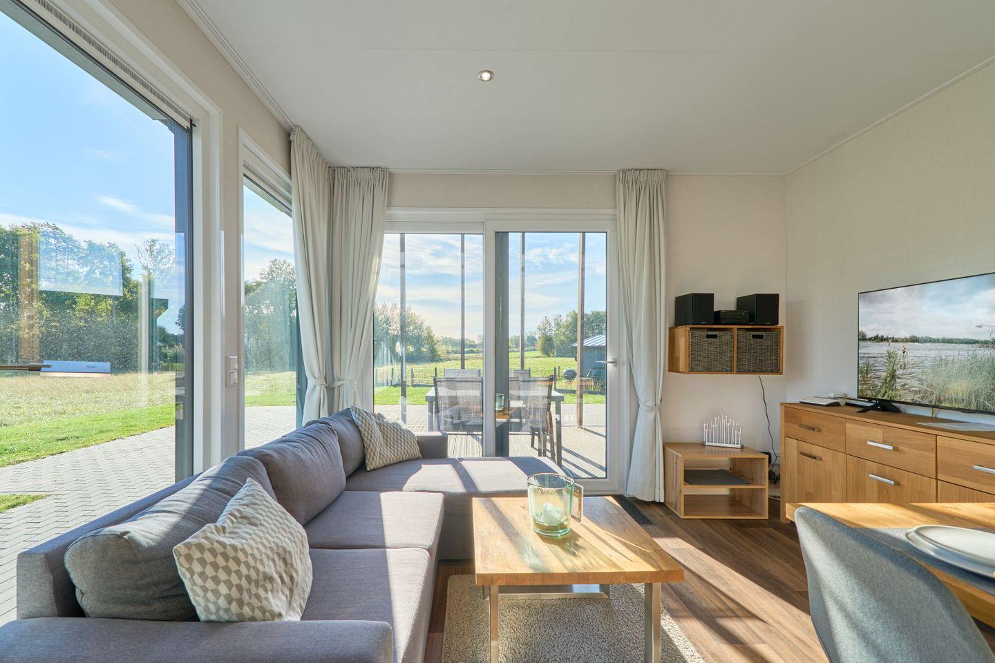 Im Außenbereich wartet eine möblierte Terrasse, auf der Sie entspannte Stunden verbringen und den Ausblick auf die grüne Umgebung oder den nahen See genießen können. Sie erreichen den See in nur etwa 150 Metern und haben somit ideale Möglichkeiten für Schwimmen und Wassersport. Sport- und Aktivurlauber profitieren von einem breiten regionalen Freizeitangebot: In der Nähe werden Wasserski, Radfahren, Wandern, Joggen und weitere sportliche Aktivitäten geboten. Für Golfer ist der nächste Golfplatz nur rund 5.000 Meter entfernt. Im Umkreis von 7.000 Metern finden Sie einen Sandstrand, sodass auch ein Tagesausflug ans Meer problemlos möglich ist.
