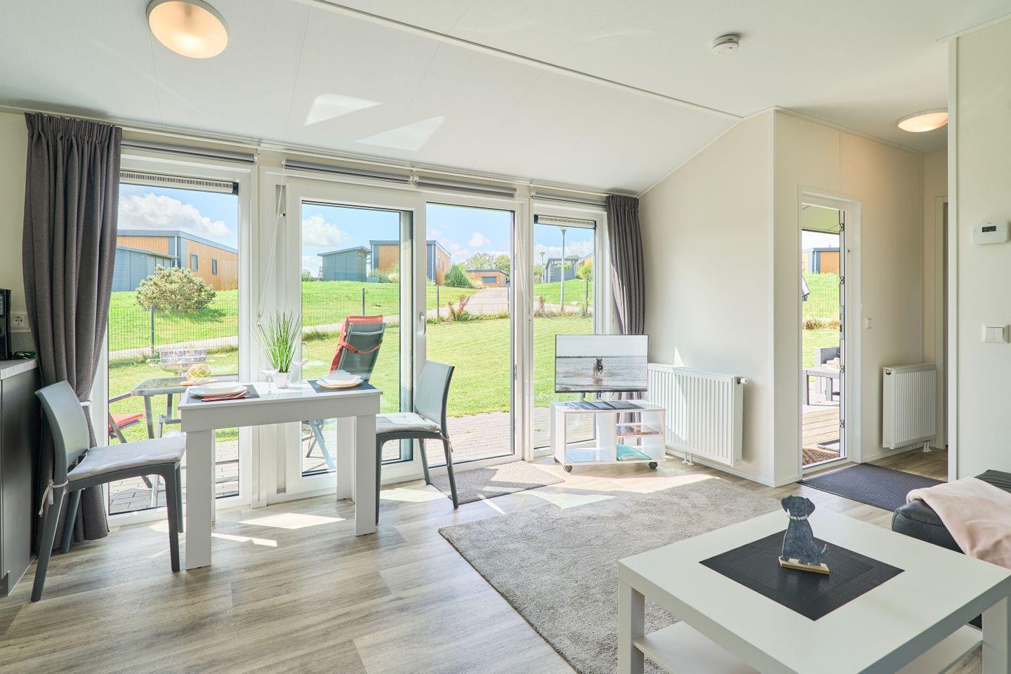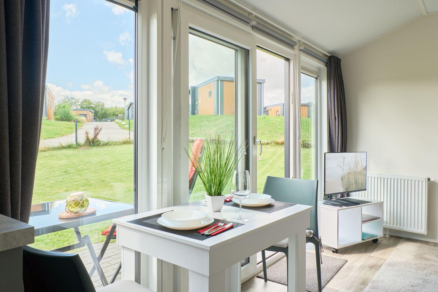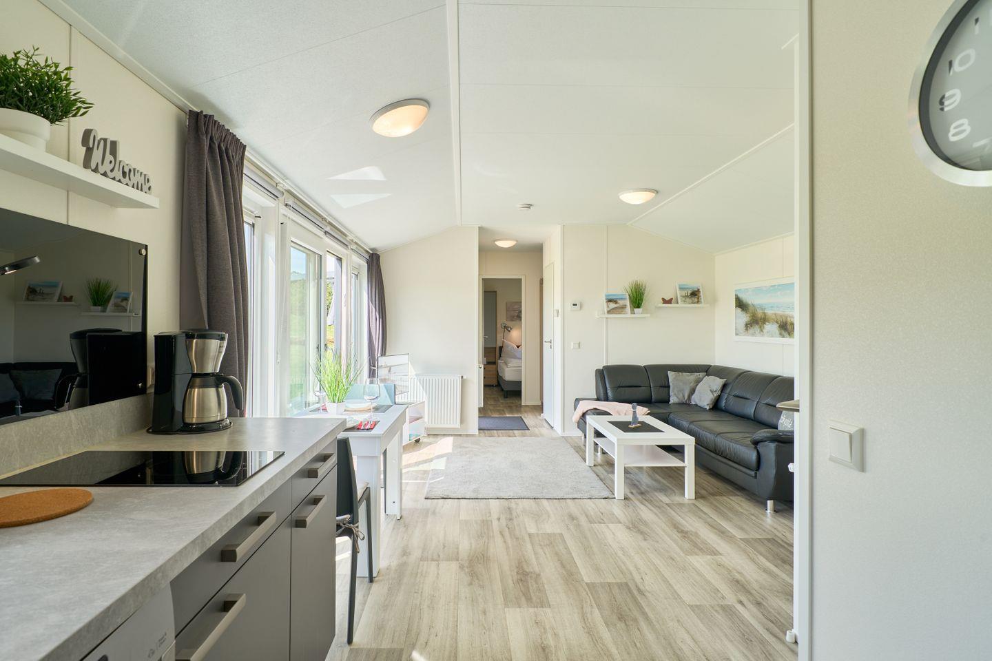 Die offene Küche ist in das Wohnzimmer integriert und hochwertig ausgestattet, unter anderem mit Herd, Backofen, Kühlschrank, Gefrierfach, Geschirrspüler, Kaffeemaschine, Wasserkocher, Toaster, Esstisch sowie vollständigen Küchenutensilien, Geschirr und Besteck. Geschirrhandtücher sind vorhanden. Das Wohnzimmer lädt mit einem Sofa und einem Fernseher zum Entspannen ein. Kostenlos verfügbares WLAN ermöglicht komfortables Surfen. Für gemütliche gemeinsame Stunden steht eine möblierte Terrasse zur Verfügung, ideal zum Verweilen oder für gemeinsame Mahlzeiten im Freien.