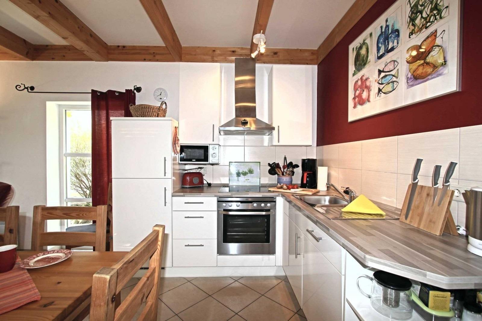 Eine moderne, helle Küchenzeile mit Kühlschrank, großem Gefrierfach, Backofen, Cerankochfeld, Mikrowelle und Geschirrspüler, Toaster, Kaffeemaschine und Wasserkocher, Mixstab, Handmixer, Elektrogrill, hochwertige Töpfe und Pfannen, viel Besteck, Geschirr und Gläser laden zum gemütlichen Kochen ein.