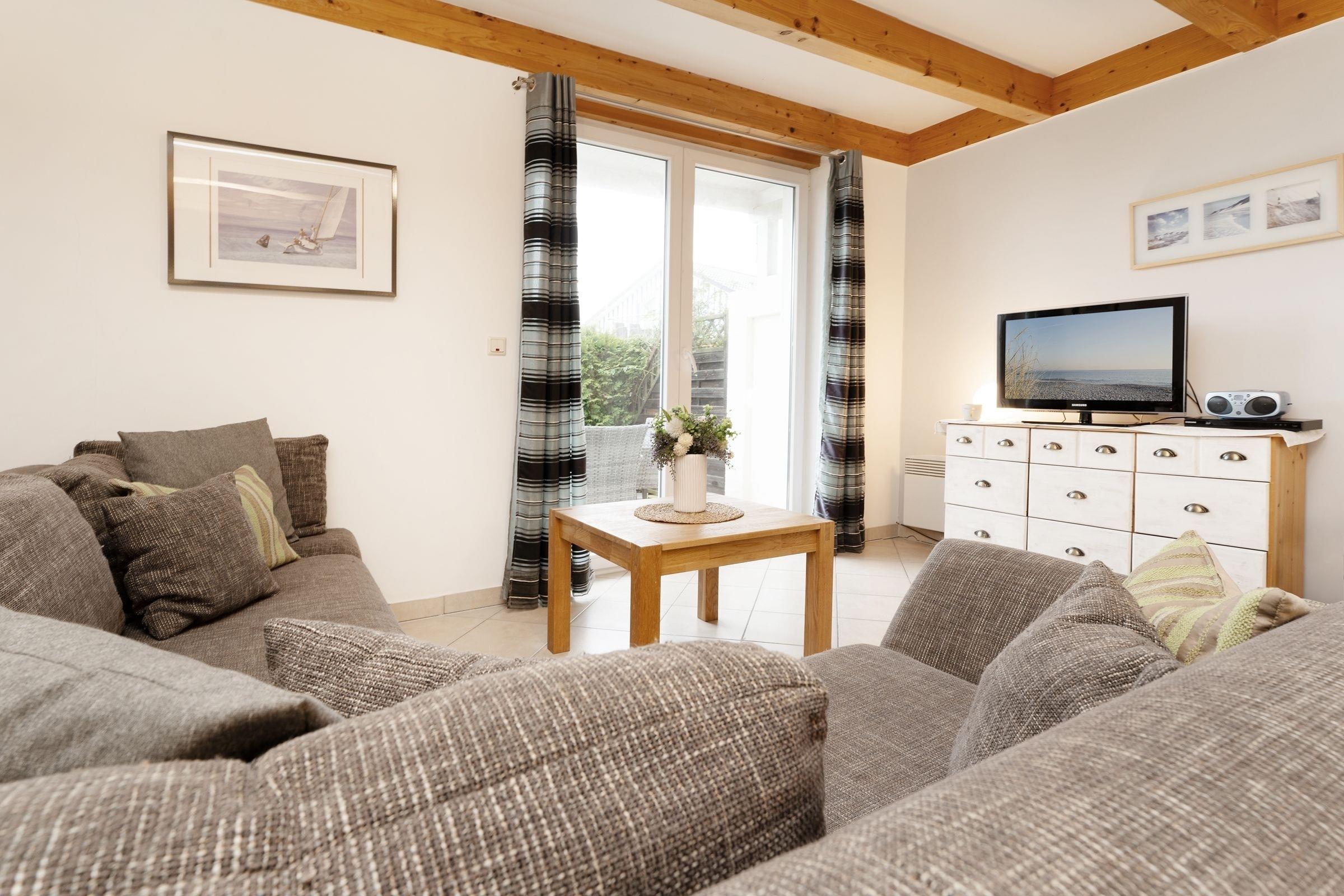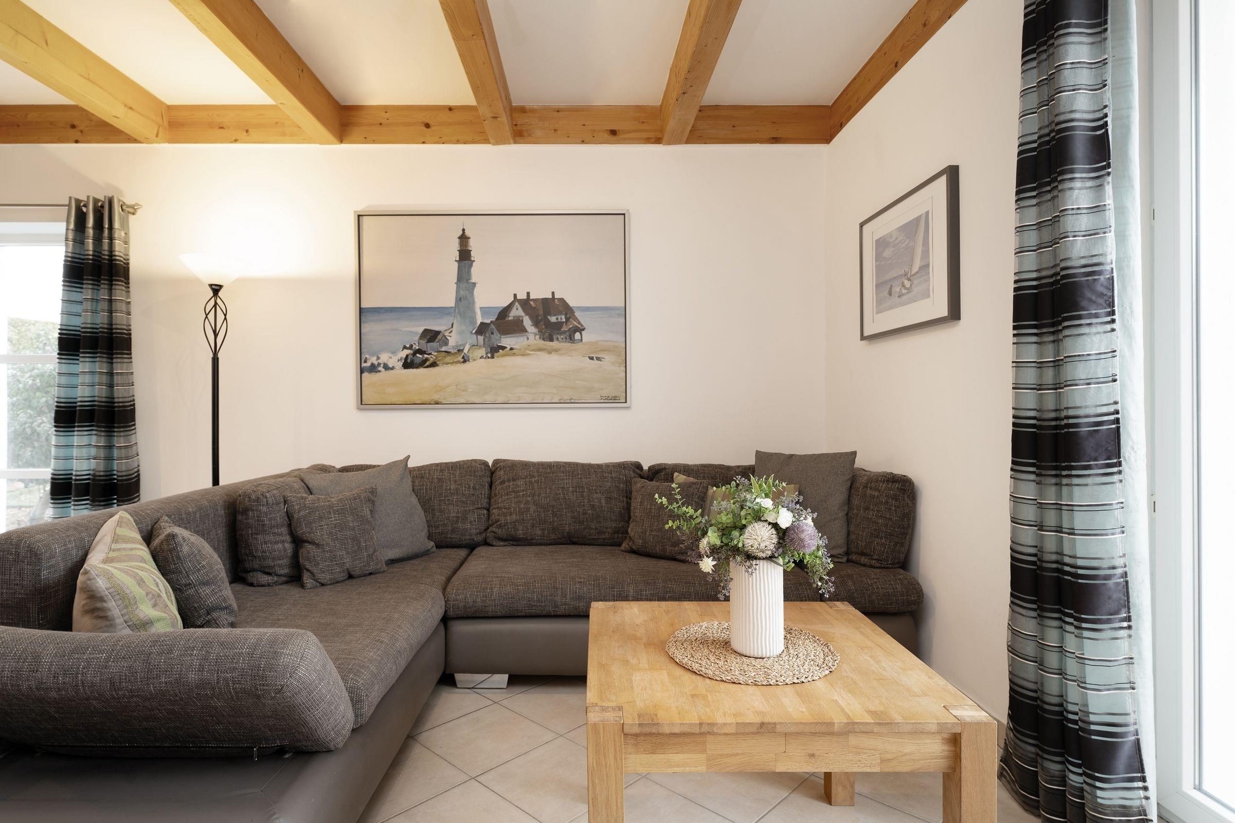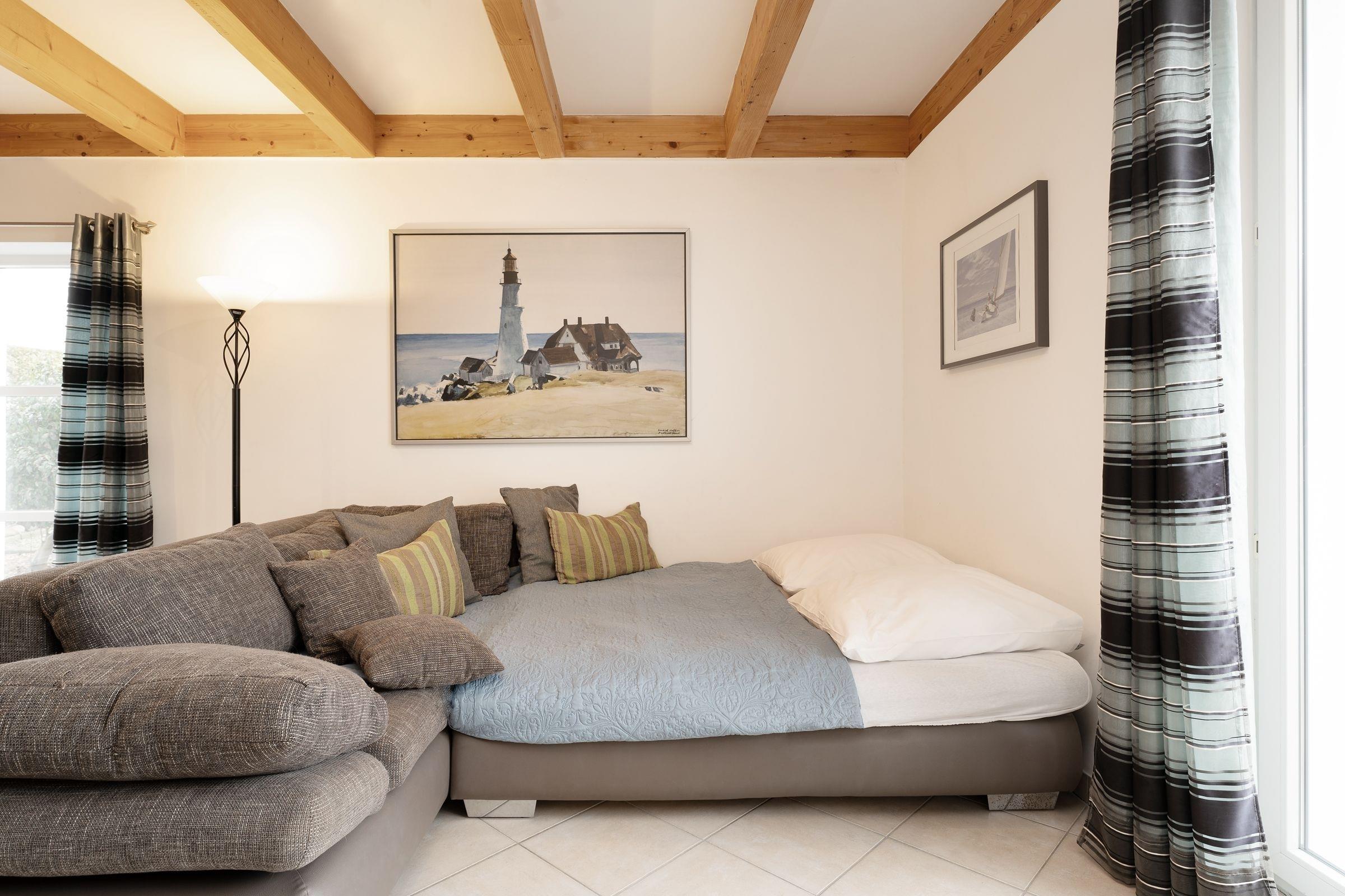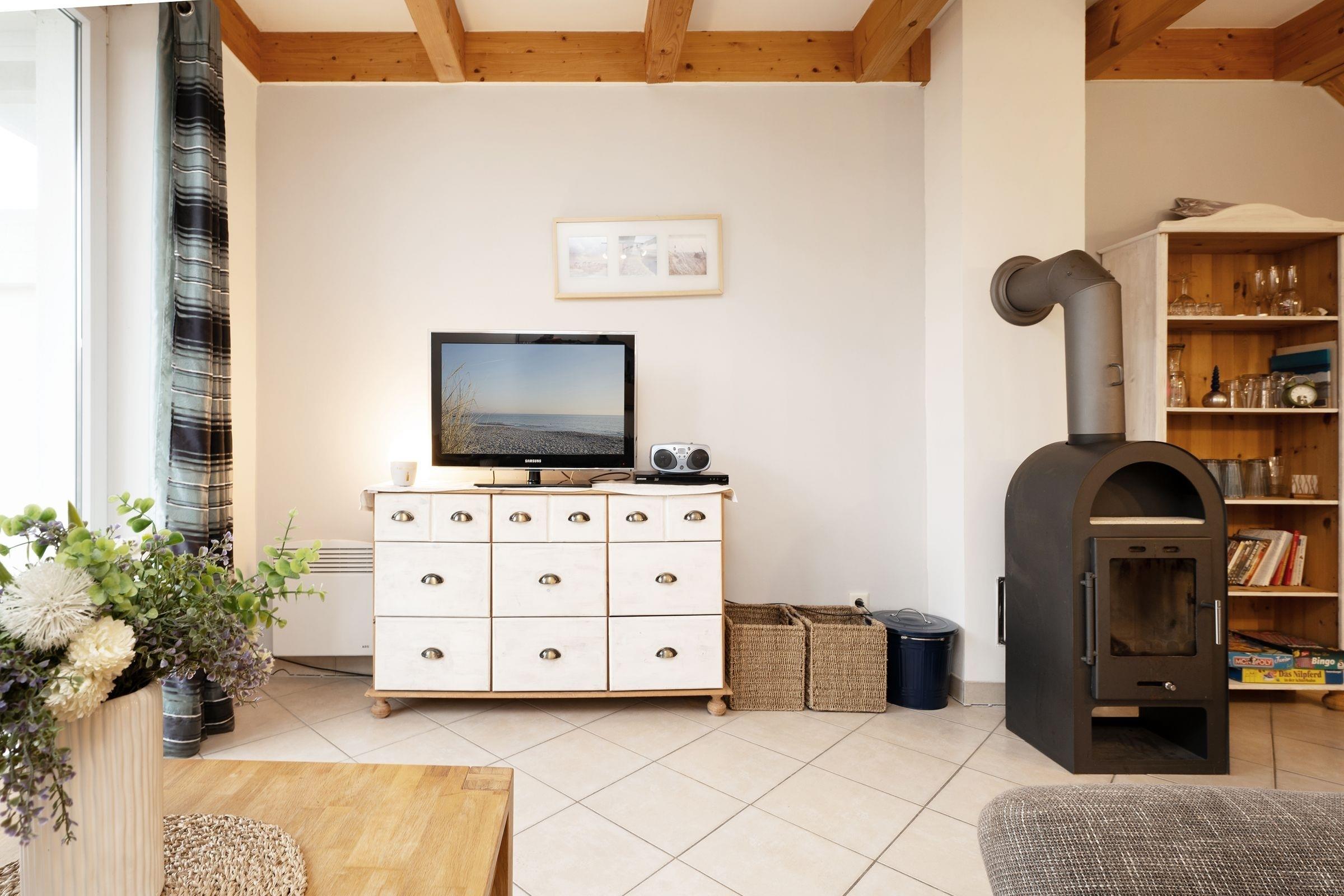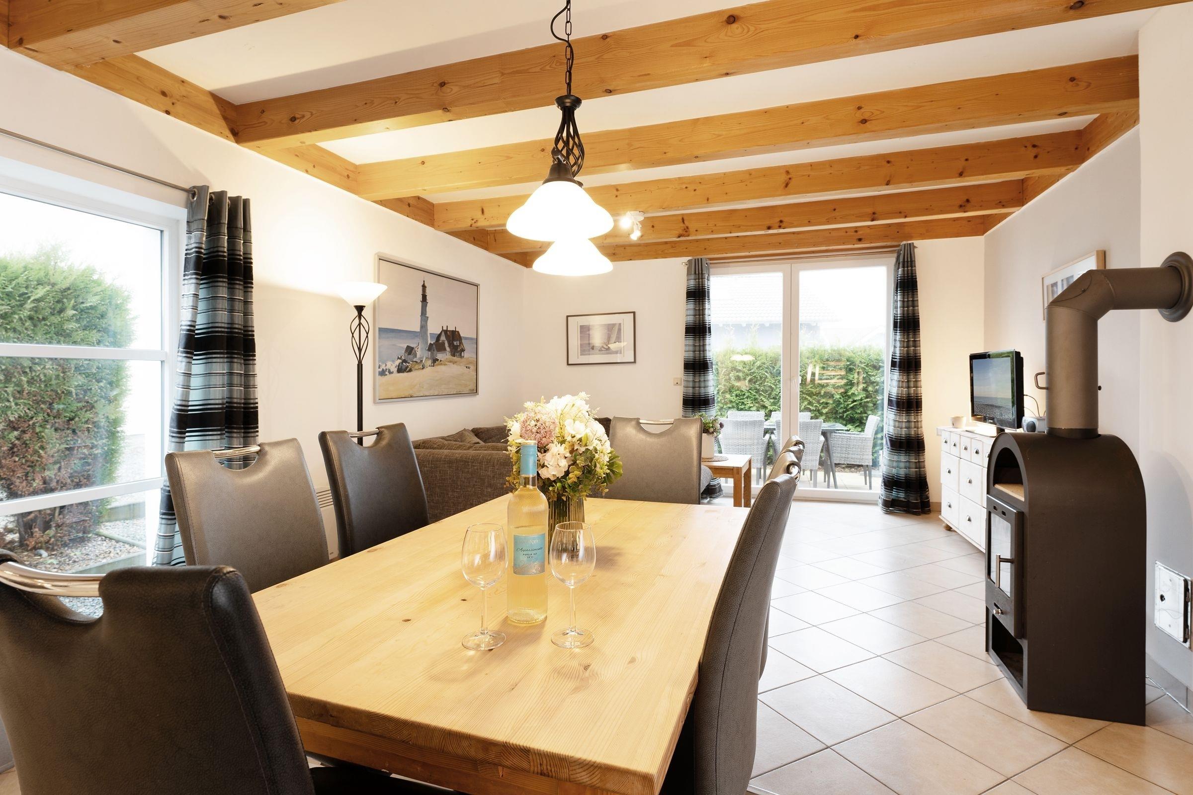 Der großzügige Wohn- und Essbereich mit Kaminofen und offener Küche wird Sie begeistern. Hier finden Sie alles, um in gemütlicher Atmosphäre wertvolle Familienzeit zu genießen. Die Süd-Terrasse trägt die Meeresbrise hinein, der kleine Garten hinter dem Haus mit Grillecke und Sonnenliegen rundet den Strandtag ab. Das Sofa lässt sich abends für 2 Gäste in eine Schlafstätte (ca. 150x200 cm) verwandeln. Im Obergeschoss finden Sie ein Schlafzimmer mit Doppelbett (2x 90x200cm) und Zutritt auf den großen, möblierten Südbalkon sowie ein Schlafzimmer mit Kojen-Bett und Einzelbett (je 90x200 cm). Ebenso ein Duschbad mit Waschmaschine. Das Gäste-WC liegt im Erdgeschoss.