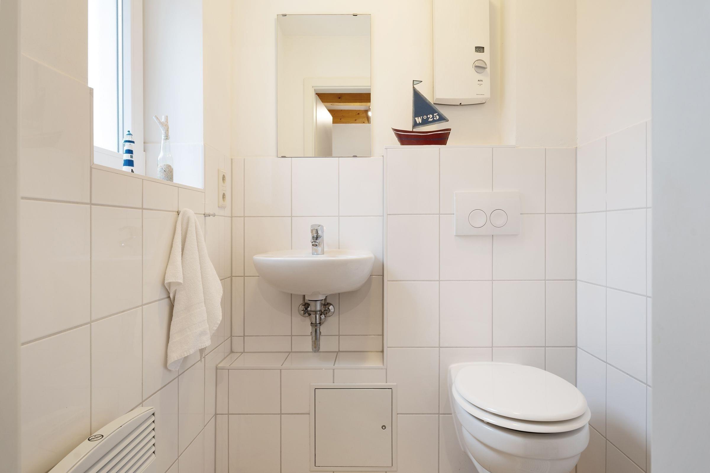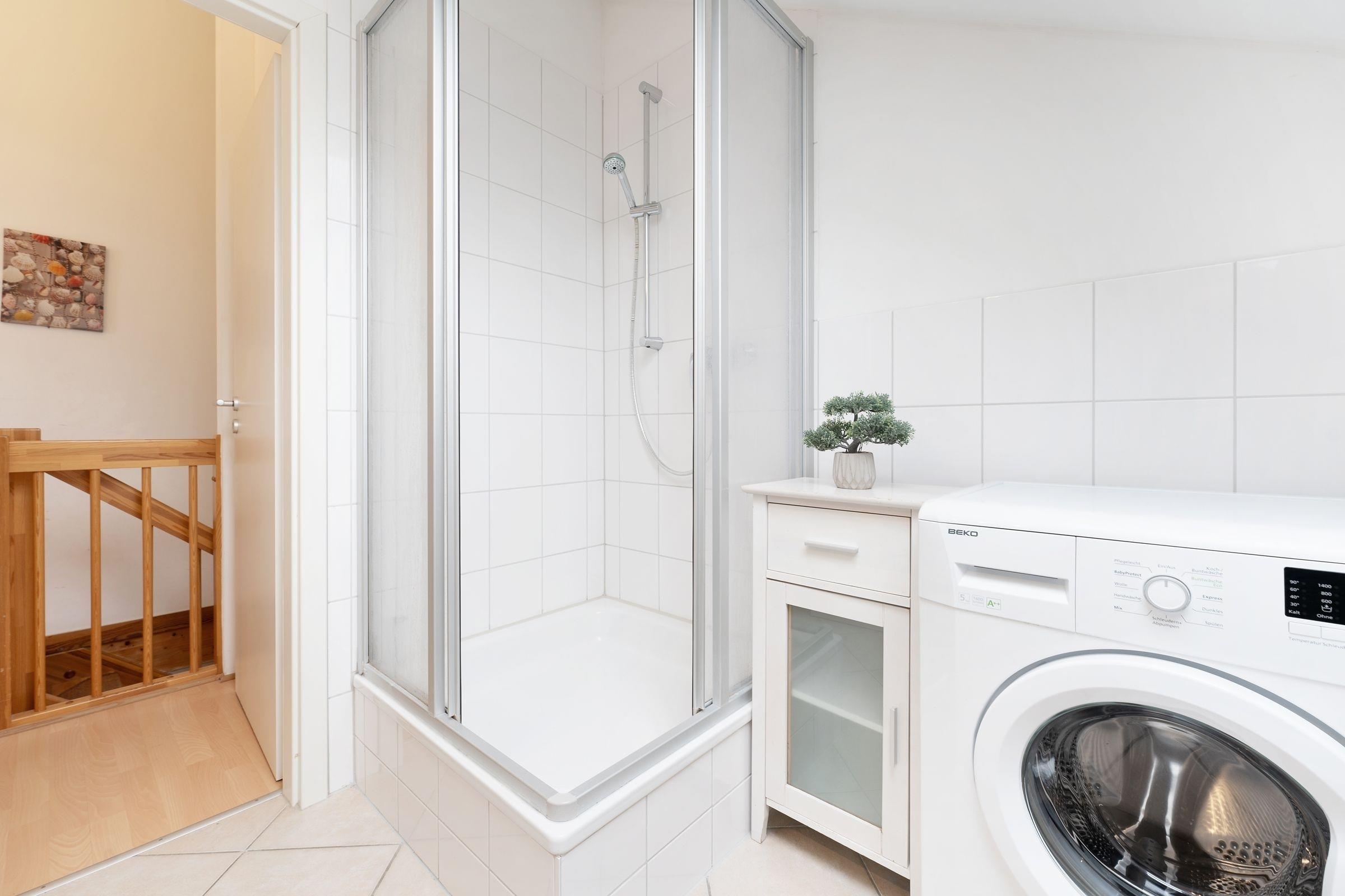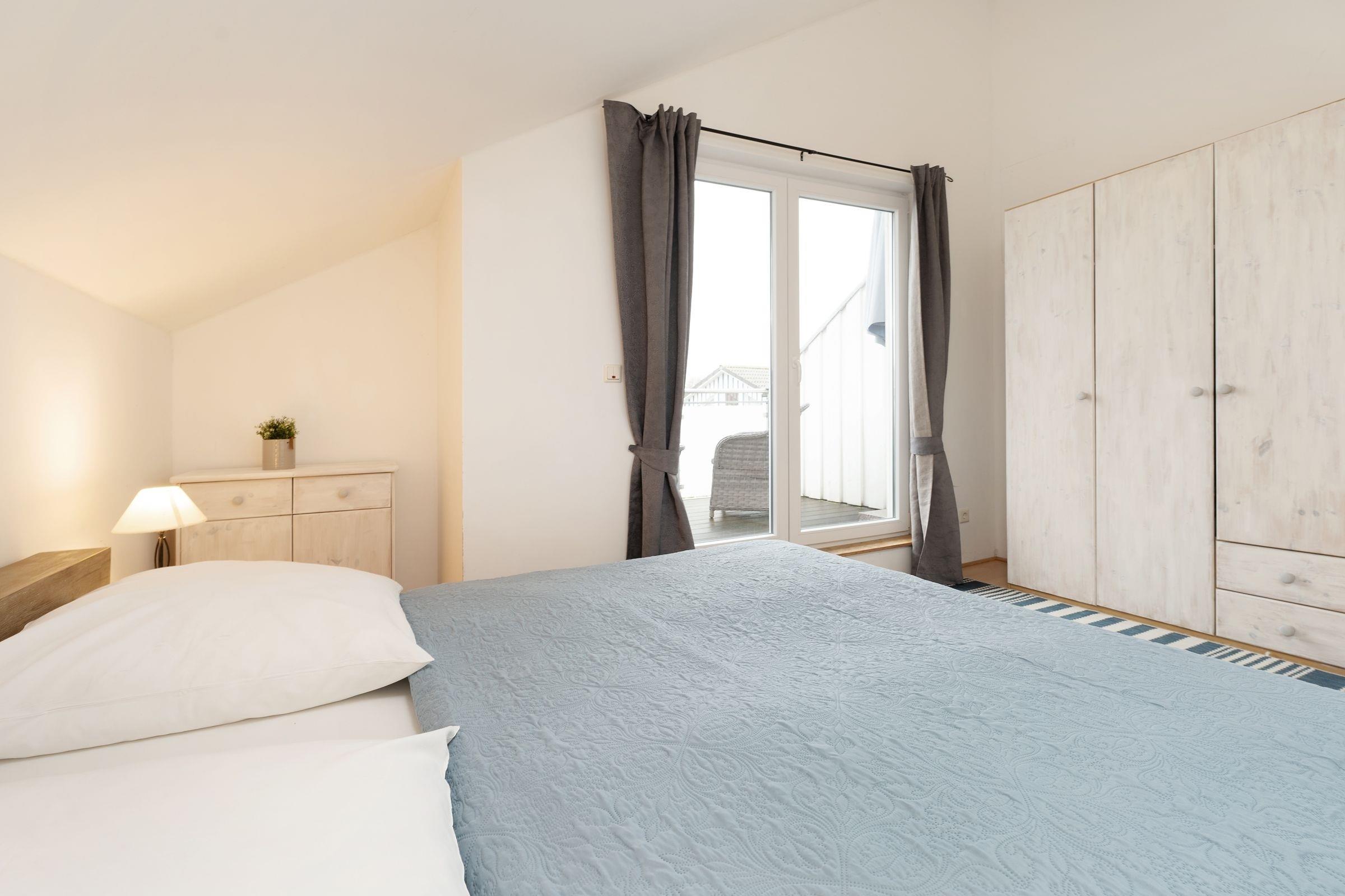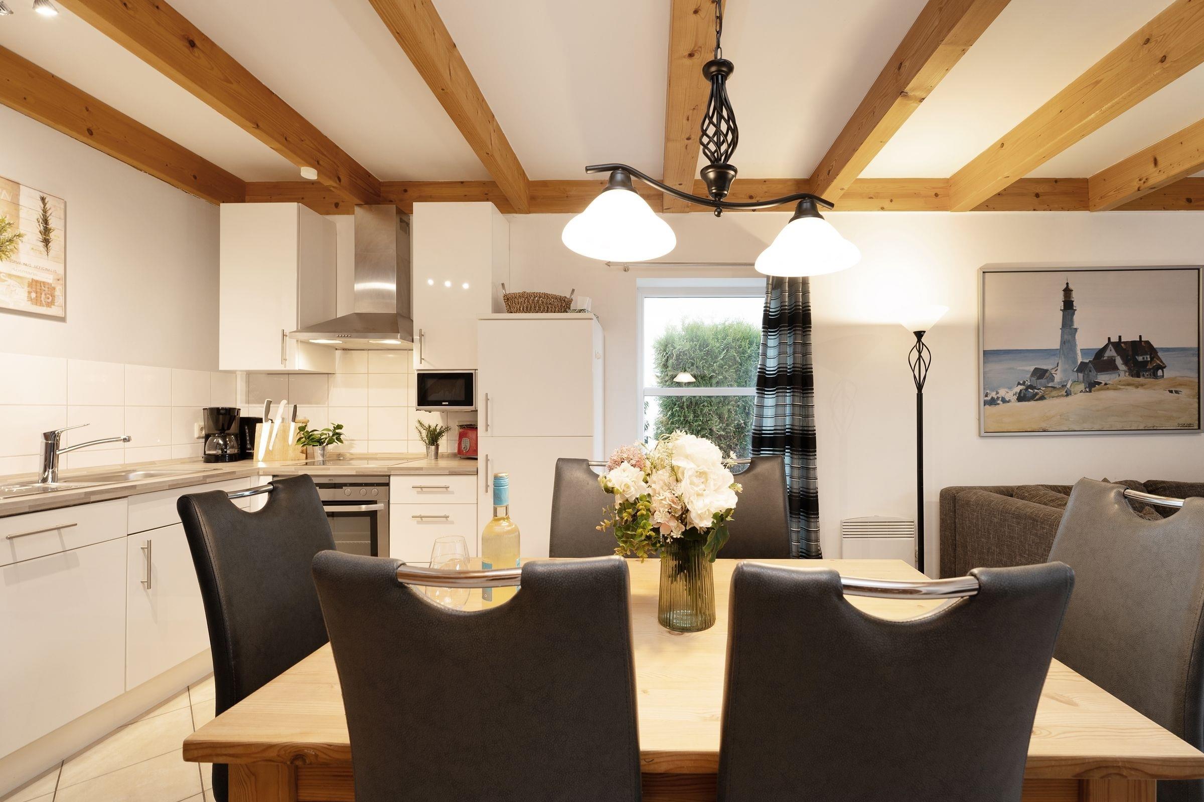Der großzügige Wohn- und Essbereich mit Kaminofen und offener Küche wird Sie begeistern. Hier finden Sie alles, um in gemütlicher Atmosphäre wertvolle Familienzeit zu genießen. Die Süd-Terrasse trägt die Meeresbrise hinein, der kleine Garten hinter dem Haus mit Grillecke und Sonnenliegen rundet den Strandtag ab. Das Sofa lässt sich abends für 2 Gäste in eine Schlafstätte (ca. 150x200 cm) verwandeln. Im Obergeschoss finden Sie ein Schlafzimmer mit Doppelbett (2x 90x200cm) und Zutritt auf den großen, möblierten Südbalkon sowie ein Schlafzimmer mit Kojen-Bett und Einzelbett (je 90x200 cm). Ebenso ein Duschbad mit Waschmaschine. Das Gäste-WC liegt im Erdgeschoss.