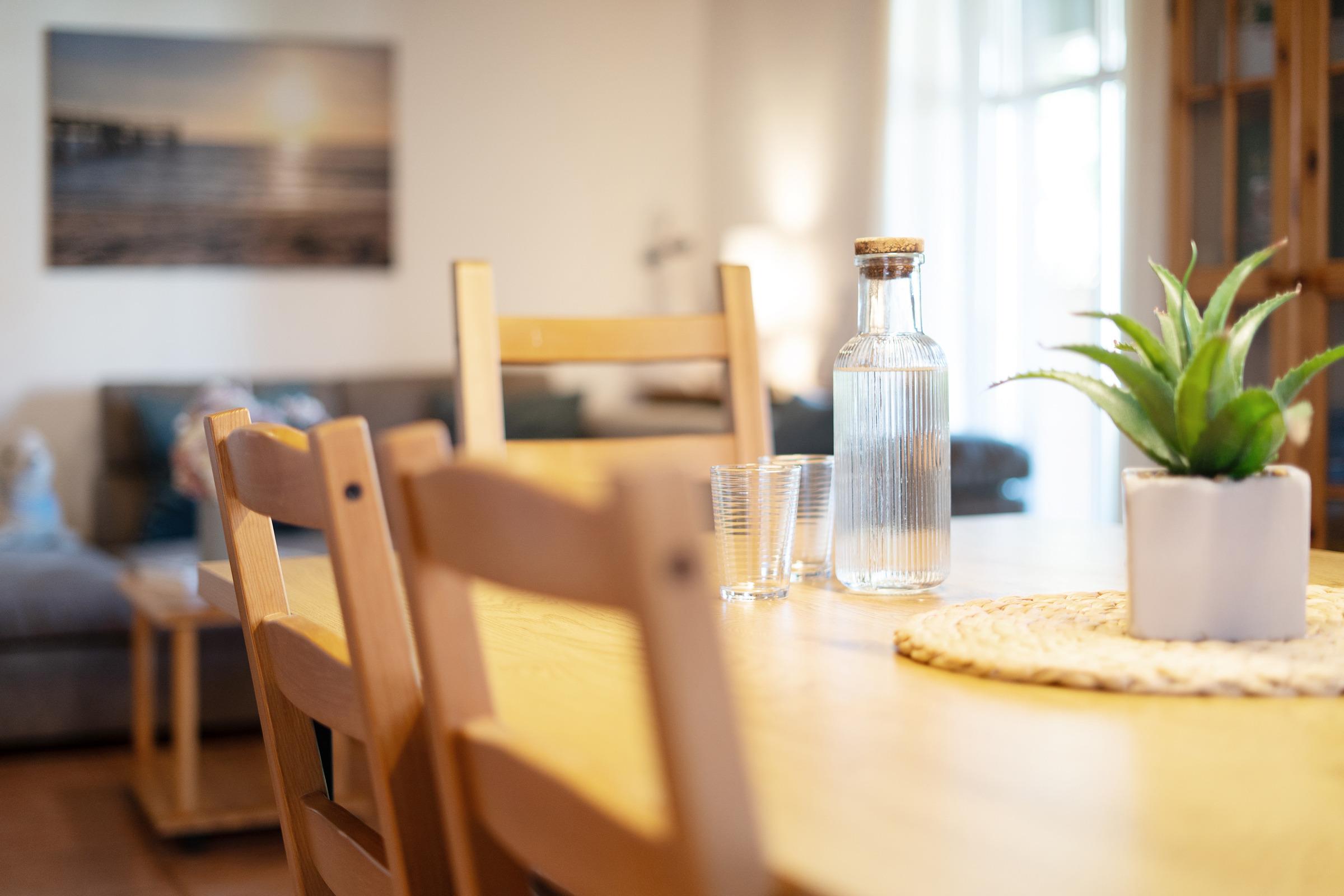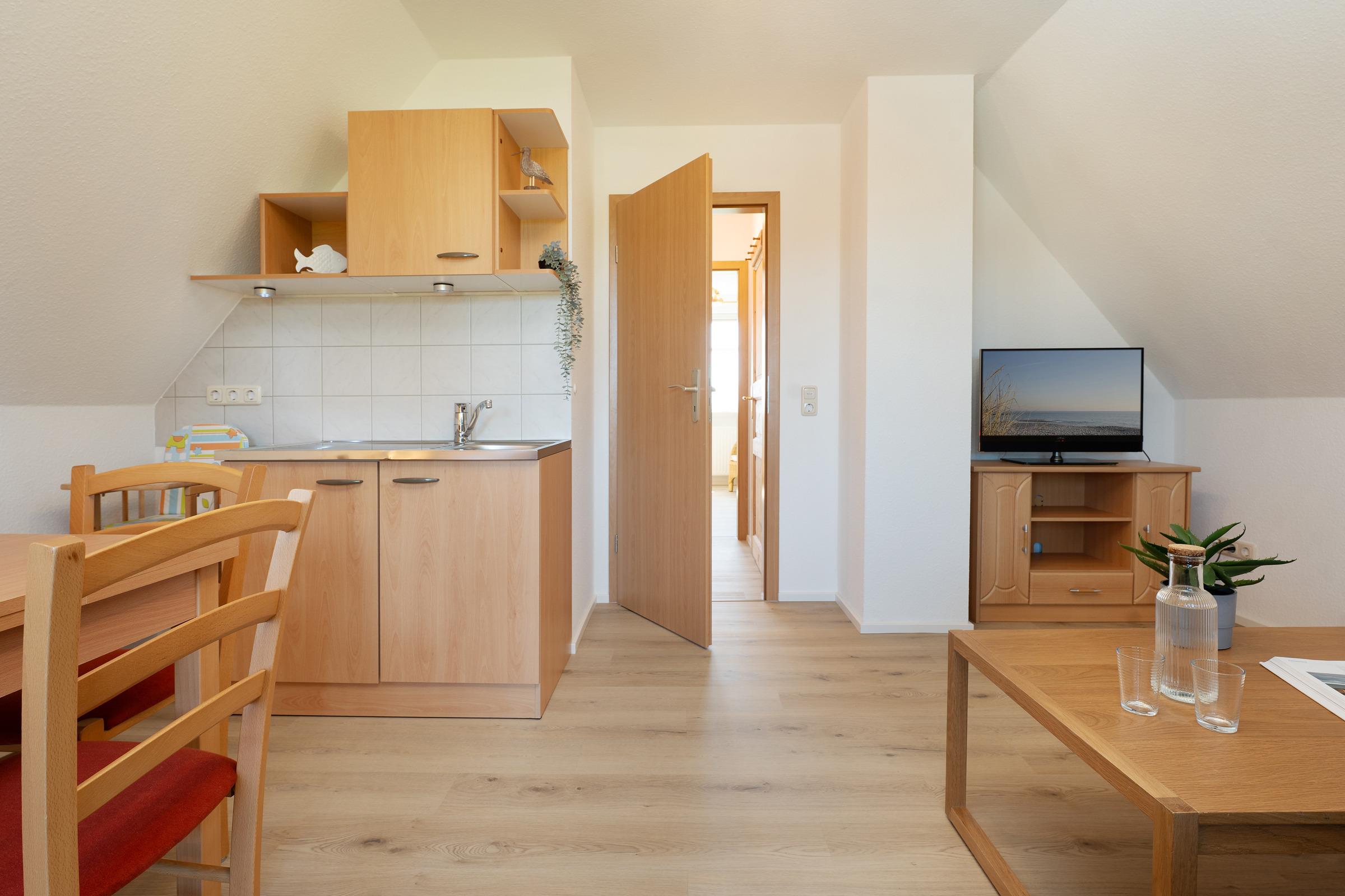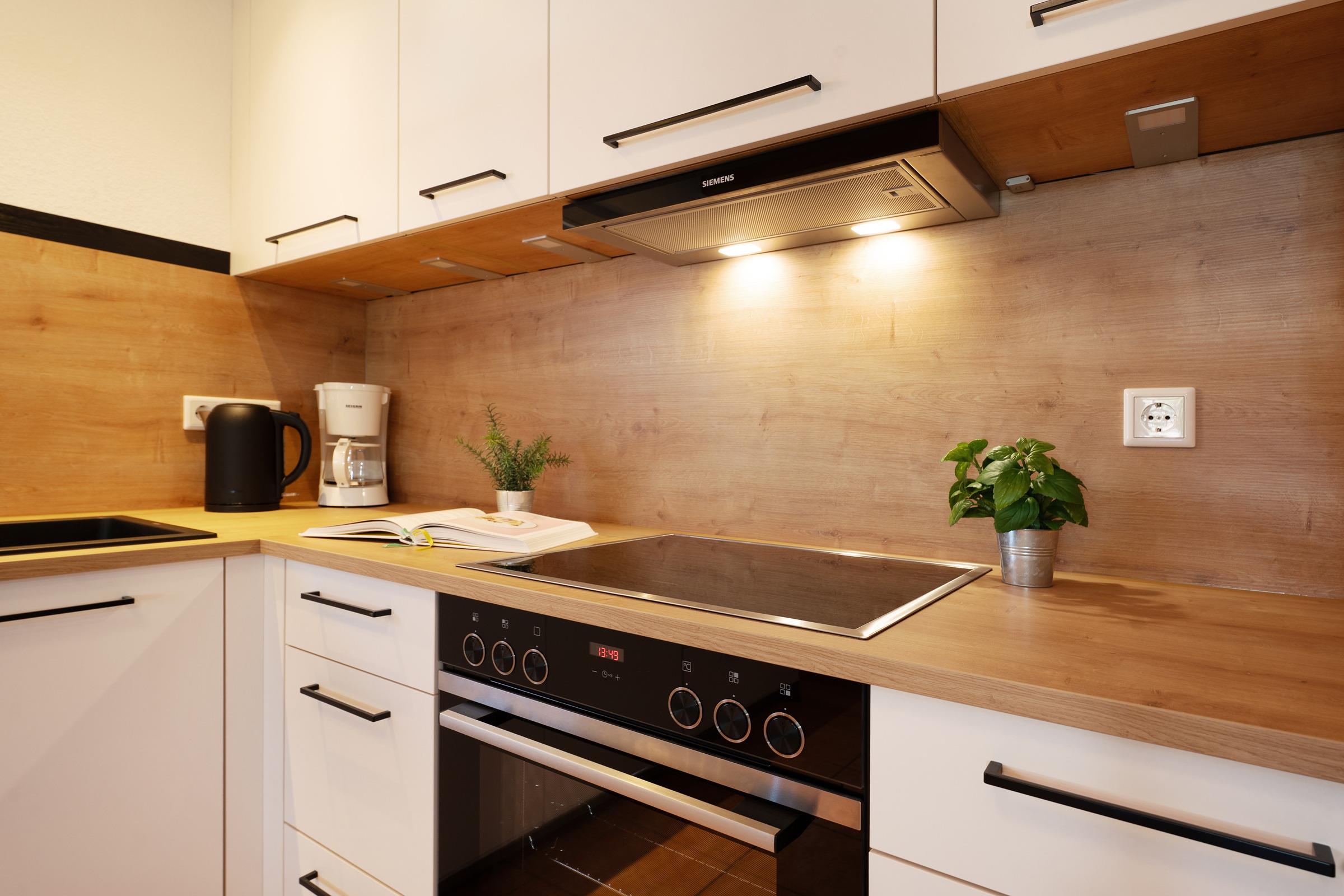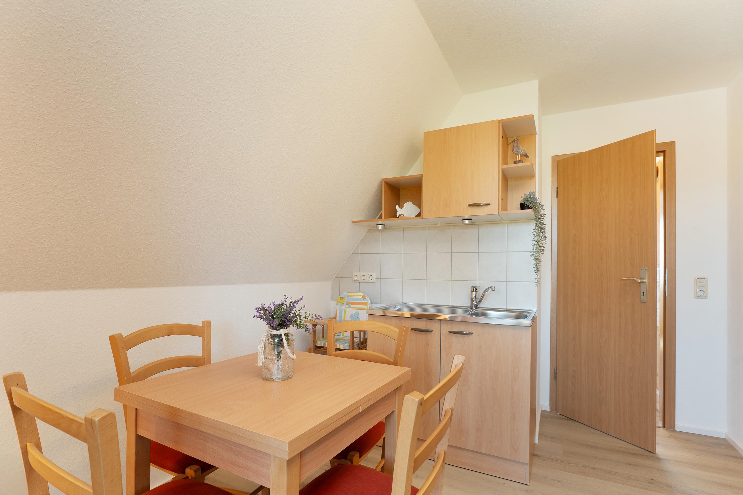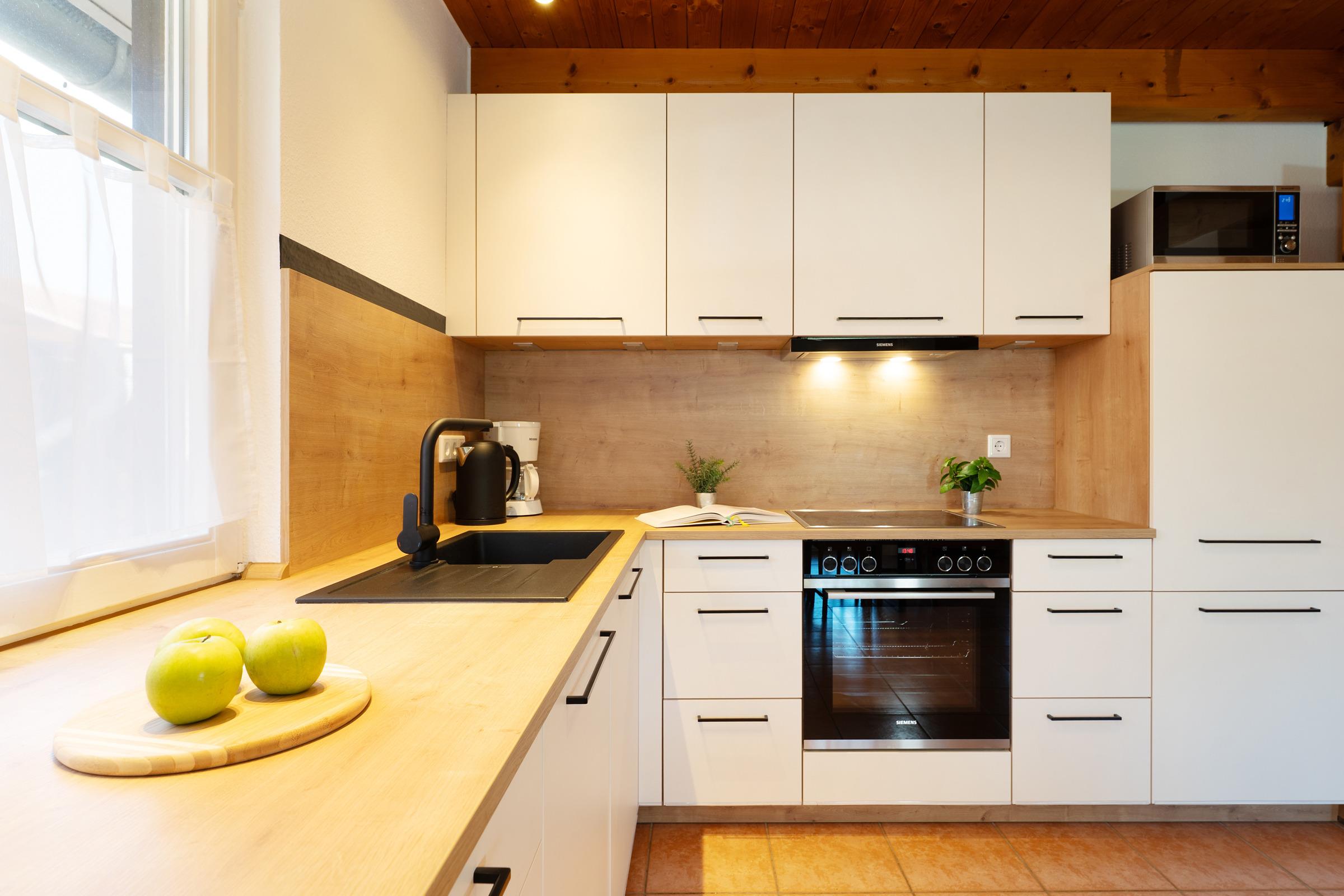 Die offene Küche ist voll ausgestattet mit Induktionsherd, Backofen, extra Gefrierschrank, Kaffeemaschine und Toaster. Der angrenzende Essbereich bietet ausreichend Platz für alle Gäste.
