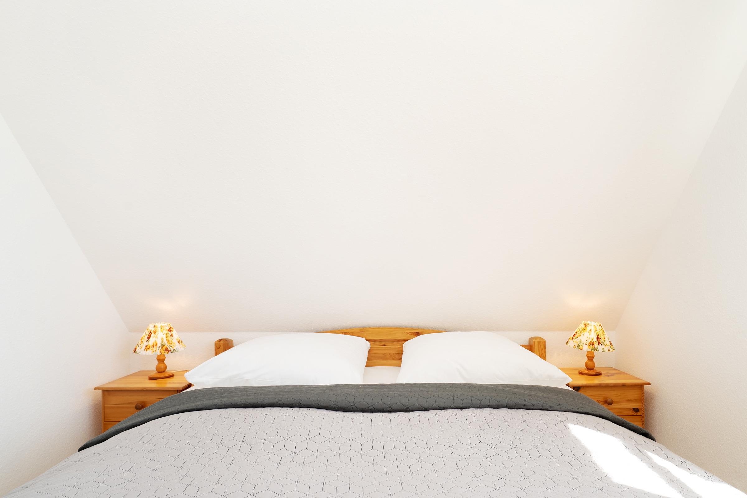 Schlafzimmer 2 (OG): 1 Doppelbett (2x 90x200 cm), Kleiderschrank, Verdunkelung: Rollo, Platz für ein Babybett vorhanden