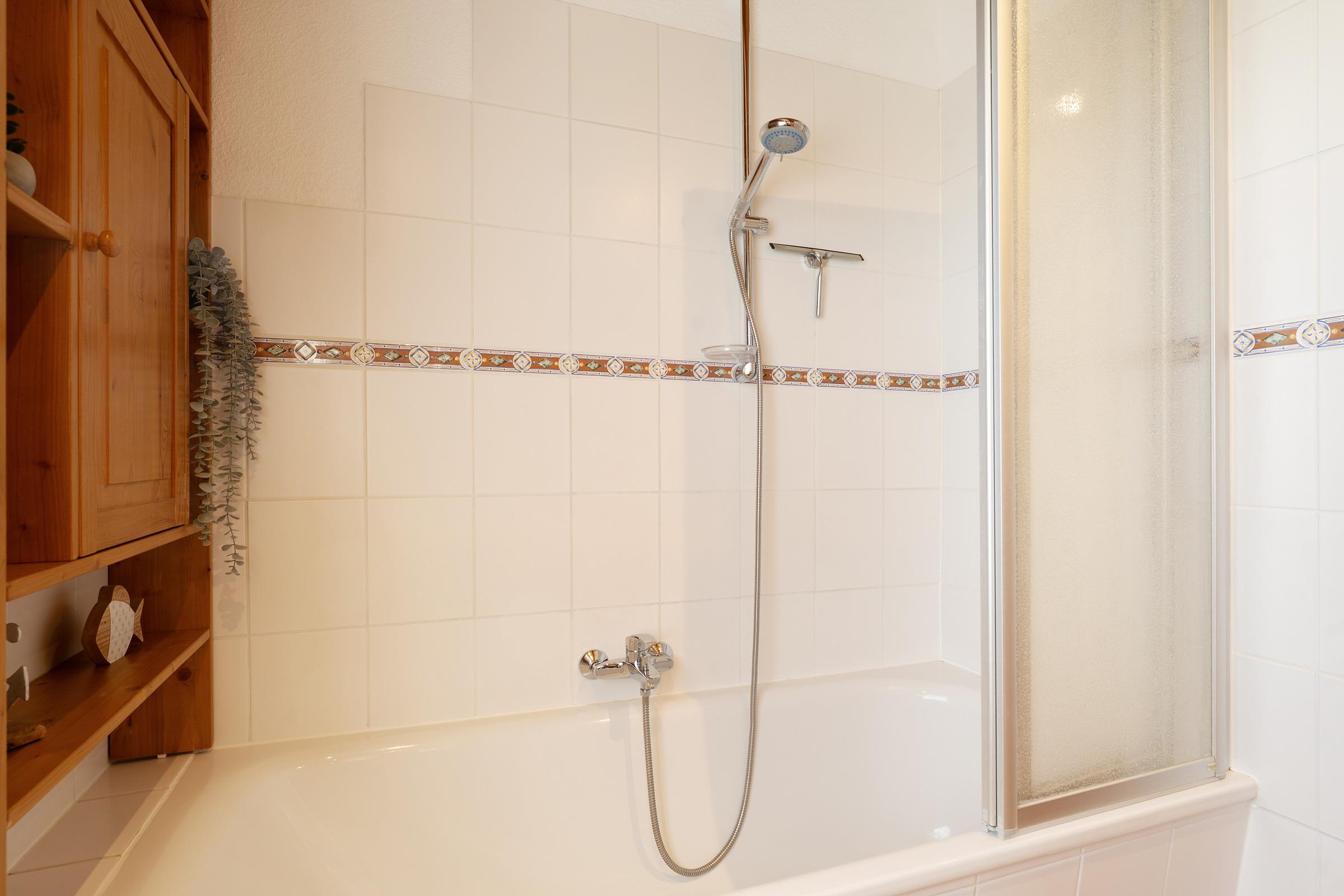 Die modernen Badezimmer sind eines mit Badewanne und eines mit Dusche ausgestattet. Ein beheizbarer Handtuchhalter und Haartrockner runden das Angebot ab.