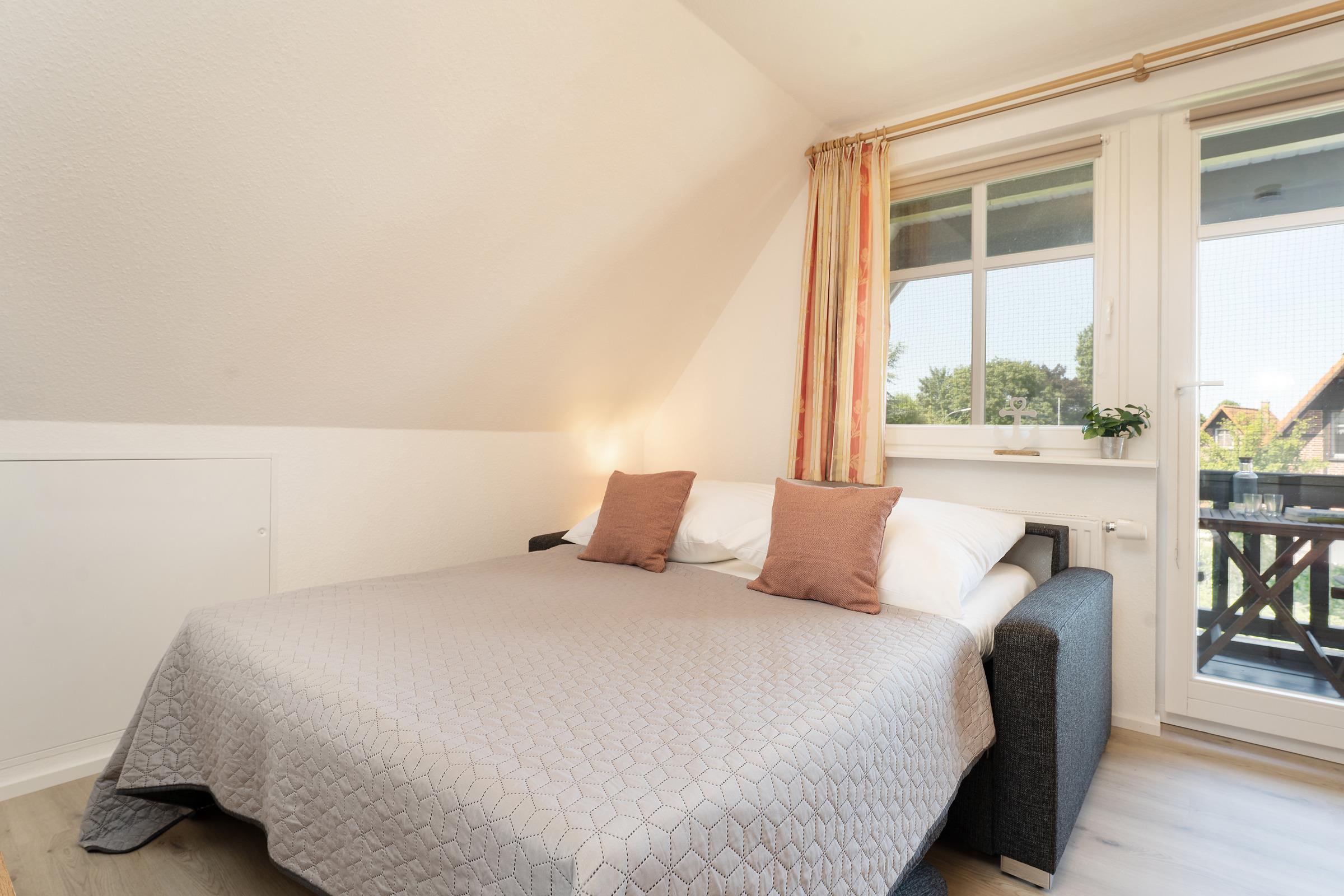 Schlafzimmer 3 (OG): 1 Schlafsofa (ca. 140x200 cm), Kleiderschrank, TV, Verdunkelung: Rollo, Platz für ein Babybett vorhanden