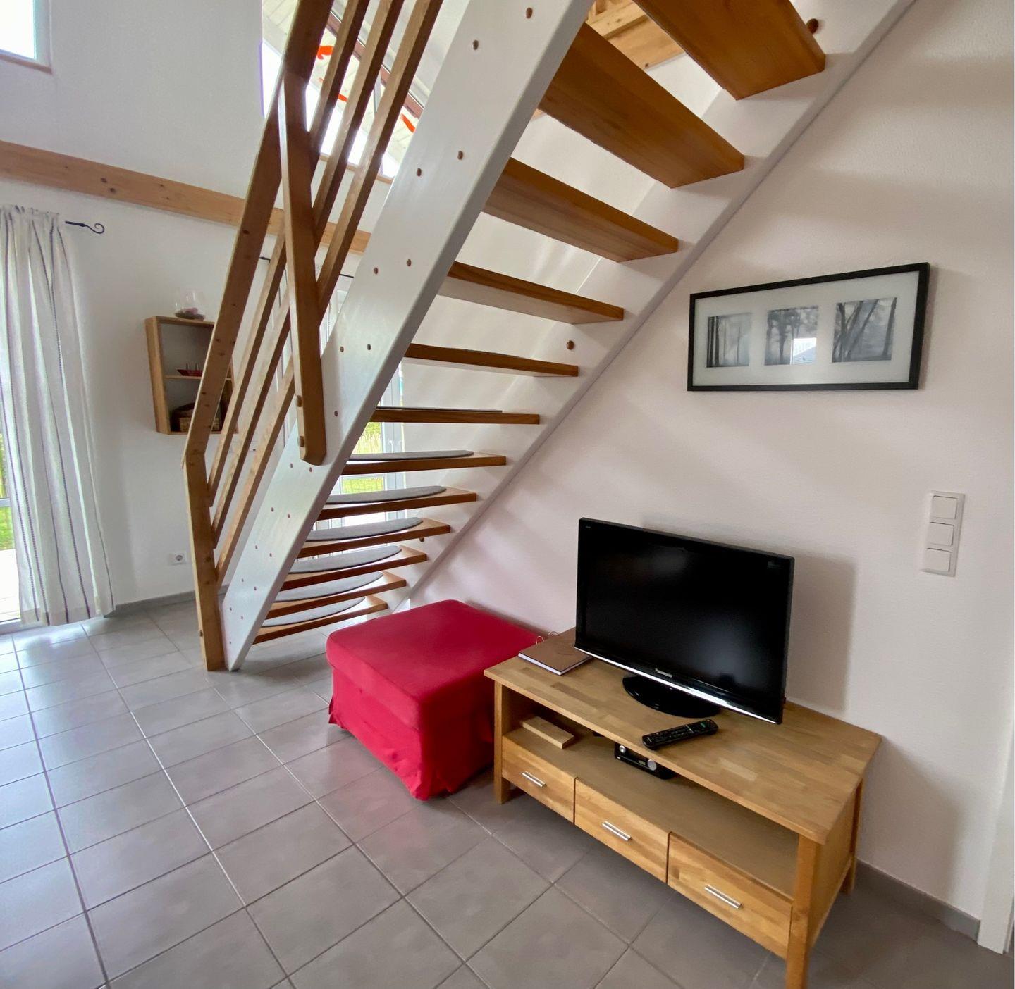 Im Wohnbereich mit TV und Audio können Sie es sich vor dem Kamin gemütlich machen. Über eine Treppe gelangt man zur offenen Galerie. Dort können Sie entspannen und den Blick über die Ostsee gleiten lassen. In diesem Haus werden Sie sich sehr wohlfühlen.