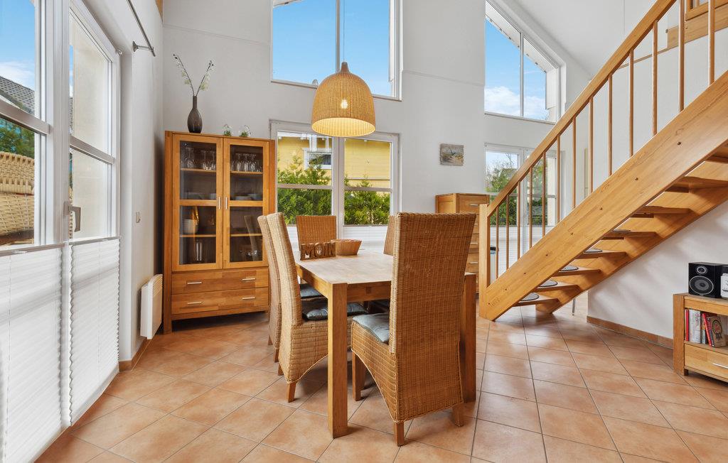 Vom Wohn/Essbereich (mit offener Küche und Kaminofen) erreicht man über eine Treppe die breite Galerie mit einem zweiten, großzügigen Wohnbereich (22 m²). Von hier aus können Sie eine Panorama-Aussicht über die Ostsee genießen. Im Erdgeschoss befinden sich zwei Schlafzimmer und zwei Bäder. Auf der Galerie befindet sich ein zusätzliches Doppelbett. Das Haus verfügt zudem über einen Balkon sowie eine große Terrasse mit Gartenmöbeln und eigenem Grill.
