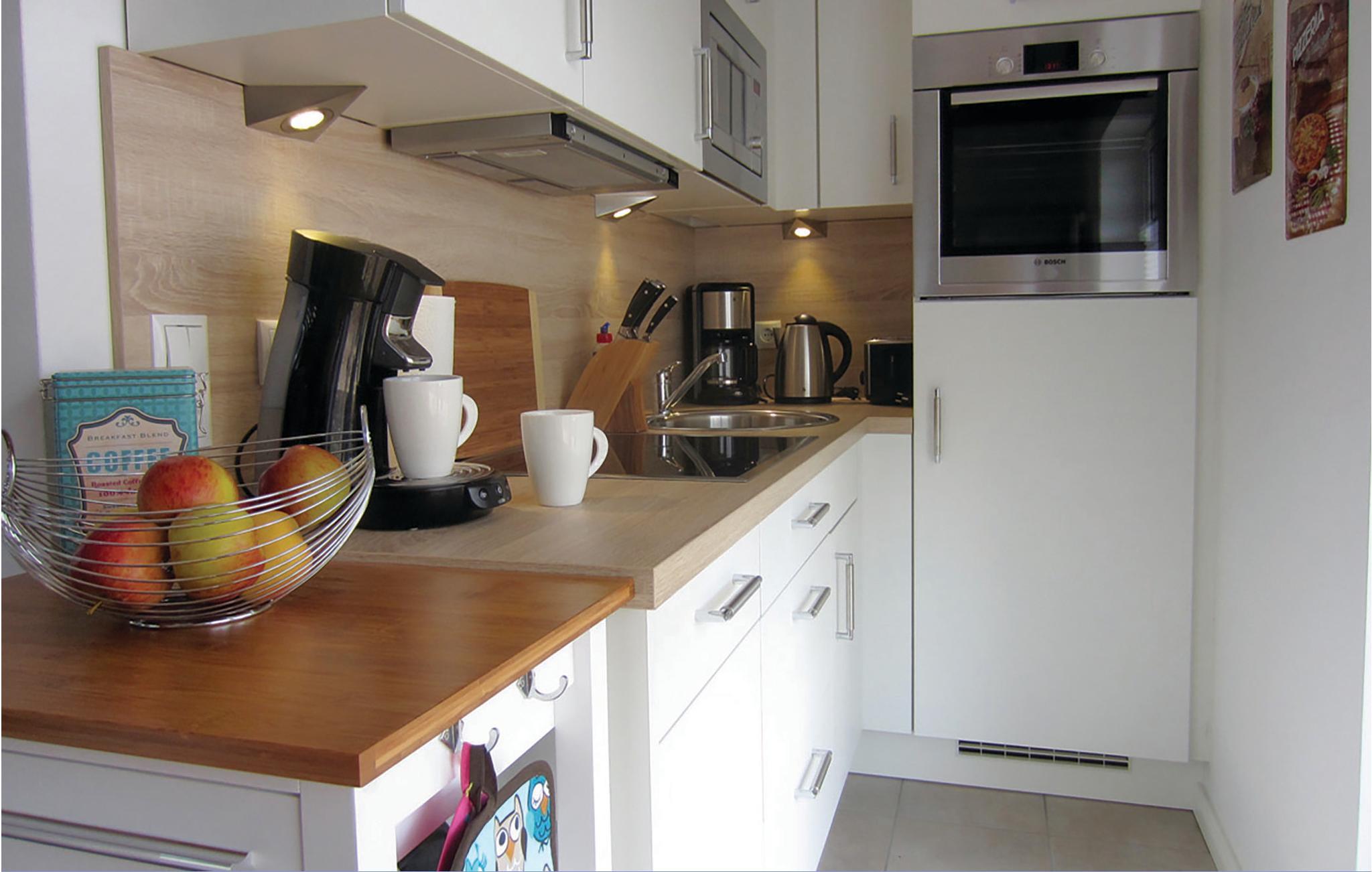 Für Kaffeeliebhaber steht in der voll ausgestatteten Küche neben einer Filterkaffeemaschine auch eine Senseo®-Kaffeemaschine zur Verfügung. Die moderne, komplett ausgestattete Küche mit Induktionsherd lädt zu Kochabenden mit der ganzen Familie ein. Ein Abstellraum unter der Treppe dient als Stauraum z.B. für Ihre Koffer.
