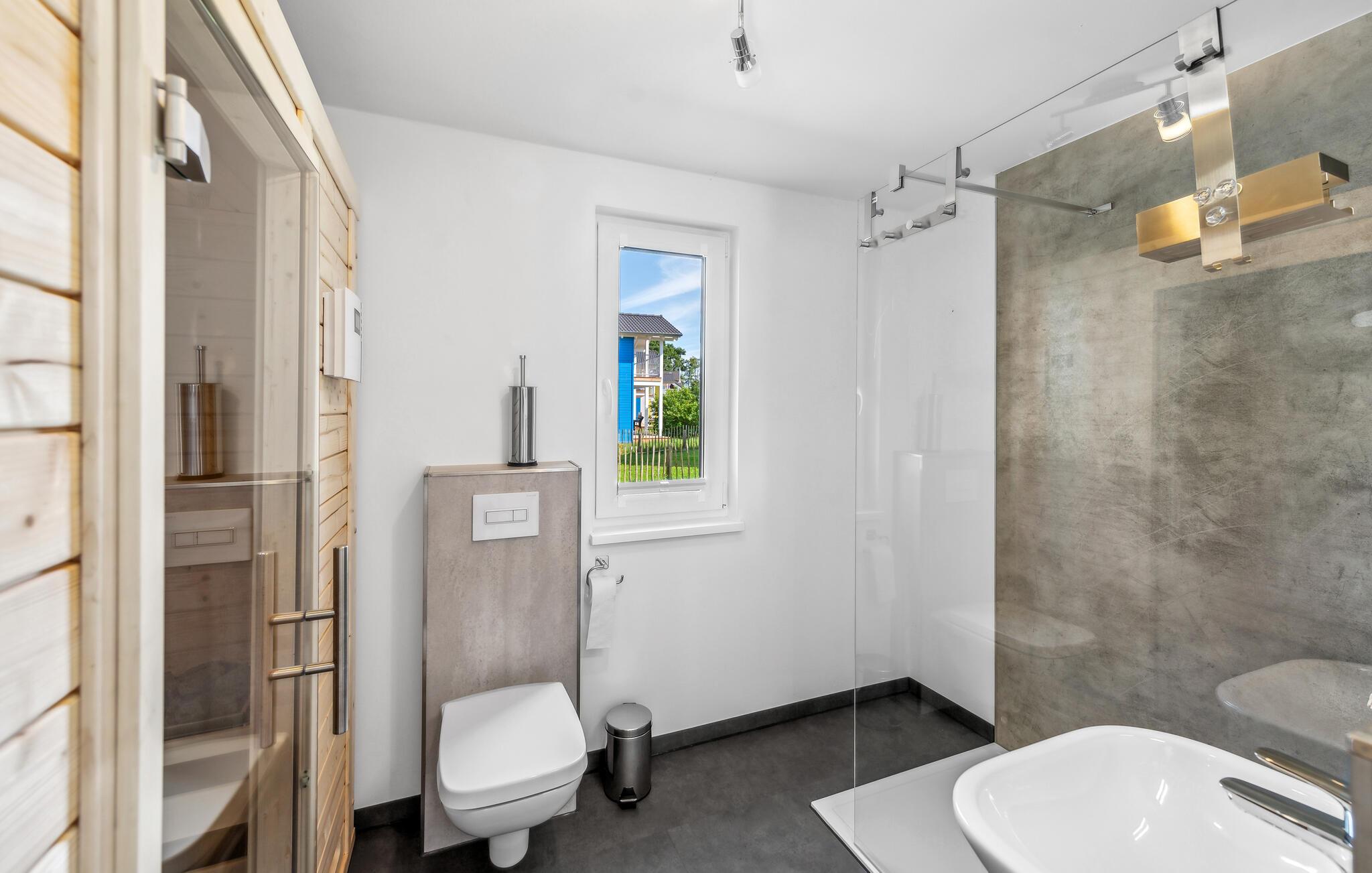 Ihr Haus erstreckt sich dort über zwei Etagen. Im Erdgeschoss befindet sich ein offener, gemütlicher Wohnbereich mit angrenzender Terrasse, eine moderne Einbauküche sowie ein Duschbad mit einer Sauna. Im ersten Stock lädt ein geräumiger Balkon zum Verweilen ein. Zudem befinden sich auf dieser Ebene zwei Schlafzimmer und ein Badezimmer. Hier können Sie die schöne Ostseeluft und einen tollen Blick auf das Feriendorf von dem Balkon genießen. Hochwertige Möbel und eine gelunge Raumaufteilung machen dieses Ferienhaus zu einem traumhaften Urlaubsdomizil in ruhiger Umgebung.