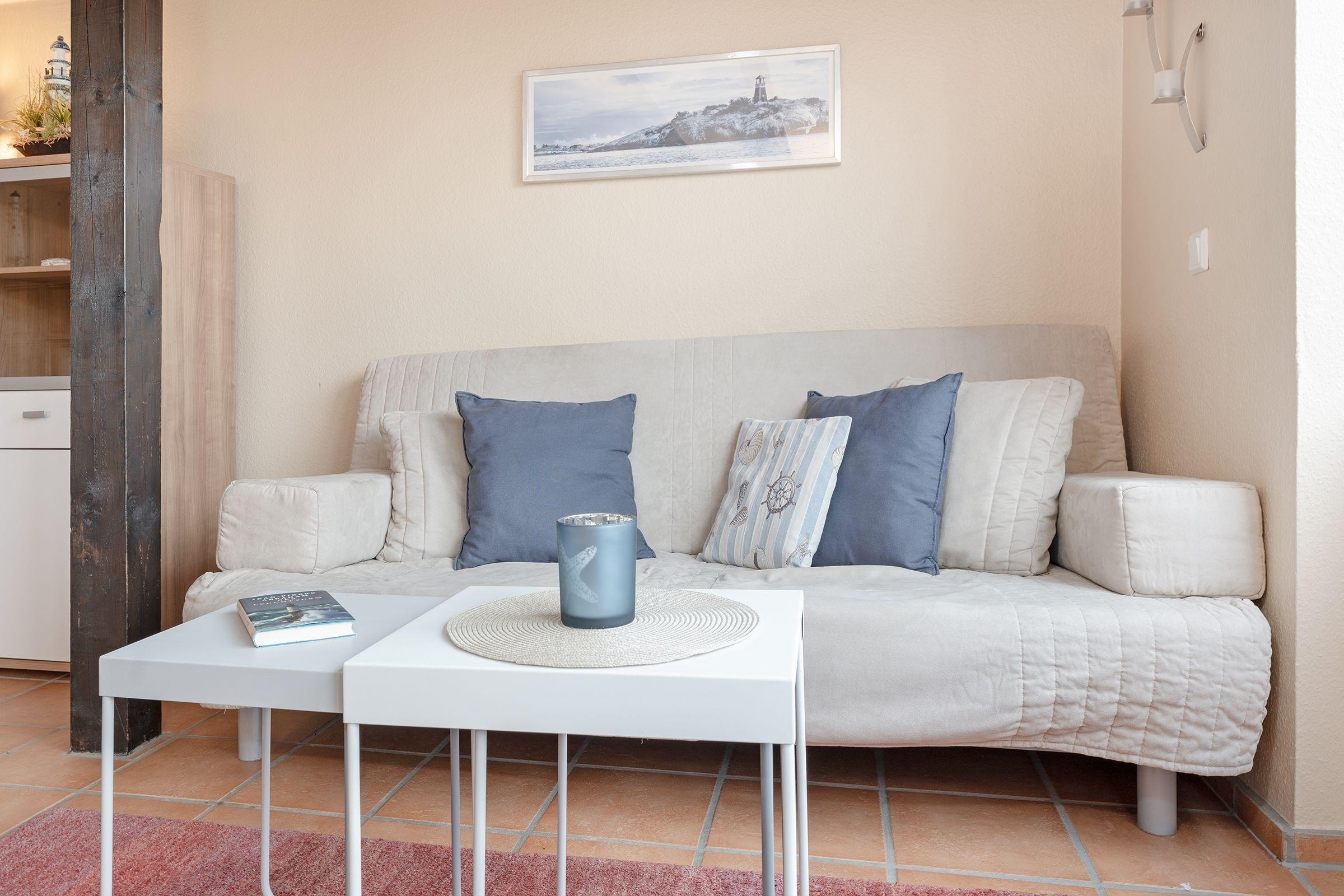 Wohnzimmer (EG): 1 Schlafsofa (140x200 cm), Platz für ein Babybett vorhanden