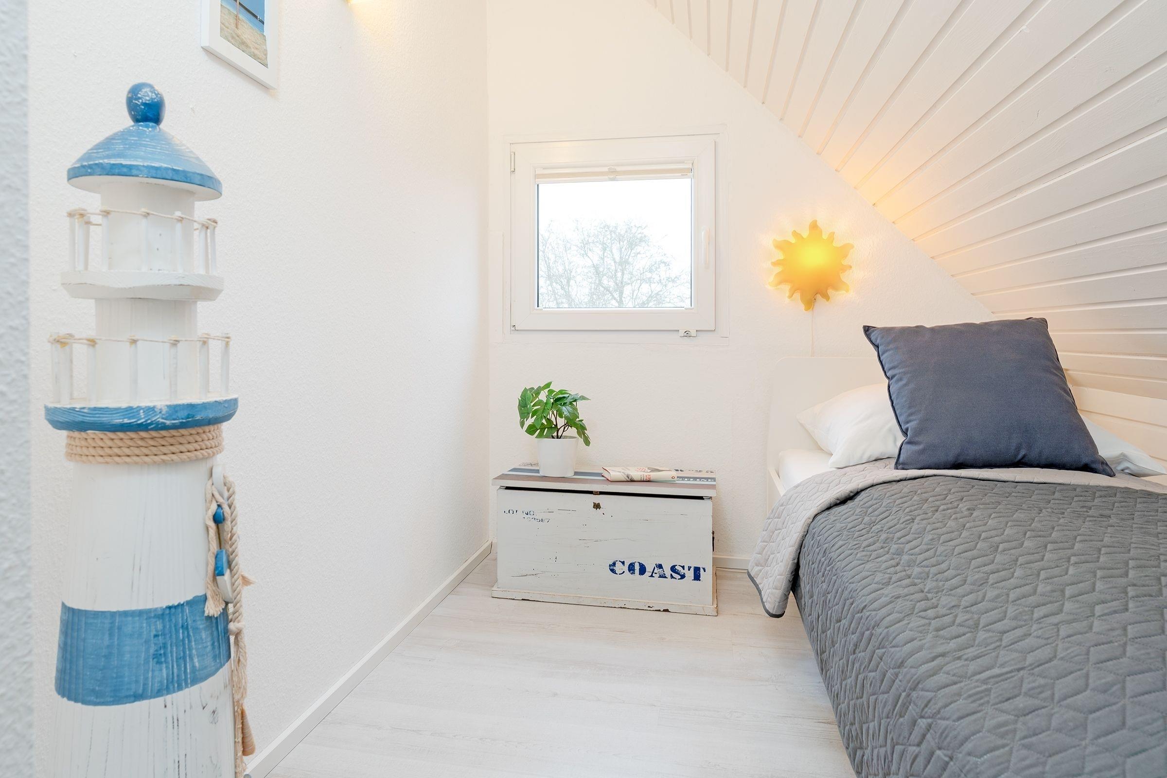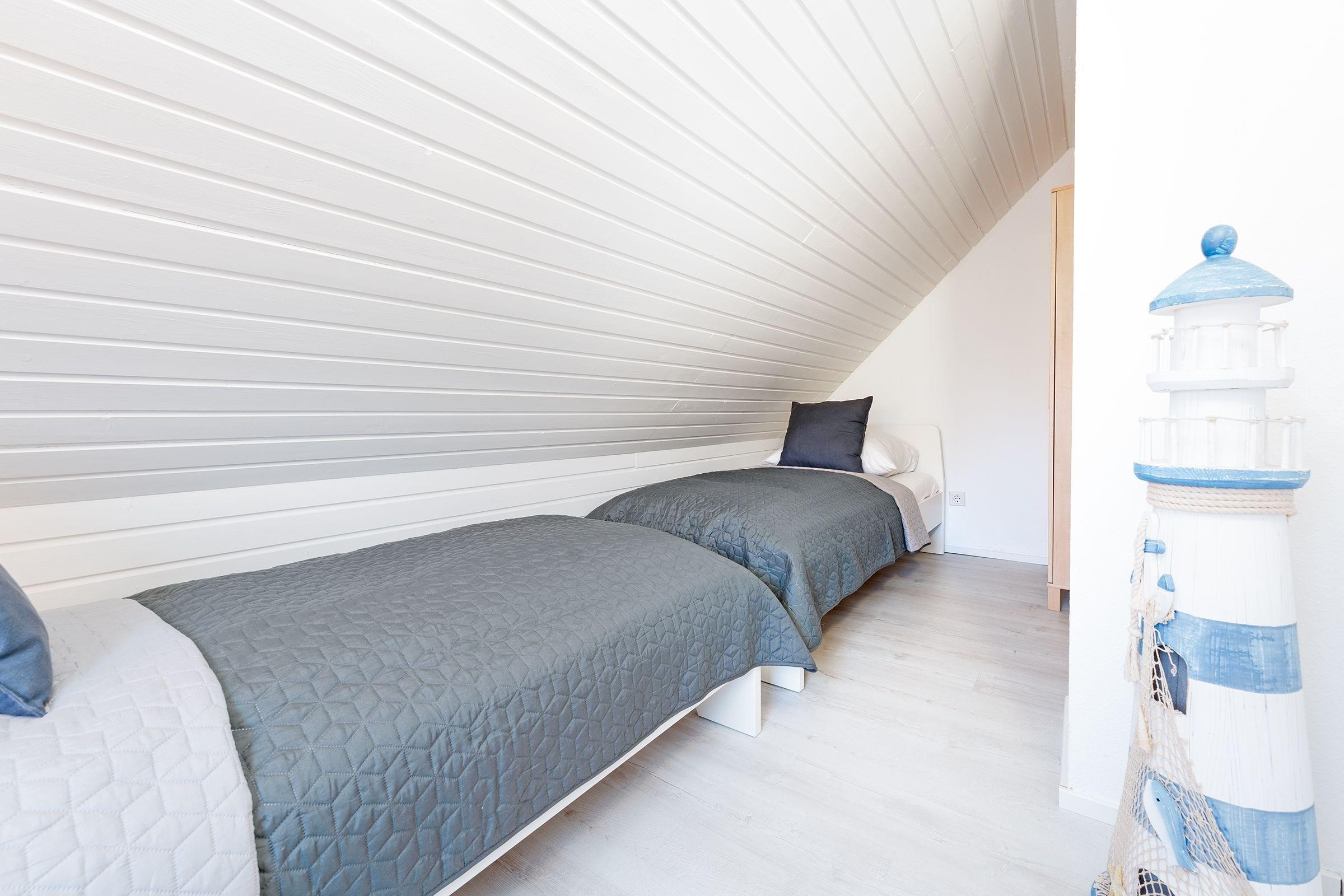 Schlafzimmer 2 (OG): 2 Einzelbetten (je 90x200 cm), Verdunkelung: Rollo, Platz für ein Babybett vorhanden
