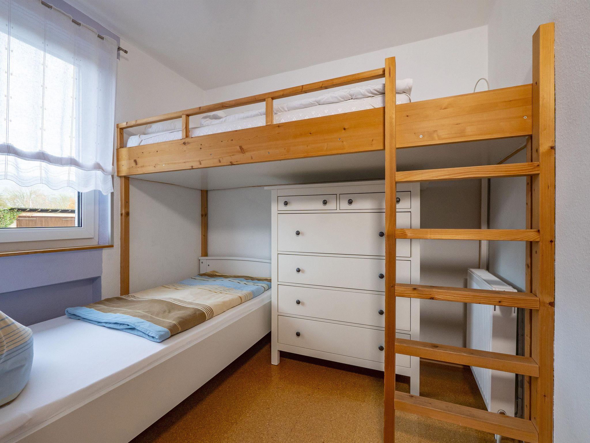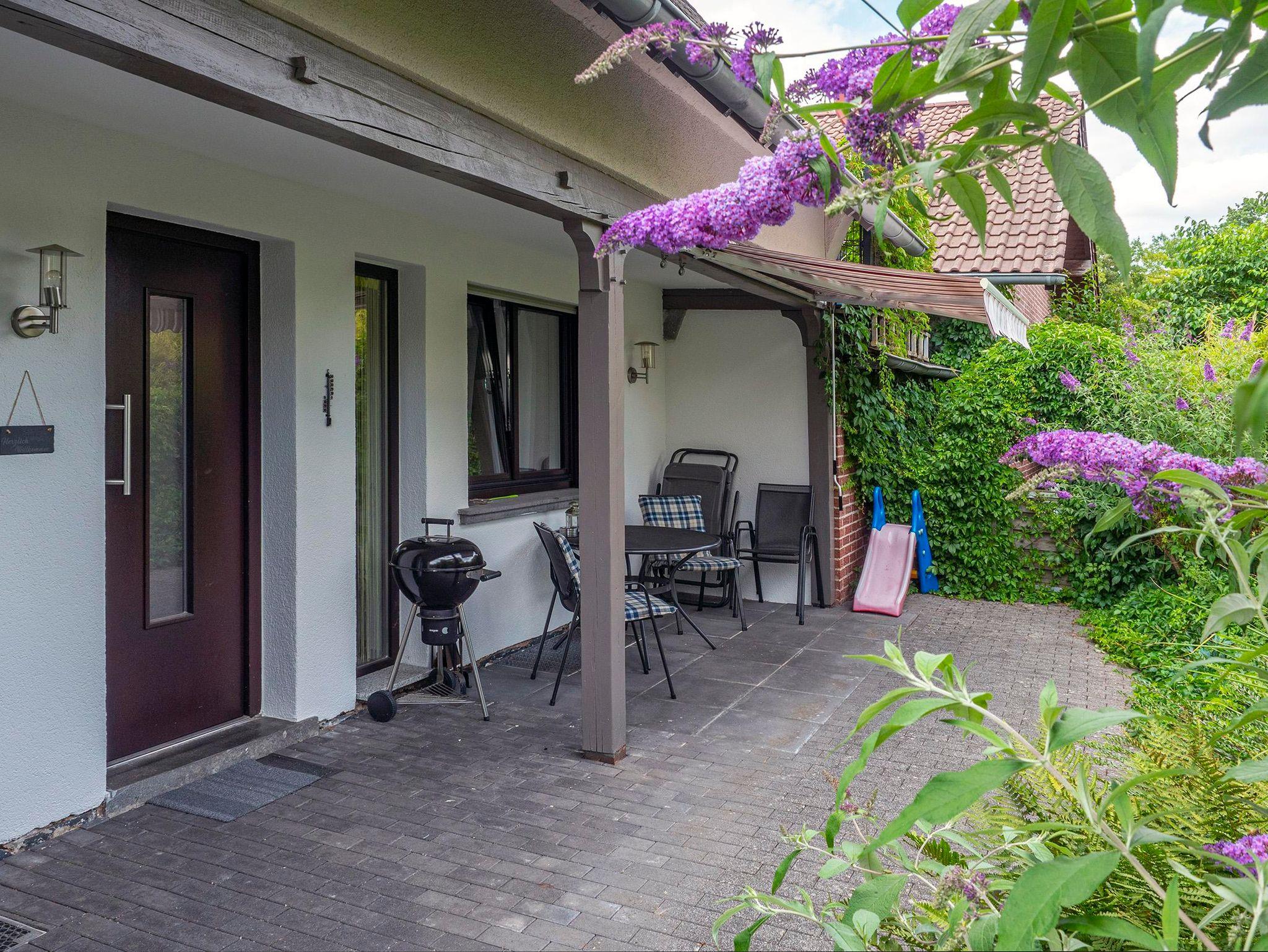 Rauchfreie neu eingerichtete Ferienwohnung für 3 Erwachsene oder 2 Erwachsene + 2 Kinder bis 14 Jahre. Sep. Eingang, 2 sep. Schlafräume - eins davon mit Etagenbett - komplett eingerichtete Küche mit Essecke, Wohnzimmer, 1 Bad mit Dusche / WC, 1 Bad mit Wanne / WC, Terrasse mit Gartenmöbeln und Grillmöglichkeit, Sandkasten und Schaukel, Sat-TV, Internet-Anschluss kostenlos. Hund erlaubt (5,00 € pro Tag)