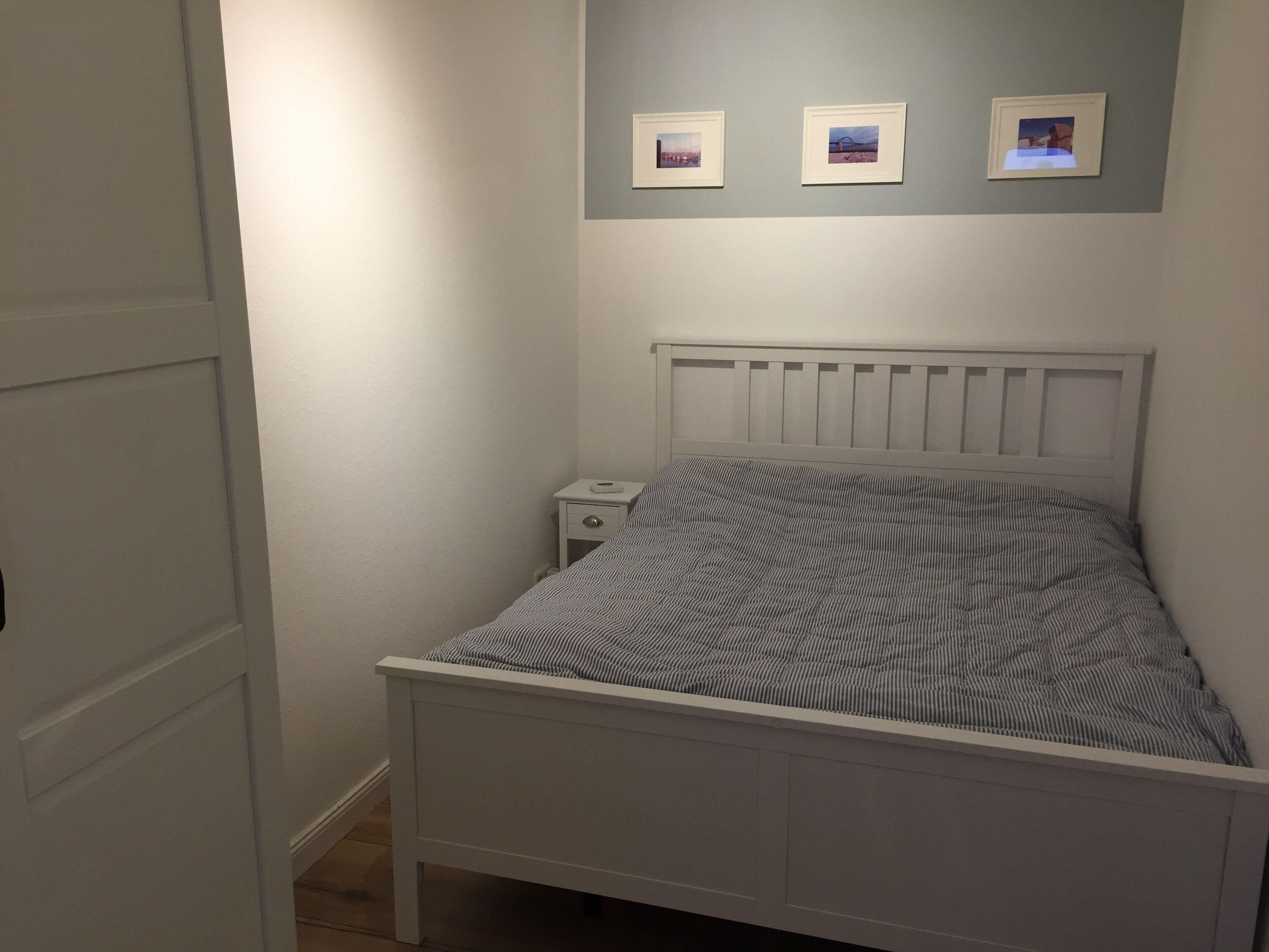 In dem durch eine Tür abgetrennten Schlafzimmer findet ihr ein 1,60 x 2,00 m großes Bett mit einzelnen Matratzen. Von dem raumhohen, geräumigen Kleiderschrank mit Bügeln und Schubladen stehen euch 2/3 zur freien Verführung.