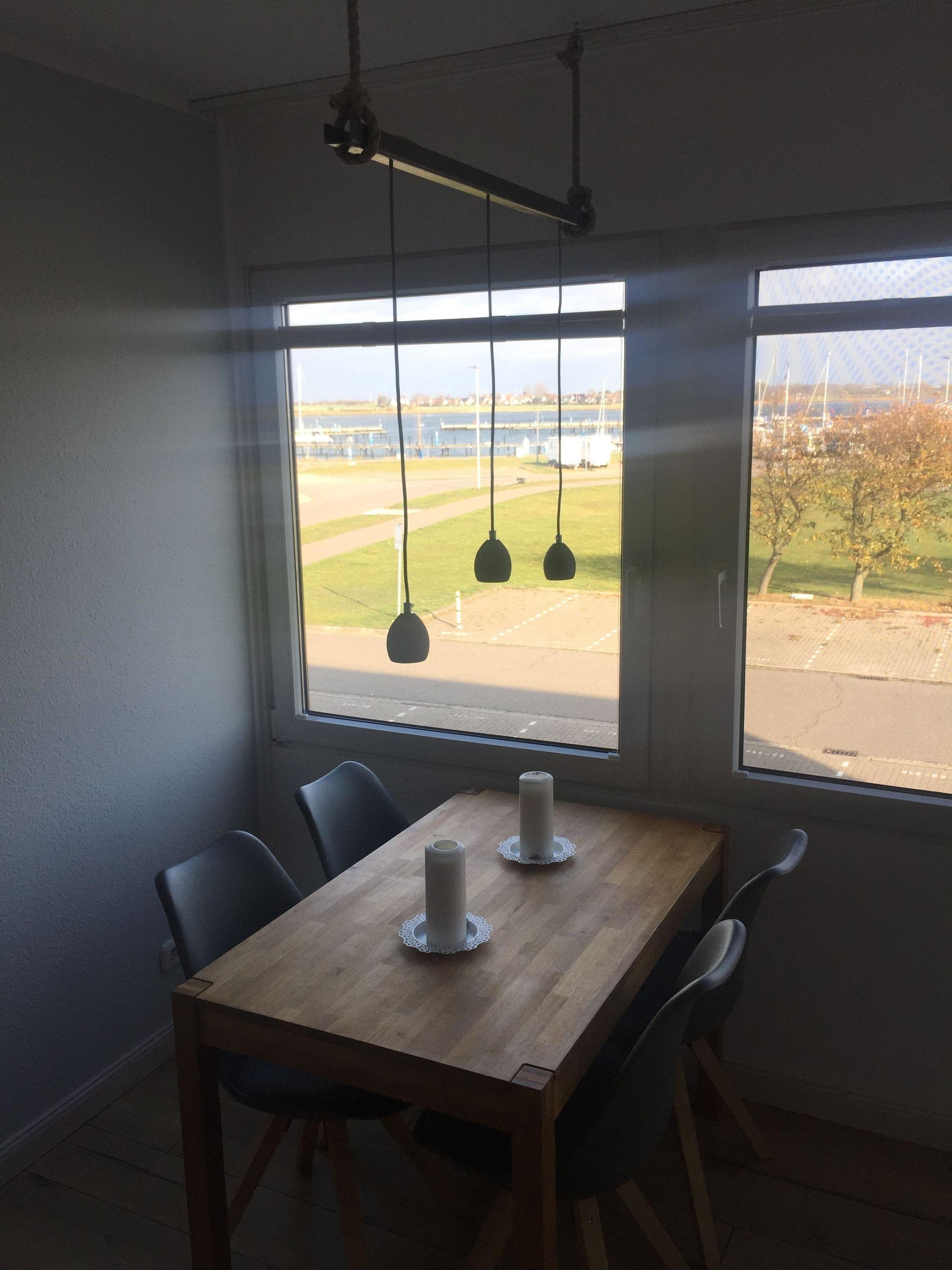 Das Wohnzimmer lädt zum entspannen ein mit direktem Blick vom Esstisch auf das Treiben im Hafen. Außerdem könnt ihr es euch auf dem gemütlichen Sofa vor dem 46 Zoll TV bequem machen.