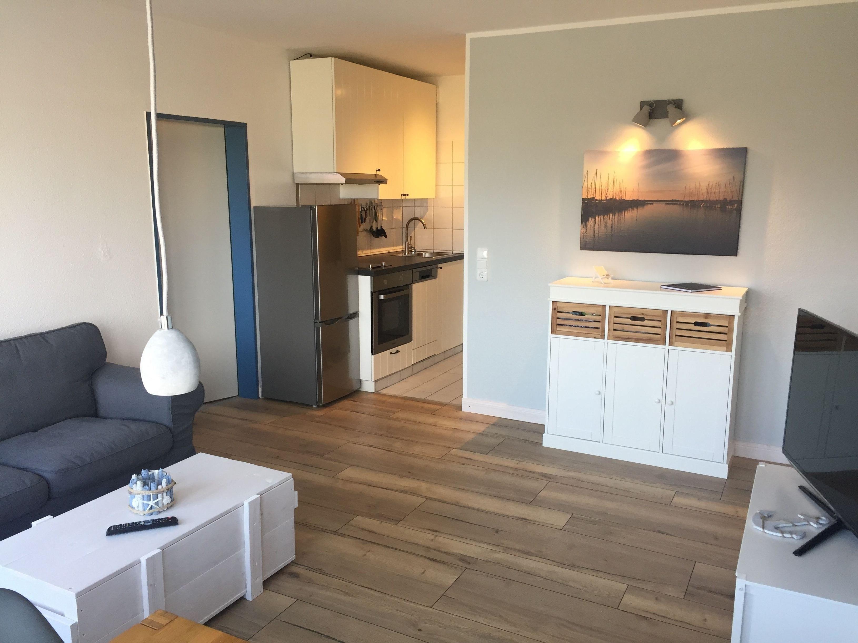 Gemütliches Apartment direkt am Südstrand mit Hafenblick und moderner Ausstattung für erholsamen Urlaub.