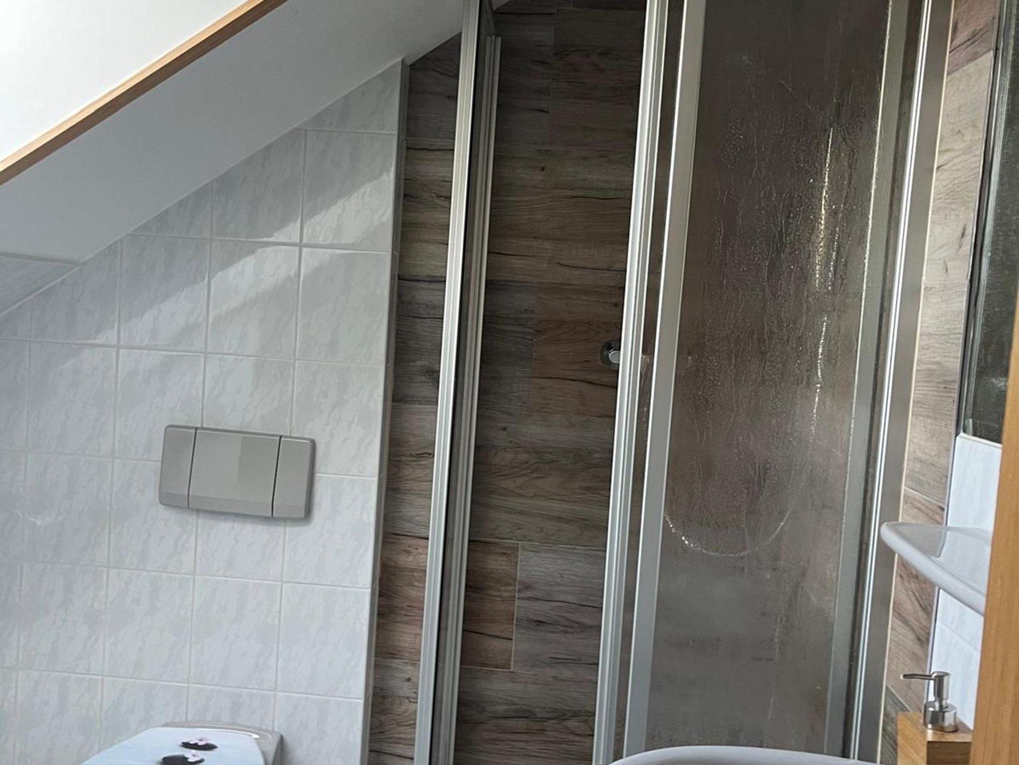 Das Duschbad hat ein Fenster zum Garten und ist geräumig. Ein Fön und ein Kosmetikspiegel sind vorhanden.