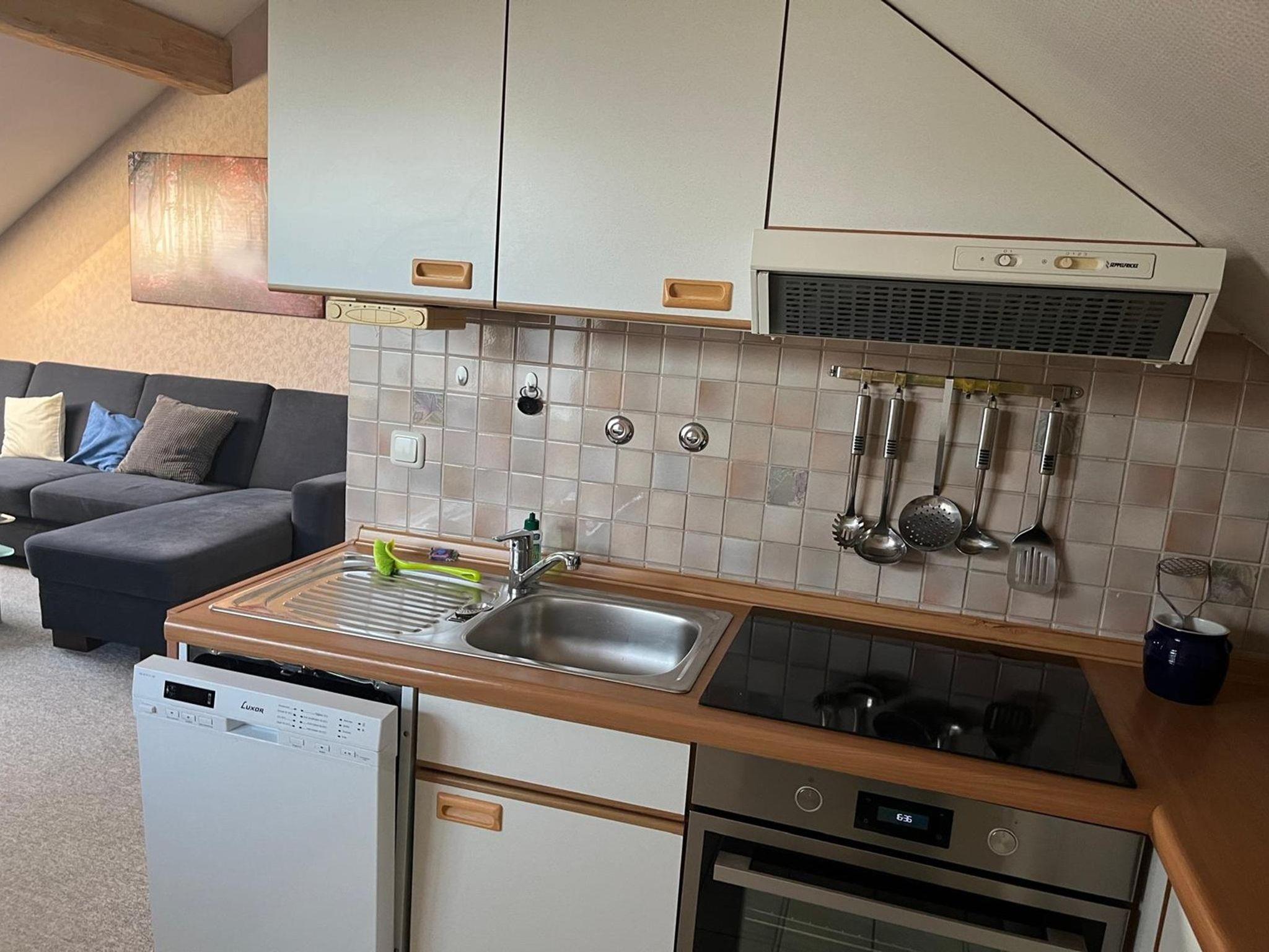 Die Küche ist ausgestattet mit einem 4-Sterne-Kühlschrank, Geschirrspüler, Kaffeemaschine, Toaster, Wasserkocher, 4-Platten-Herd mit Backofen, einem Mikrowellengerät und für 8 Personen Gläser, Geschirr, Töpfe und Besteck.