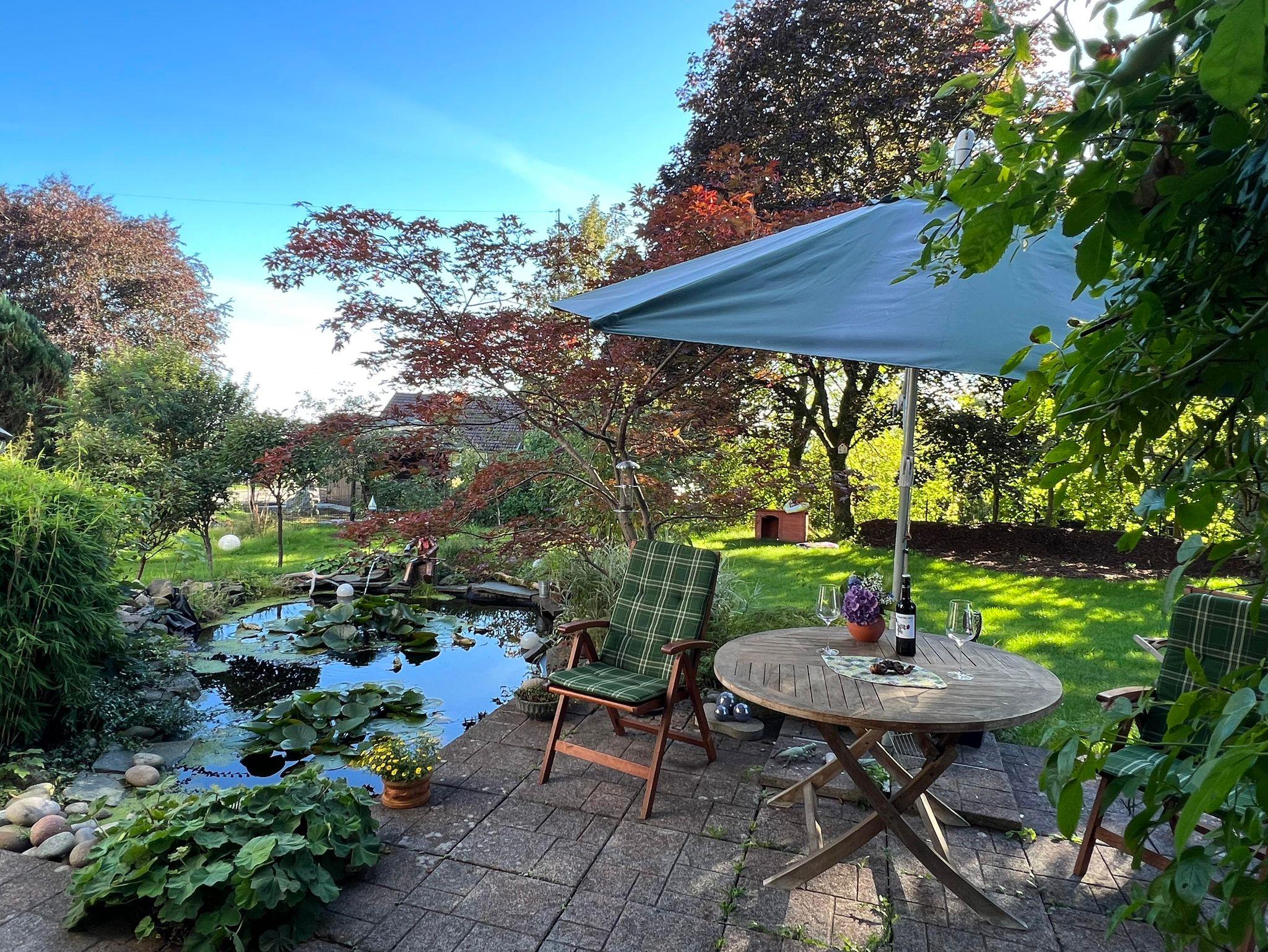Diese großzügige Ferienwohnung mit 90 m² bietet Platz für 1–6 Personen und ist ideal für Familien oder kleine Gruppen. Sie verfügt über zwei Schlafzimmer – eines mit Doppelbett und eines mit zwei Einzelbetten – sowie ein gemütliches Wohnzimmer mit ausziehbarem Schlafsofa für zwei Personen. Ein Zustellbett ist ebenfalls möglich. Das Wohnzimmer lädt mit Kamin zu entspannten Abenden ein und bietet direkten Zugang zur Terrasse und zum großen Garten mit idyllischem Gartenteich. Die modern ausgestattete Küche lässt keine Wünsche offen und bietet unter anderem Mikrowelle, Heißluftfritteuse und Geschirrspüler. Das seniorengerechte Bad ist mit Dusche und Handtuchwärmer ausgestattet. Für zusätzlichen Freizeitspaß steht eine Indoor-Tischtennisplatte bereit.