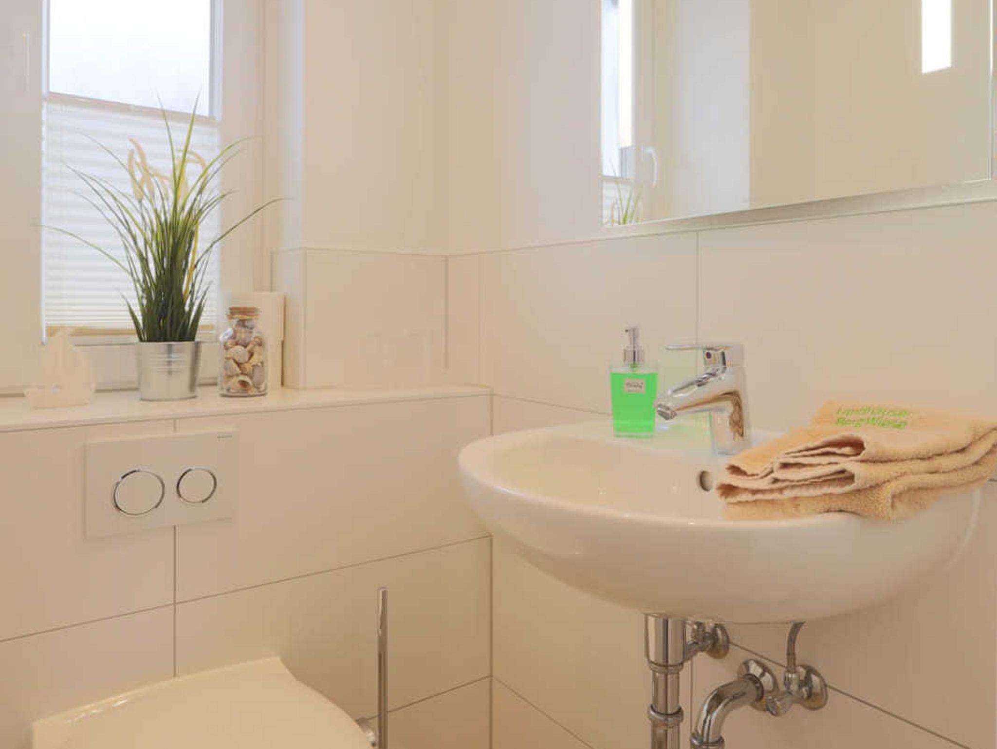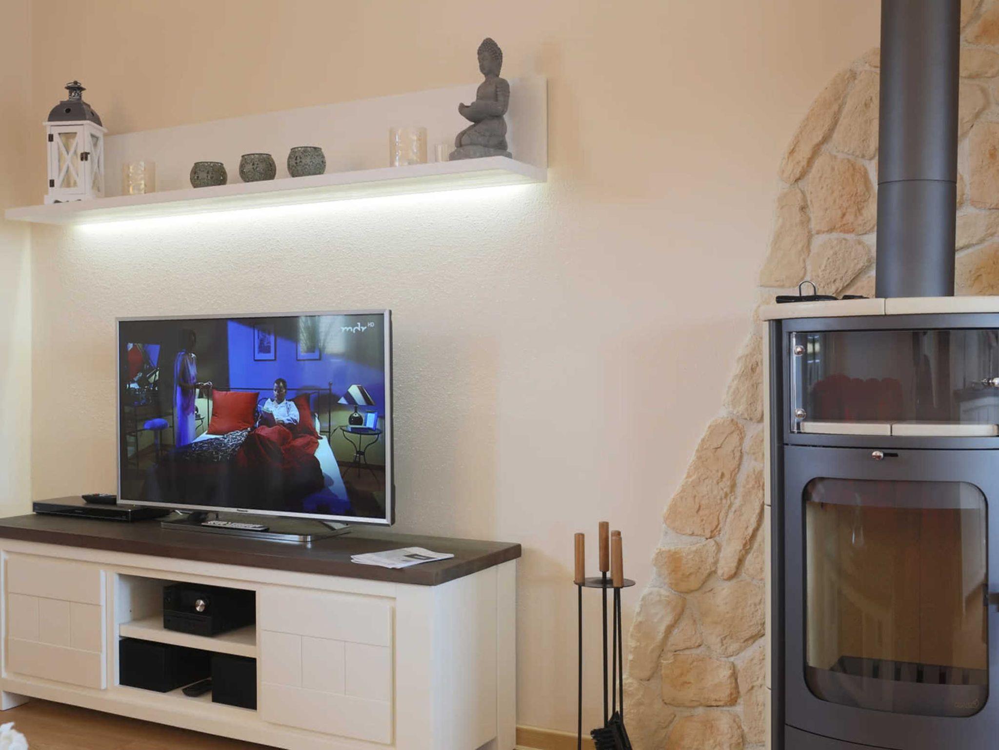 Im Erdgeschoss befindet sich die helle offene Küche, die mit Spülmaschine, Mikrowelle Backofen mit Ceranfeld und einer Kühl- und Gefrierkombination ausgestattet ist. Die offene Küche geht direkt in den mit Kamin und Smart-TV ausgestatteten Wohn- und Essbereich über. Vom Essbereich aus gelangt man auf dem Balkon, der über eine Außentreppe direkt in den Garten führt. Waschmaschine und Wäschetrockner sind auch vorhanden.