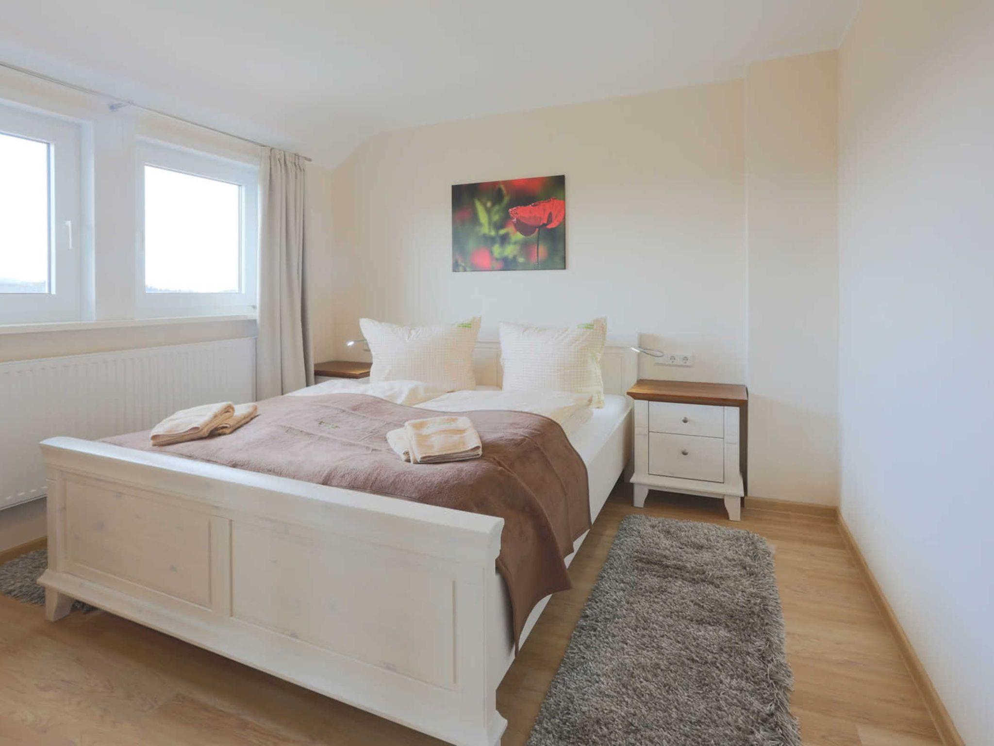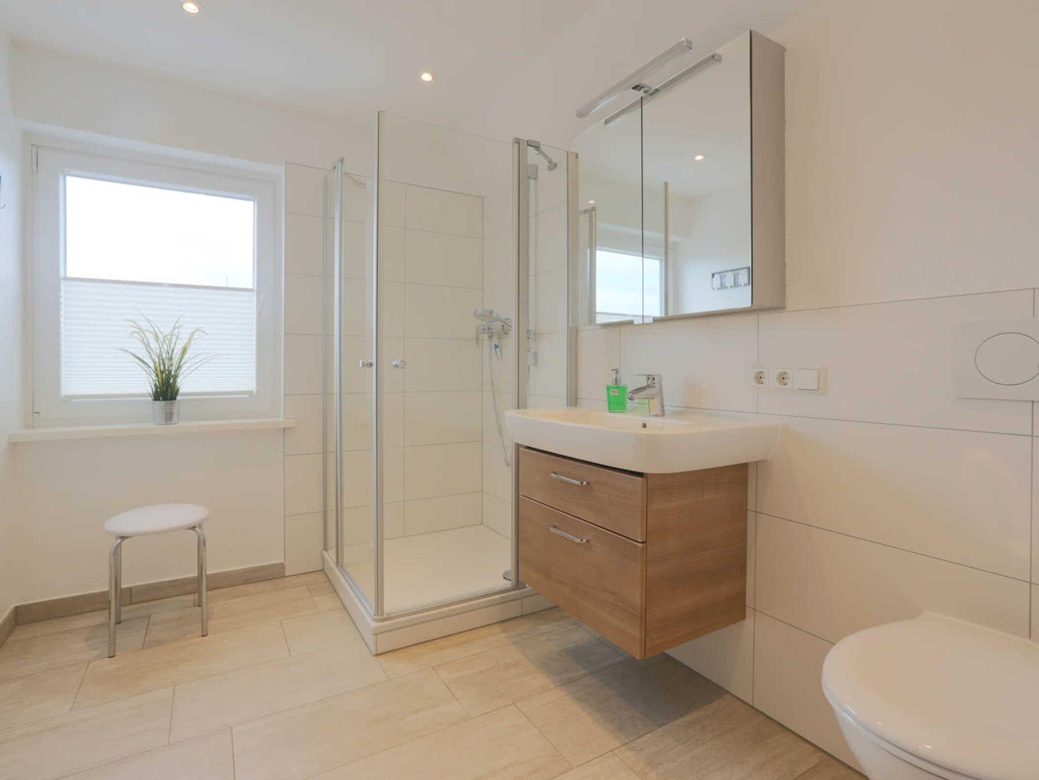 Im Obergeschoss des Ferienhauses befinden sich 2 Schlafzimmer; eins mit Doppelbett, eins mit getrennten Betten, ein Ankleidezimmer mit viel Stauraum sowie ein modernes und helles Duschbad.