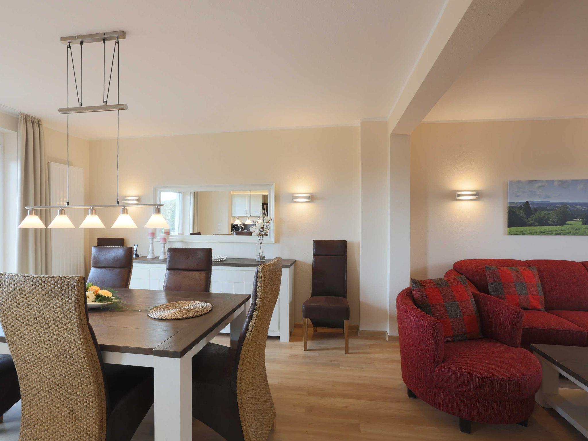 Das Ferienhaus Höhenblick bietet auf 85qm Wohnfläche und 3 Etagen Platz für bis zu 6 Personen. Das Ferienhaus verfügt über einen größzügigen Wohn- und Essbereich mit offener Küche, 3 Schlafzimmer, 2 moderne Duschbäder, ein Gäste-WC und eine Komfortsauna.