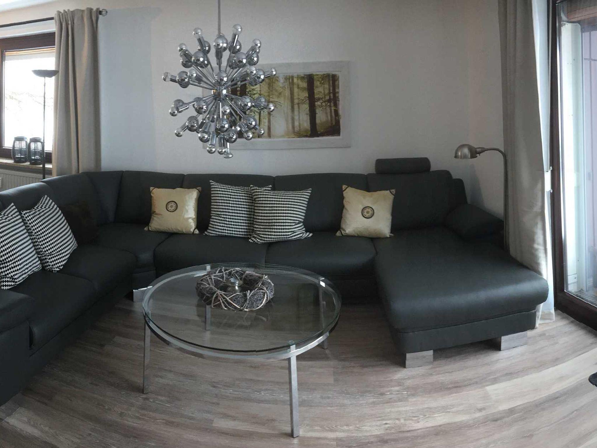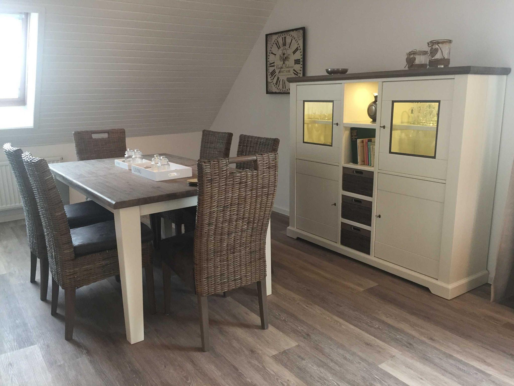 Das große, helle Wohnzimmer vermittelt ein behagliches Wohngefühl. Eine große Sitzecke sowie ein weiteres kleines Sofa, welches gleichzeitig als Schlafsofa dient, laden zum gemütlichen Verweilen ein. Im Wohnzimmer befinden sich ein Flachbild-Fernseher und eine Stereoanlage. An den Wohnbereich grenzt ein gemütlicher Essbereich.