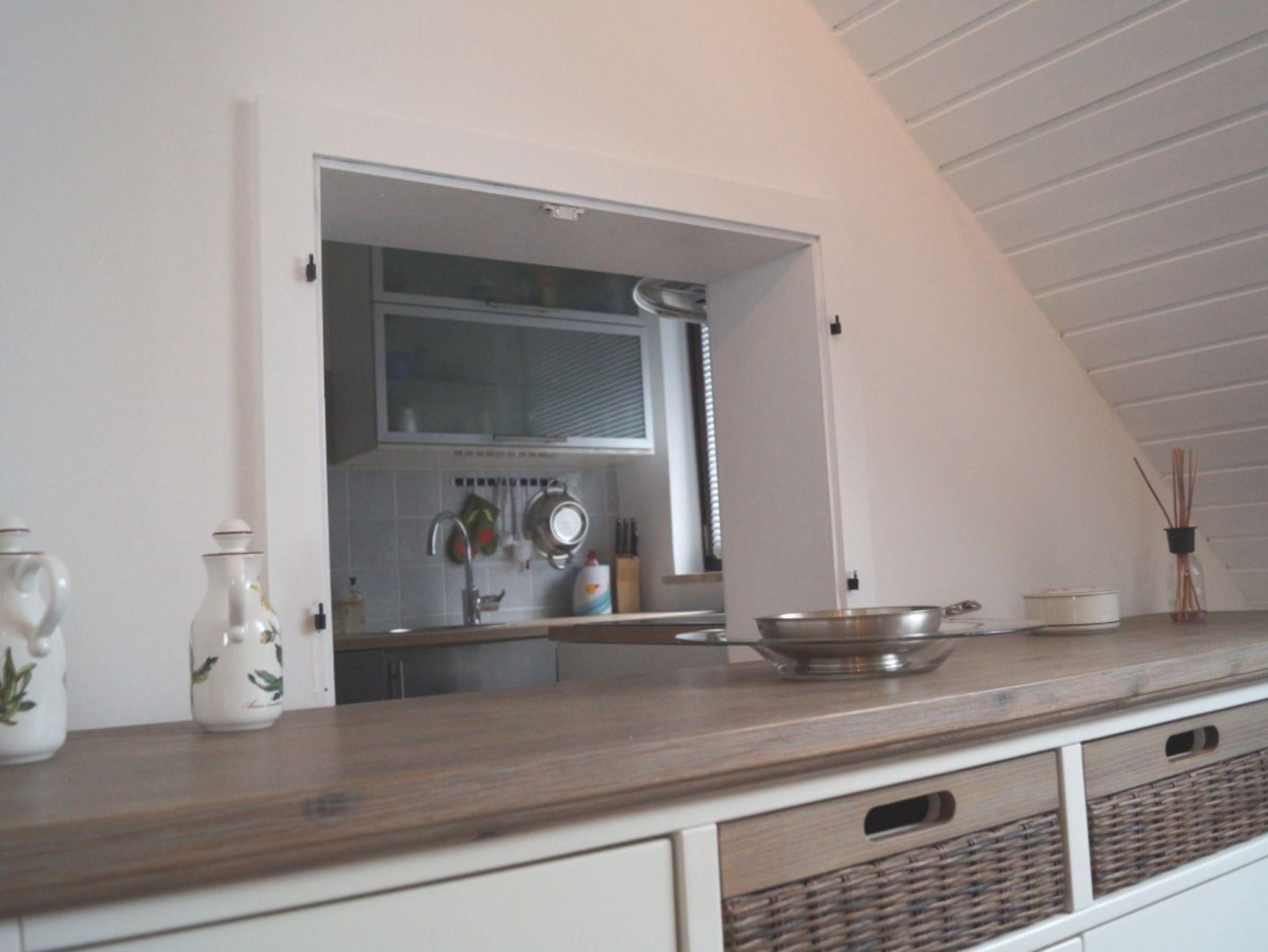 Die Küche ist modern eingerichtet und mit Geschirrspülmaschine ausgestattet. Sie verfügt über eine Durchreiche zum Essbereich.