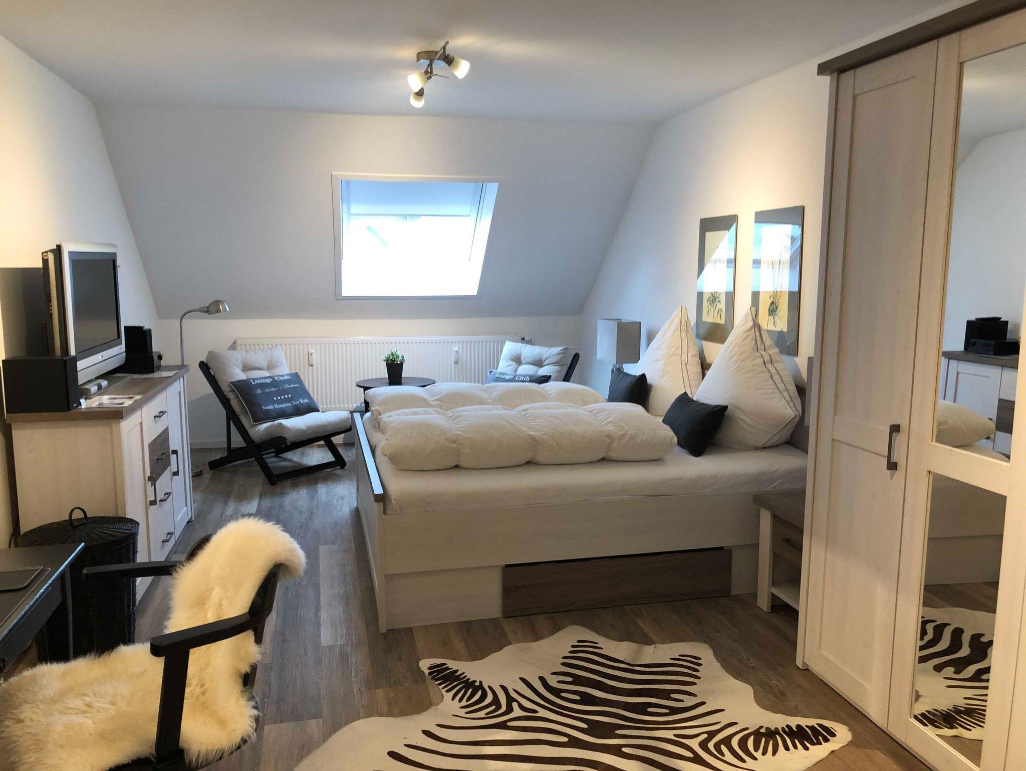 Das großzügige und helle Schlafzimmer ist mit einem Doppelbett, einem großen Kleiderschrank, einem Schreib- und Schminktisch und 2 Sesseln ausgestattet. Außerdem befindet sich im Schlafzimmer ein Flachbild-Fernseher.