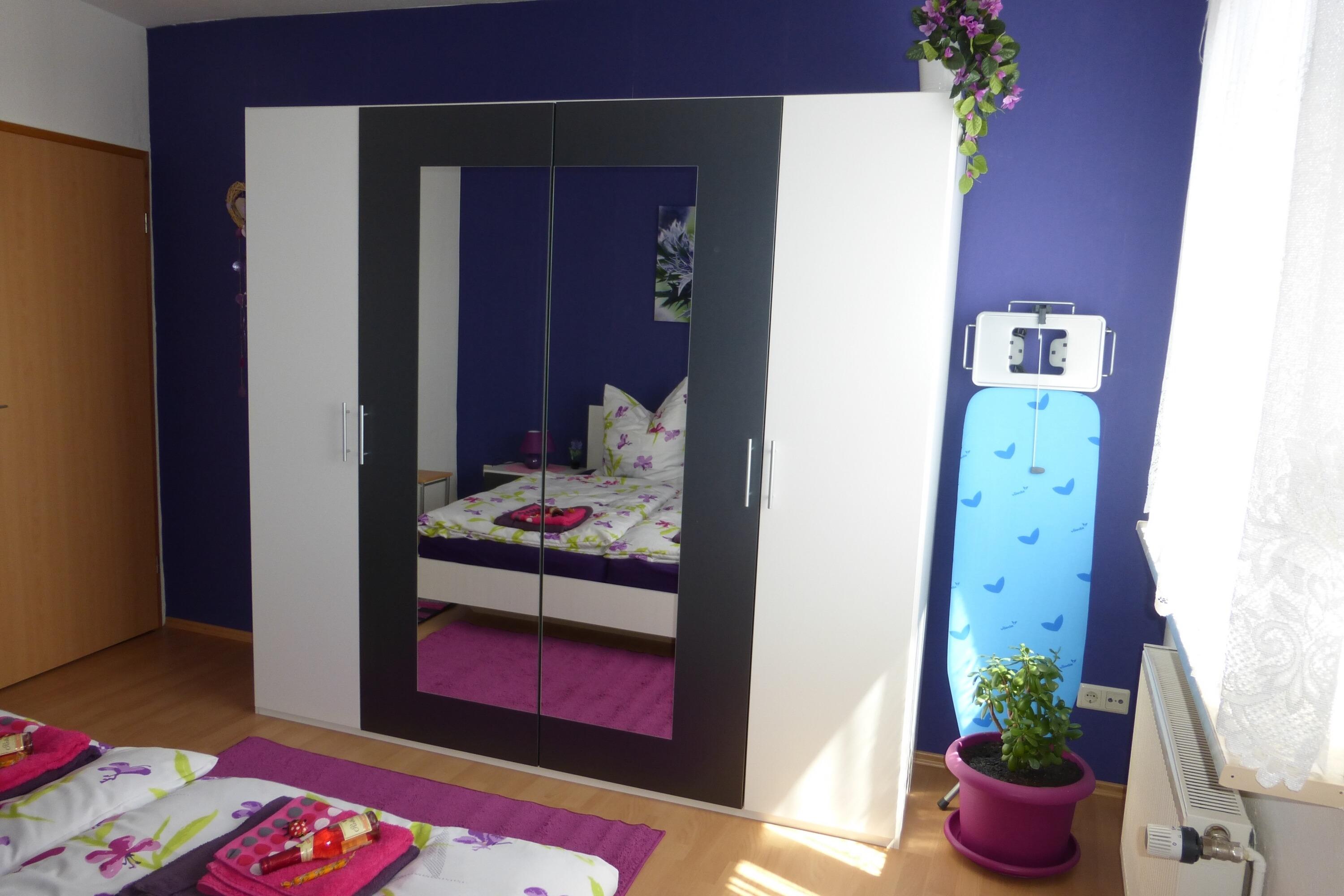 In den beiden Schlafzimmern finden Sie schließlich je ein Doppelbett (180x200 cm). In Schlafzimmer eins haben Sie einen viertürigen Kleiderschrank mit großem Spiegel. Im Schlafzimmer zwei können Sie im Kleinen einmal ausprobieren wie sich ein begehbarer Kleiderschrank anfühlen könnte. Hier haben Sie eine Miniaturausgabe davon. In beiden Schlafzimmern finden Sie auch Herrendiener für die Ablage der Kleidung während der Nacht.