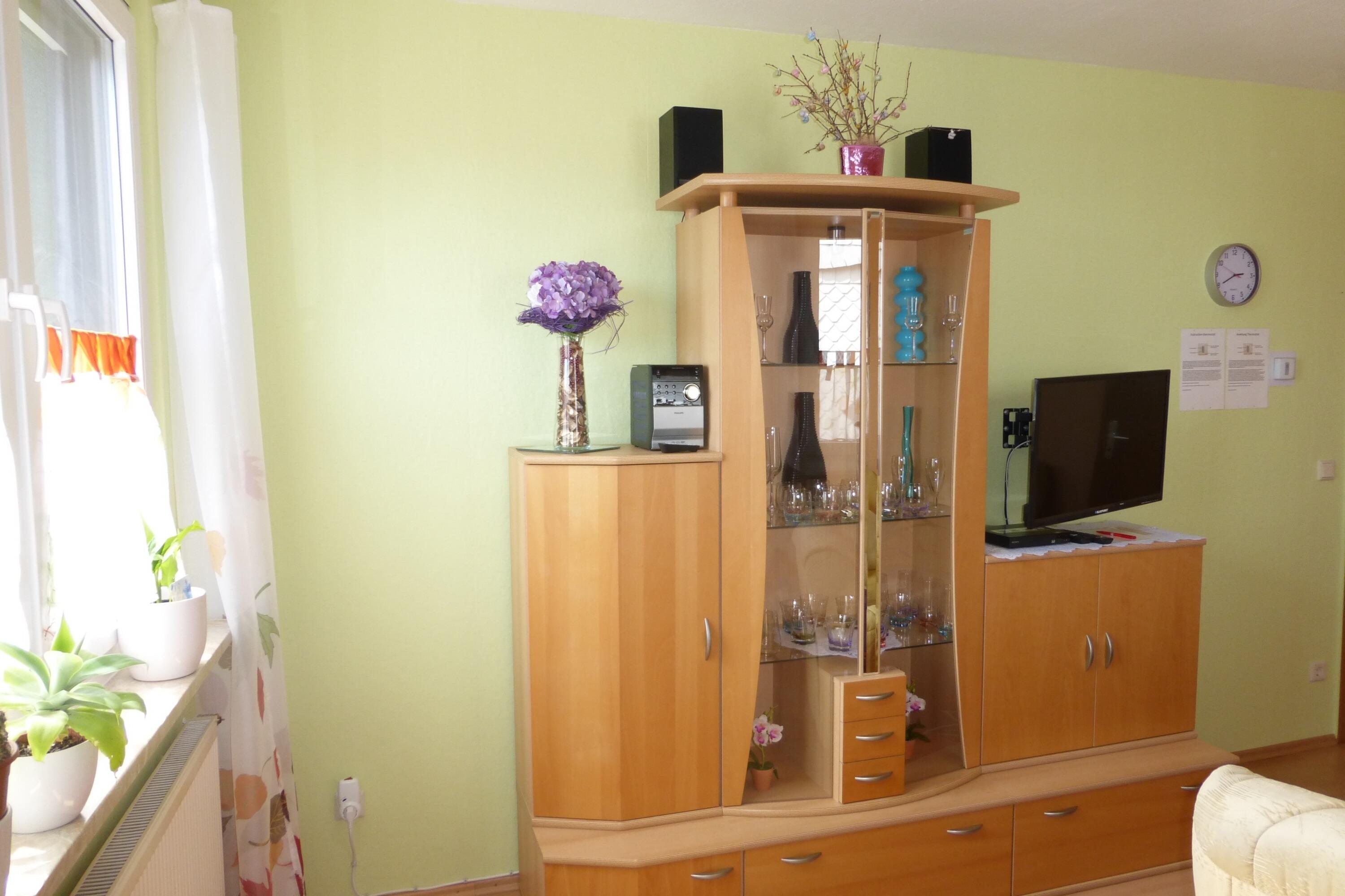 Im Wohnzimmer lädt eine Couch zum Relaxen ein. Hier finden Sie einen Fernseher (SAT), einen DVD-Player (Blu-ray) und auch eine kleine Stereoanlage mit CD, Cassette und USB-Anschluss.