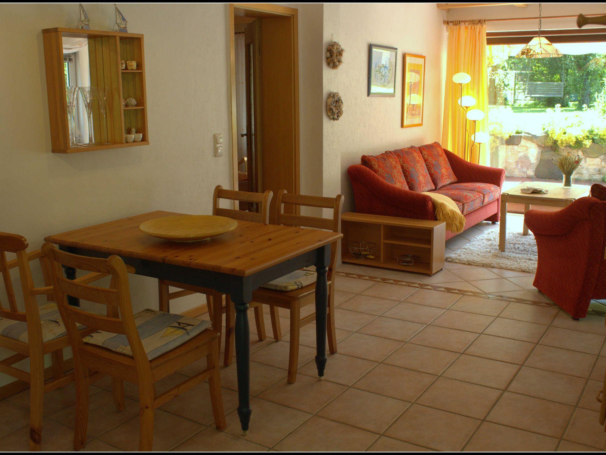 Der ca. 65 m² große Bungalow befindet sich in einem Extrahaus mit separatem Eingang. Die Gäste gelangen ohne Stufen in die Unterkunft, da diese sich im Parterre befindet. Die große Terrasse mit einem überdachten Freisitz lädt zum gemütlichen Beisammensein ein. Der kleine Bungalow besteht aus einem kombinierten Wohn-/Essraum mit Essplatz und Fünfer-Sitzgruppe als Polstergarnitur, Sat-TV, intergierter Küchenzeile mit Ceranfeld/Herd und Mikrowelle. 2 separate Schlafräume mit Elternzimmer mit einem Ehebett und einem Kinderzimmer mit einem Etagenbett. Ein Kinderbett sowie ein Einzelbett für eine erwachsene Person kann je nach Wunsch in einem der Schlafzimmer beigestellt werden.