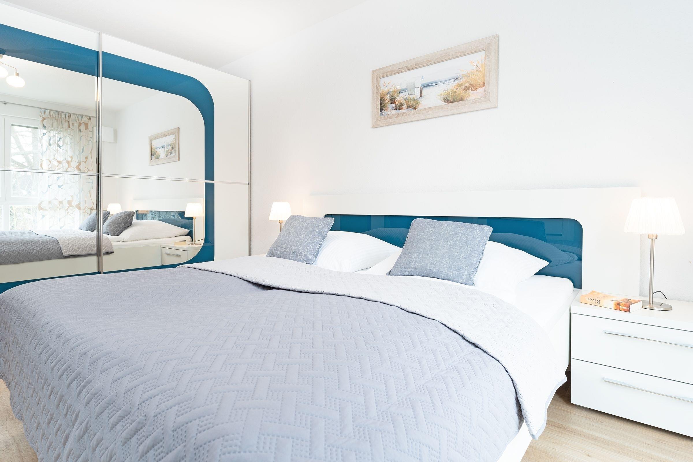 Schlafzimmer: 1 Doppelbett (2x 90x200 cm), Kinderreisebett passt ins Schlafzimmer zwischen Bett und Fenster, Verdunkelung (elektr. Außenrollläden)